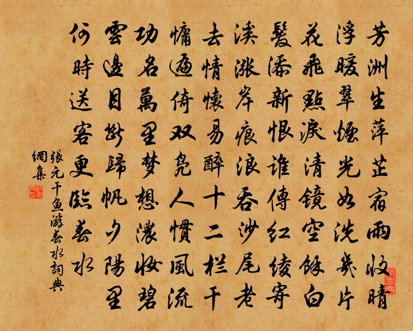 芳洲生萍芷。宿雨收晴浮暖翠。煙光如洗,幾片段預告飛點淚。清鏡空餘白髮添,新恨誰傳紅綾寄。溪漲岸痕,浪吞沙尾。