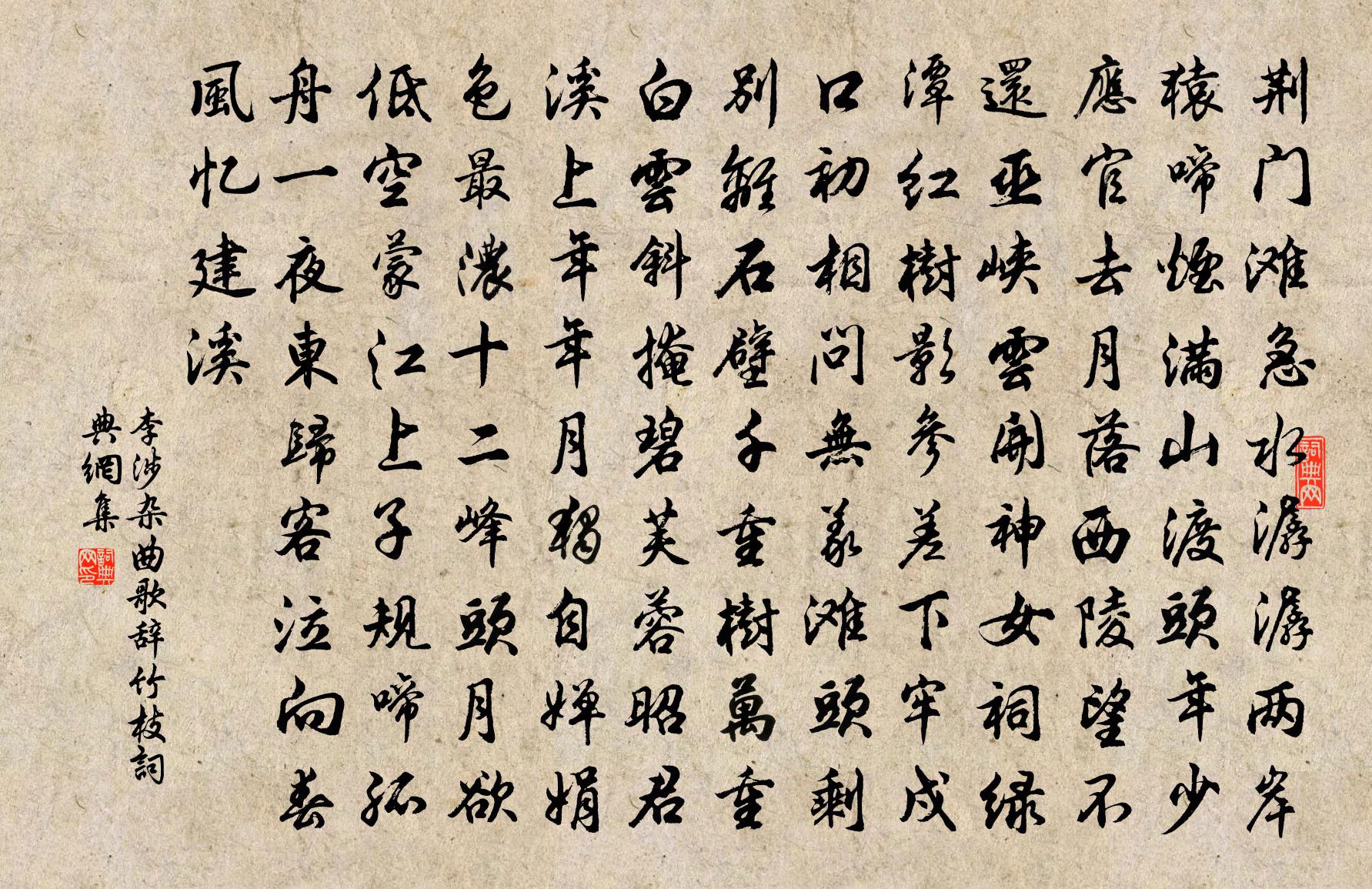 詩詞名句歷史字典書法欣賞書法字典國語詞典說文解字康熙字典古漢語字典標 題 作 者 詩 句 雜曲歌辭。竹枝作者:李涉 朝代:唐代雜曲歌辭。竹枝原文荊門灘急水潺潺,兩岸猿啼煙滿山。渡頭年少應官去,月落西陵望不還。巫峽雲開神女祠,綠潭紅樹影參差。下牢戍口初相問,無義灘頭剩別離。石壁千重樹萬重,白雲斜掩碧芙蓉。昭君溪上年年月,獨自嬋娟色最濃。十二峰頭月欲低,空濛江上子規啼。孤舟一夜東歸客,泣向春風憶建溪。詩詞問答問:雜曲歌辭。竹枝的作者是誰?答:李涉問:雜曲歌辭。竹枝寫於哪個朝代?答:唐代問:雜曲歌辭。竹枝是什麼體裁?答:樂府李涉雜曲歌辭。竹枝書法欣賞雜曲歌辭。竹枝書法作品注釋全唐詩:卷28_4詩詞推薦錢塘渡口施肩吾〔唐代〕天塹茫茫連沃焦,秦皇何事不安橋。錢塘渡口無錢納,已失西興兩信潮。折楊柳歌辭二首佚名〔南北朝〕其一遙看孟津河,楊柳郁婆娑。我是虜家兒,不解漢兒歌。其二健兒須快馬,快馬須健兒。蹕跋黃塵下,(蹕-畢放生池產雙蓮陳宓〔宋代〕不作風流時樣妝,月明宮殿舞霓裳。須知並立殷勤意,為祝吾皇聖壽長。三月晦日偶題秦觀〔宋代〕節物相催各自新,痴心兒女挽留春。芳菲歇去何須恨,夏木陰陰正可人。臥治齋盆池楊萬里〔宋代〕舊來菰葉已全衰,旋買新荷帶藕栽。看得荷花作蓮子,可憐時節被花催。滿江紅(鄭園看梅)吳潛〔宋代〕安晚堂前,梅開盡、都無留萼。依舊是、鐵心老子,故情堪托。長恐壽陽脂粉污,肯教摩詰丹青摸。縱沈香、為榭西齋秋日雜書五首方回〔宋代〕閒閒閉園門,默默坐書室。幽幽絕來人,寂寂度長日。苦桃何累累,秋顆壓枝密。桃苦不可食,熟爛未忍摘。時聞偈頌十八首釋道璨〔宋代〕臨濟四料揀,洞山四賓主。甜瓜徹蒂甜,苦瓠連根苦。倒腹說向人,恰似杏花枝上雨。小重山(次韻劉左史光祖和三月十八日詞見貽生日)魏了翁〔宋代〕開漢江山落手中。滿門花粲闌,錦蒙戎。與人和氣樂融融。應憐我,留滯劍南東。風味兩文忠。恍如疇昔夜,一尊湖州歌九十八首 其五十一汪元量〔宋代〕邵伯津頭閘未開,山城鼓角不勝哀。一川霞錦供行客,且掬荷香進酒杯。金明池游梅堯臣〔宋代〕三月花天池上,花都人袨服花多。水明花搖碧玉,岸響集靈鼉。畫舸龍延尾,長橋霓飲波。苑光花粲粲,女齒笑瑳屏居北郊自秋涉冬絕省人事觸緒有感吒之諷吟程公許〔宋代〕斷橋梗得泊,高堂擁圖書。中宵風露氣,營我方寸軀。靜慮何易感,有銜莫能祛。今古一瞬息,智愚等丘墟。戰奪法曲獻仙音·聚景亭梅次草窗韻王沂孫〔宋代〕層綠峨峨,纖瓊皎皎,倒壓波痕清淺。過眼年華,動人幽意,相逢幾番春換。記喚酒尋芳處,盈盈褪妝晚。已銷黯送蒲元禮南歸黃庭堅〔宋代〕元禮佳少年,俊氣欲無敵。文章詩最豪,溟漲助筆力。三年葉公城,於我固多益。恨無荊雞材,使君有羽翼。此行菩提寺羅公升〔宋代〕一畝方池幾劫灰,哭聲未了笑聲催。六橋煙橋相逢處,半是菩提拭淚來。城上亭二首孔武仲〔宋代〕更無人跡逐攀躋,廬岳烏藤手自攜。滄海誰論六月息,茂林今得一枝棲。幽芳滿徑春難老,翠樾連雲日易西。況有次韻吳僧魁一山十絕方回〔宋代〕已學故學天隱說,多因誤剃鏡中頭。戲拈當日顏良案,兩足何堪踏兩舟。趙伯山寶煉帖贊岳珂〔宋代〕以公姓之麟定,執登壇這牛耳。即信厚以為俊奇,蓋一家之自為體。以道對時,居夷何愧。此鑒堂之所以處己,而寄賦慈谿沈氏愛菊序陳著〔宋代〕我不識愛菊,卻與菊相識。寒前後著花,土中央為色。微苦養長壽,晚香擅清德。滔滔彼世人,方為桃李役。和祝季通韻王炎〔宋代〕踏破蒼苔馬有聲,百金一諾不寒盟。揮犀議論高流輩,落筆典刑追老成。犯雪方知松節直,截河不變濟流清。論交名句推薦為政不難,不得罪於巨室。孟子《孟子·離婁章句上·第六節》 桑柘影斜春社散,家家扶得醉人歸。王駕《社日》 孤雁不飲啄,飛鳴聲念群。杜甫《孤雁 / 後飛雁》 黃葉仍風雨,青樓自管弦。李商隱《風雨》 責人勿厲,小惠或有大得。來俊臣《羅織經·保身卷第七》 直道相思了無益,未妨惆悵是清狂。李商隱《無題·重幃深下莫愁堂》 善改過者,未禁其事,先明其理袁黃《了凡四訓·改過之法》 金谷園中柳,春來似舞腰。李益《上洛橋》 晚雲都變露,新月初學扇,塞鴻一字來如線。周德清《塞鴻秋·潯陽即景》 義典則弘,文約為美。劉勰《文心雕龍·銘箴》