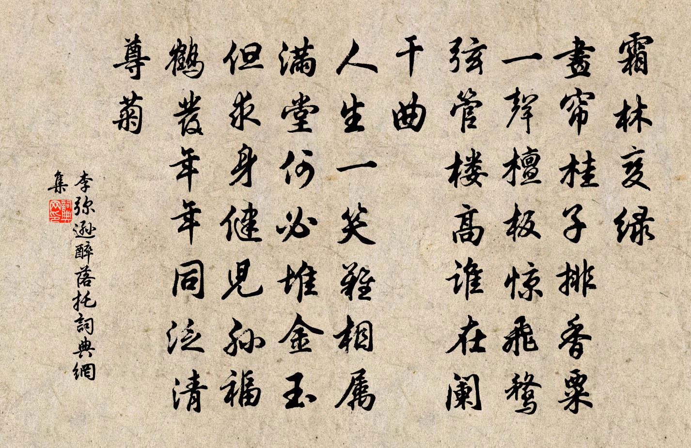 詩詞名句歷史字典書法欣賞書法字典國語詞典說文解字康熙字典古漢語字典標 題 作 者 詩 句 醉落托作者:李彌遜 朝代:宋代醉落托原文霜林變綠。畫簾桂子排香粟。一聲檀板驚飛鶩。弦管樓高,誰在闌乾曲。人生一笑難相屬。滿堂何必堆金玉。但求身健兒孫福。鶴髮年年,同泛清尊菊。詩詞問答問:醉落托的作者是誰?答:李彌遜問:醉落托寫於哪個朝代?答:宋代問:醉落托是什麼體裁?答:詞李彌遜醉落托書法欣賞醉落托書法作品詩詞推薦詠舞詩蕭衍〔南北朝〕腕弱復低舉。身輕由回縱。可謂寫自歡。方與心期共。扇子詩李石〔宋代〕涪上拾遺今日,泉聲一炷青雲。會道傷春作別,世間惟有司勛。洪城沈運乾新園三首程公許〔宋代〕柏梢結翠斗尖新,未問花枝插寶瓶。最好狻猊對雛鳳,向人翔躍似天成。石橋歌張伯端〔宋代〕吾家本住石橋北,山鎮水關森古木。橋下澗水徹崑崙,山下有泉香馥郁。吾居山內實堪夸,遍地均栽不謝花。山北金峰寺陳自新〔宋代〕金峰寺外望藍橋,只尺溪山路許遙。世事昏人心似醉,倚欄無計遺愁消。初冬月夜得皇甫澤州手札並詩數篇因遣報書偶白居易〔唐代〕清泠玉韻兩三章,落泊銀鉤七八行。心逐報書懸雁足,夢尋來路繞羊腸。水南地空多明月,山北天寒足早霜。[履虞美人令/虞美人李廌〔宋代〕玉闌乾外清江浦。渺渺天涯雨。好風如扇雨如簾。時見岸花汀草、漲痕添。青林枕上關山路。臥想乘鸞處。碧蕪千奉使契丹二十八首其五絕句二首之一蘇轍〔宋代〕亂山環合疑無路,小徑縈迴長傍溪。仿佛夢中尋蜀道,興州東谷鳳州西。武夷歌白玉蟾〔宋代〕天下武夷兮第一山溪,升真有洞兮大王天柱交相齊。不知何年中秋兮玉帝賜宴會曾孫,幔亭結雲霞兮彩橋跨虹霓。靈岩禪寺蔣允中〔宋代〕曉入靈岩寺,靈蹤一一穿。天聰鑿混沌,龍鼻滴潺湲。不雨山長濕,微風谷競喧。參旗開障日,鰲柱仰擎天。雁異送吉水包長官翁卷〔宋代〕不恥身為令,惟存濟物心。離家春雨足,入境夏苗深。吉字水初識,洞岩仙可尋。知君修淨化,白日只彈琴。和沈帥持要張漕季長韻二首陳傅良〔宋代〕麾節元戎祖席光,晚風吹雨借初涼。師傳問訊誰書院,石刻摩挲是道鄉。聞有先聲來召馹,想無後會到流觴。路朝答建士謝旿二首劉克莊〔宋代〕偶有幽人訪,柴門始一開。大顛留偈去,小謝袖詩來。襆被嫌三宿,挑燈讀百回。惟應雙屐齒,歷歷在莓苔。句吳沆〔宋代〕為兵不願作刀鋸,刑人未必皆不忠。為器不願作鐘鼎,銘勛未為皆有功。進德陸游〔宋代〕進德工夫在日新,正如更歷自知津。迷時誤認毒為藥,定後始知天勝人。四壁不妨身落魄,萬夫誰敵膽輪囷?遺經歲寒雜詠錢時〔宋代〕一把寒茅四柱亭,客來只道省經營。雖然受用無花巧,五十餘年造得成。已酉上元後贈劉子才楊萬里〔宋代〕書台城西幽絕處,古木排霄草荒路。空齋深夜四無人,維予二人聽春雨。我如病鶴子茁蘭,長幼不同同少年。聞子中秋與諸子果飲楊萬里〔宋代〕幾年今夕一番逢,千古何人此興同?酒入銀河波底月,笛吹玉桂樹梢風。莫言秋色無多巧,淨洗清光也費工。老子秋感晁說之〔宋代〕又作此秋飄泊客,茫茫誰是北歸人。庭前雨過鵝群浴,池上風來螢火新。戰馬不肥淮甸草,屬車思輾洛陽塵。如聞春暮高遁翁〔宋代〕石橋門外送斜暉,柳灑清風透客衣。老眼看花能有幾,如何啼鳥暮春歸。名句推薦纖雲弄巧,飛星傳恨,銀漢迢迢暗度。秦觀《鵲橋仙·纖雲弄巧》 千載琵琶作胡語,分明怨恨曲中論。杜甫《詠懷古蹟五首·其三》 戍客望邊邑,思歸多苦顏。李白《關山月》 重岡已隔紅塵斷,村落更年豐。元好問《人月圓·重岡已隔紅塵斷》 蛾眉淡了教誰畫?瘦岩岩羞戴石榴花。關漢卿《大德歌·夏》 情似遊絲,人如飛絮。淚珠閣定空相覷。周紫芝《踏莎行·情似遊絲》 終古閒情歸落照,一春幽夢逐遊絲。納蘭性德《浣溪沙·楊柳千條送馬蹄》 未信此情難系絆,楊花猶有東風管。蘇軾《蝶戀花·蝶懶鶯慵春過半》 青天有月來幾時?我今停杯一問之。李白《把酒問月·故人賈淳令予問之》 若順吾皇意,即無臣子心。棲蟾《送遷客》