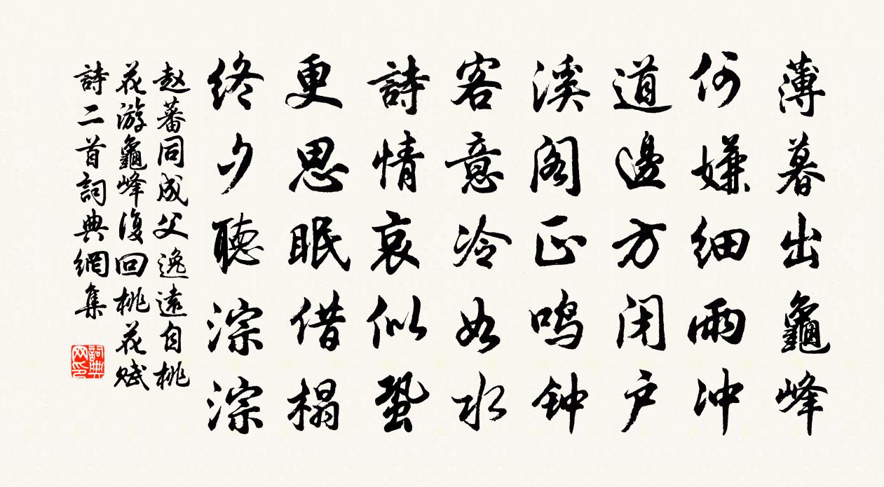 詩詞名句歷史字典書法欣賞書法字典國語詞典說文解字康熙字典古漢語字典標 題 作 者 詩 句 同成父逸遠自桃花游龜峰復回桃花賦詩二首作者:趙蕃 朝代:宋代原文薄暮出龜峰,何嫌細雨沖。道邊方閉戶,溪閣正鳴鐘。客意冷如水,詩情哀似蛩。更思眠借榻,終夕聽淙淙。詩詞問答問:《同成父逸遠自桃花游龜峰復回桃花賦詩二首》的作者是誰?答:趙蕃問:該詩寫於哪個朝代?答:宋代書法欣賞同成父逸遠自桃花游龜峰復回桃花賦詩二首書法作品詩詞推薦浣溪沙李元膺〔宋代〕飲散蘭堂月未中。驊騮嬌簇絳紗籠。玳簪促坐客從容。已醉人間千日酒,賜來天上密雲龍。蓬仙清興欲乘風。沿檄柯山歸別張特秀樓鑰〔宋代〕我昔志學年,侍親宦西安。弟兄游庠校,見君平生歡。君才獨穎出,逸駕不可攀。夜窗共檠燈,春遊合杯盤。虛堂好事近(和人題渭川釣漁圖韻)呂勝己〔宋代〕風景好樵川,郭外三洲煙渚。過盡古今清逸,奈天公不與。地靈人意會符同,留待煙霞侶。一棹輕舟開岸,弄灘聲已亥雜詩 184龔自珍〔清代〕小樓青對鳳凰山,山影低徊黛影間。今日當窗一奩鏡,空王來證鬢絲班。接筍峰邱攀桂〔宋代〕天下名山說武夷,高峰晴樹碧雲齊。望窮石鼎疑無地,行到山根卻有梯。茅屋成村多卜隱,草書懸壁半留題。幾時頌釋印肅〔宋代〕一心圓持種種心,信心諸境絕追尋。此中無分應難到,便好回光免陸沉。蝶戀花王采〔宋代〕鏤雪成花檀作蕊。愛伴鞦韆,搖曳東風裡。翠袖年年寒食淚。為伊牽惹愁無際。幽艷偏宜春雨細。紅粉闌乾,有個越州歌二十首汪元量〔宋代〕昨夢吳山閬苑開,風吹仙樂下瑤台。翠圍紅陣知多少,半揭珠簾看駕來。梁潔夫幽居林宇靚深畫幽邃不類貴第宛然山林曹勛〔宋代〕西疇築圃弭橐鞬,矍相佳游此比肩。自是序賓觀德處,固宜百發上虛弦。諸暨道中五首葛紹體〔宋代〕曉煙晴日過楓橋,橋面山尖春半嬌。一簇誰家嫩楊柳,淡黃襟帶學宮腰。感興鄧林〔宋代〕竹帛功名九折車,棲遲岩野竟何如。浣花溪上尋佳句,積穀山頭讀異書。江左風流空醖藉,淮南煙景尚凋疏。太平大衍易吟四十首方回〔宋代〕屯初康險難,蒙上覺昏童。開闢乾坤後,君師大有功。遷江紀實秦密〔宋代〕廣右開炎服,思剛置縣衙。羈縻唐世及,正朔聖朝加。鄉分今賀水,邑隸古瑯琊。泉脈通明鏡,封鄰接鏌鋣。清平樂(六)(《花間集》失收此首)韋莊〔唐代〕瑣窗春暮,滿地梨花香。君不歸來晴又去,紅淚散沾金縷。夢魂飛斷煙波,傷心不奈春何!空把金針獨坐,鴛鴦愁南山亭吟梅用韻趙必象〔宋代〕玉輦瑤車具,飄飄銀台路。群姬擁蓋羽,太真衣縞素。夜宴瓊花圃,玉郎騎鶴赴。翠衣凍欲仆,芳信誰傳付。無夢畫蟬戴叔倫〔唐代〕飲露身何潔,吟風韻更長。斜陽千萬樹,無處避螳螂。偈六十九首釋道寧〔宋代〕數聲歸笛離春浦,一片孤帆過洞津。到岸舍舟常式事,何須更問渡頭人。賀新郎(癸亥九日)劉克莊〔宋代〕宿雨輕飄灑。少年時、追歡記節,同人於野。老去登臨無腳力,徙倚屋東籬榭。但極目、海山如畫。千古惟傳吹帽武康邑中劉王廟董嗣杲〔宋代〕水圍聚落藹藤纏,靈紀金刀祀典專。碑語誰非年月誤,神功自托道途傳。三鄉捐廩祈多福,百里齋香卜有年。爭怪水調歌頭(壽何帥)佚名〔宋代〕某伏以天佑皇朝,龍虎葉千齡之運;時生人傑,麒麟開六月之祥。垂弧在辰,屬部胥慶。共惟某官德鍾清粹,氣備名句推薦長風萬里送秋雁,對此可以酣高樓。李白《宣州謝朓樓餞別校書叔雲 / 陪侍御叔華登樓歌》 明年此會知誰健?醉把茱萸仔細看。杜甫《九日藍田崔氏莊》 鋤禾日當午,汗滴禾下土。李紳《古風二首 / 憫農二首》 醉者之墜於車也,雖疾不死。骨節與人同,而犯害與人異,其神全也。列子及其弟子《列子·黃帝》 世間珍果更無加,玉雪肌膚罩絳紗。丘浚《詠荔枝》 夫大寒至,霜雪降,然後知松柏之茂也。劉安及其門客《淮南子·俶真訓》 哀蟬無留響,叢雁鳴雲霄。陶淵明《己酉歲九月九日》 顛沛之揭,枝葉未有害,本實先撥詩經《盪》 才過清明,漸覺傷春暮。李冠《蝶戀花·春暮》 離多最是,東西流水,終解兩相逢。晏幾道《少年游·離多最是》