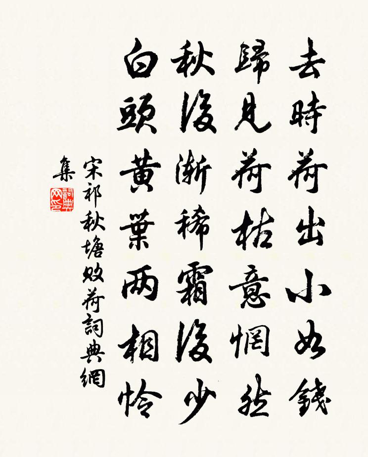 詩詞名句歷史字典書法欣賞書法字典國語詞典說文解字康熙字典古漢語字典標 題 作 者 詩 句 秋塘敗荷作者:宋祁 朝代:宋代秋塘敗荷原文去時荷出小如錢,歸見荷枯意惘然。秋後漸稀霜後少,白頭黃葉兩相憐。詩詞問答問:秋塘敗荷的作者是誰?答:宋祁問:秋塘敗荷寫於哪個朝代?答:宋代問:宋祁的名句有哪些?答:宋祁名句大全宋祁秋塘敗荷書法欣賞秋塘敗荷書法作品詩詞推薦春詞毛滂〔宋代〕冰銷玉液鳧鷖喜,日暖宜春草木長。忠厚家風傳八葉,太平光景接三王。送李願歸盤谷序韓愈〔唐代〕太行之陽有盤谷。盤谷之間,泉甘而土肥,草木叢茂,居民鮮少。或曰:“謂其環兩山之間,故曰‘盤’。”或曰滕王閣黃復之〔宋代〕飛閣岧嶢倚天半,千里秋毫掌中看,城下江聲鐵馬行,梁間日影金蛇竄。詞客寂寥光景閒,秀色不改惟西山。朝來句裴度〔唐代〕兩人同日事征西,今日君先奉紫泥。待平賊壘報天子,莫指仙山示武夫。野人不識中書令,喚作陶家與謝家。君若烏江東鄉往還馬上作二首之二賀鑄〔宋代〕悠悠東去欲何之,草莫西還可是歸。殘日雨竿荒戍遠,青山滿眼故園非。江田經雨菰蔣熟,石路無風蠛蠓飛。回羨頌古十七首釋宗演〔宋代〕相見錦江頭,相攜上酒樓。月闌歌笑罷,回首上扁舟。奉和聖制送張說上集賢學士賜宴(賦得賓字)劉升〔唐代〕圖書應明主,策府宴嘉賓。台曜臨東壁,乾光自北辰。網羅窮象系,述作究天人。聖酒千鍾洽,仙廚百味陳。成山嚴公仲夏枉駕草堂,兼攜酒饌,得寒字杜甫〔唐代〕竹里行廚洗玉盤,花邊立馬簇金鞍。非關使者徵求急,自識將軍禮數寬。百年地辟柴門迥,五月江深草閣寒。看弄宮詞張公庠〔宋代〕後苑宸游炎日長,宮中疆半坐迴廊。鵁鶄鸂鶒銀塘靜,楊柳梧桐水殿香。秋日登南城台陶弼〔宋代〕江國家書少,秋台寒草生。無人來遠渡,盡日上高城。落照懸漁布,孤煙起戍營。東籬故園菊,又向酒中傾。元正書懷程公許〔宋代〕甲子循環六十年,手披新曆意茫然。了知自性覺玄妙,寧與世間寒乾遷。寡過得如蘧瑗花,諾惺要了瑞岩禪。故園九日酬諸子妙信〔清代〕不負東籬約,攜尊過草堂。遠天連樹杪,高月薄衣裳。握手經年別,驚心九日霜。諸君才絕世,獨步許誰強。花心動王哲〔元代〕緊心狷,悟光陰、塵凡百年*速。下手頓修,元本真靈,此日要除骸屋。居家坑塹先須跳,將身已、便令孤宿。靜天寧長老新齋堂請轉語吳潛〔宋代〕慧公幻出一齋堂,巨棟危梁壓十方。更有心堂無量闊,闊中別有好思量。漁家傲朱敦儒〔宋代〕畏暑閒尋湖上徑。雨絲斷送涼成陣。風裡芙蓉斜不整。沈紅影。約回萍葉波心靜。催喚吳姬迎小艇。妝花燭焰明相宛丘作宋祁〔宋代〕宛丘真善地,承詔幸班春。鈴下聽無訟,日邊來有人。吟餘多感客,睡足本慵身。蟣虱休相賀,吾今湯沐頻。九月八日酬皇甫十見贈白居易〔唐代〕君方對酒綴詩章,我正持齋坐道場。處處追游雖不去,時時吟詠亦無妨。霜蓬舊鬢三分白,露菊新花一半黃。惆悵又和二月五日風雪司馬光〔宋代〕春風正豪怒,夜雪復飄揚。勿使羈愁亂,自知清興長。簾疏聲淅瀝,燈冷暈微茫。此夕牛衣客,成名不可忘。夔州試院呈諸公冉居常〔宋代〕他年蟲篆老書生,謬向文闈預領衡。敢道靈鰲嗟贔贔,只愁窪馬賦崢嶸。舊傳錦樣心雖愧,新揀沙金眼自明。收拾巫山一段雲(五之二·雙調)柳永〔宋代〕琪樹羅三殿,金龍抱九關。上清真籍總群仙。朝拜五雲間。昨夜紫微詔下。急喚天書使者。令齎瑤檢降彤霞。重到名句推薦危橋屬幽徑,繚繞穿疏林。柳宗元《巽公院五詠·苦竹橋》 夜戰桑乾北,秦兵半不歸。許渾《塞下曲》 從此信音稀,嶺南無雁飛。李師中《菩薩蠻·子規啼破城樓月》 催促年光,舊來流水知何處。廖世美《燭影搖紅·題安陸浮雲樓》 天行有常,不為堯存,不為桀亡。應之以治則吉,應之以亂則凶。荀子《荀子·天論》 猶憐慣去國,疑是夢還家。盧僎《歲晚還京台望城闕成口號先贈交親》 酒已都醒,如何消夜永!周邦彥《關河令·秋陰時晴漸向暝》 憶昔花間相見後,只憑縴手,暗拋紅豆。歐陽炯《賀明朝·憶昔花間相見後》 大漠沙如雪,燕山月似鉤。李賀《馬詩二十三首·其五》 欲祭疑君在,天涯哭此時。張籍《沒蕃故人》