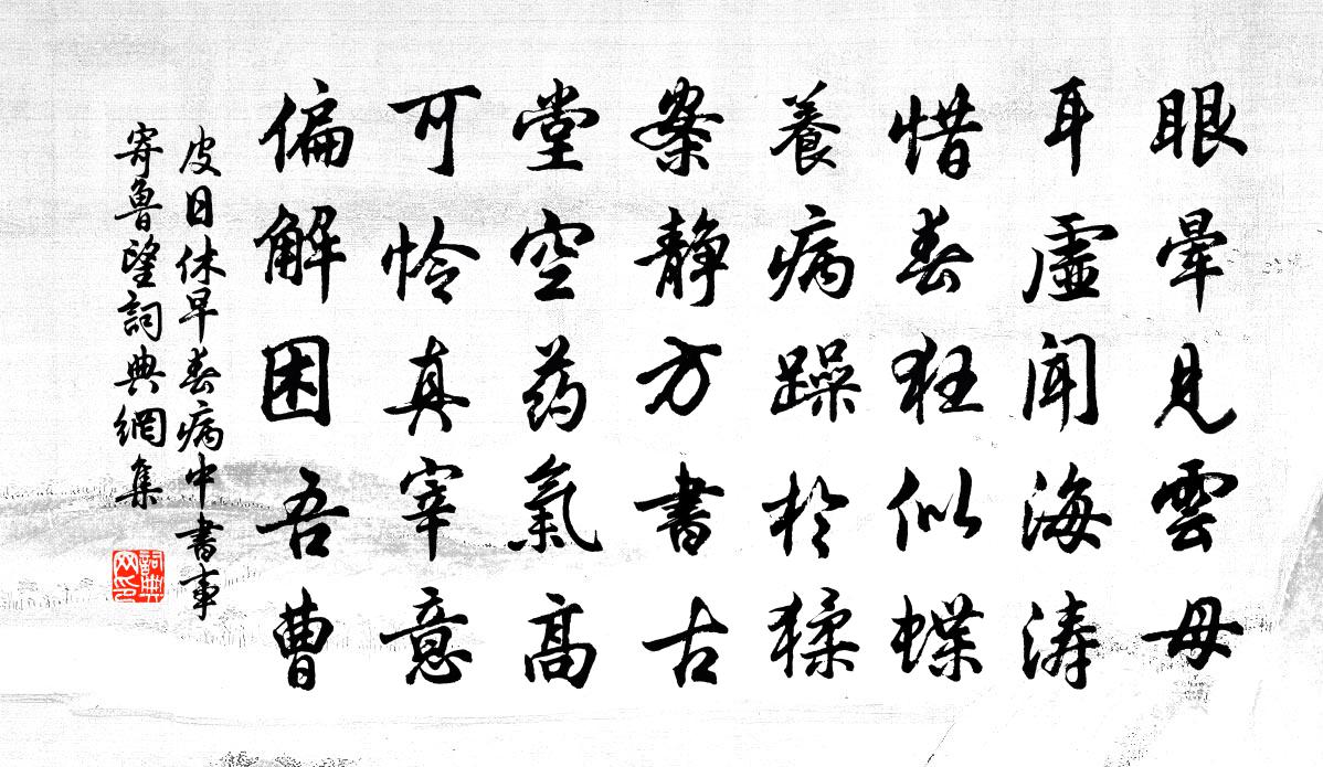 詩詞名句歷史字典書法欣賞書法字典國語詞典說文解字康熙字典古漢語字典標 題 作 者 詩 句 早春病中書事寄魯望作者:皮日休 朝代:唐代早春病中書事寄魯望原文眼暈見雲母,耳虛聞海濤。惜春狂似蝶,養病躁於猱。案靜方書古,堂空藥氣高。可憐真宰意,偏解困吾曹。詩詞問答問:早春病中書事寄魯望的作者是誰?答:皮日休問:早春病中書事寄魯望寫於哪個朝代?答:唐代問:早春病中書事寄魯望是什麼體裁?答:五律皮日休早春病中書事寄魯望書法欣賞早春病中書事寄魯望書法作品注釋全唐詩:卷612-15詩詞推薦懷方嚴州仇遠〔宋代〕八十一年前,科名已褎然。依劉王粲檄,入洛賀循船。受禪碑誰上,閒情賦自傳。江山英氣歇,堪恨亦堪憐。頌古一百則釋正覺〔宋代〕孤迥迥,圓陀陀,眼力盡處高峩峩。月落潭空夜色重,雲收山瘦秋容多。八封位正,五行氣和,身先在里見來麽。山林釋文珦〔宋代〕塵世有衰榮,山林何損益。一身常晏如,於以養精魄。渴則飲清泉,飢則煮白石。自愛同閒雲,散誕無留跡。用明發不寐有懷二人為韻寄李秉彝德叟黃庭堅〔宋代〕在昔授子書,髧彼垂兩發。乖離今十年,樹立映先達。青燈喔妙句,如酌春酒滑。把書念攜手,惆悵至明發。對酒寄嚴維劉長卿〔唐代〕陋巷喜陽和,衰顏對酒歌。懶從華發亂,閒任白雲多。郡簡容垂釣,家貧學弄梭。門前七里瀨,早晚子陵過。示同志劉克莊〔宋代〕旋入洛中新保社,稍增汾曲舊田廬。市朝倖免髠鉗我,尸祝何煩俎豆予。靜看芭蕉身不實,健忘椰子腹無書。故人書枕屏陸游〔宋代〕心若冰將釋,貌如兒未孩。青城上官叟,時入夢中來。過璨師房宋庠〔宋代〕病客塵纓外,幽齋法境中。庭喧施鳥食,坐拂去花風。茗溜沈甌綠,檀煙入篆紅。忘言一相對,何處妄求空。禪人並化主寫真求贊釋正覺〔宋代〕山林眉目,水月身心。雪何早而古岩棱,秋似先而寒潭深。機頭綿緒,線尾金針。誰雲道大兮自有知音。神靜氣清春雪王之道〔宋代〕一夜春寒夢寐清,柳梢梅萼頗關情。山川千里玉為路,樓觀半天雲滿城。徑醉已從釃酒去,稍晴當辦出郊行。東君再和題黃免耕吟藁許月卿〔宋代〕免耕遺藁九京幽,宿諾吾方負仲田。宿諾斜陽悲宿草,沉思一旦落沉浮。池生春草虛堂夢,楓落吳江何處舟。有子題扇面万俟紹之〔宋代〕起晚慵妝立小樓,杜鵑聲里萬紅休。儂愁未逐春酲解,飛盡楊花不舉頭。道中有感周弼〔宋代〕遠程已過經行初,別有逶迤古道存。寺有寂廖猶有殿,水才窮盡又逢村。一竹枯木人分路,十里飛花客過門。必竟郊廟歌辭。享太廟樂章。雍和魏徵〔唐代〕崇茲享祀,誠敬兼至。樂以感靈,禮以昭事。粢盛鹹絜,牲牷孔備。永言孝思,庶幾不匱。次韻賓暘齋中獨坐五首方回〔宋代〕蟻潰金隄薄俗頹,聖門誰與嗣雲來。良難托諷追風雅,只可微辭紀定哀。有志向能穿虎石,無疑今始悟蛇杯。掀天入省陸游〔宋代〕點點輕花墮綠槐,翩翩羸馬犯黃埃。眼邊好句等閒過,夢裡故人時一來。玉塞請行狂故在,霜髭自照老相催。今朝南山羅漢贊十六首黃庭堅〔宋代〕萬山相倚碧漓岏,靈鷲一峰聖賢宅。如來往昔經行處,林泉鳥獸皆逆向。清淨眷屬千五百,無日不聞鐘磬音。閻浮宮詞王仲修〔宋代〕玉蘭萬朵牡丹開,先摘姚黃獻御杯。翠幕重重圍繞定,料應蜂蝶不曾來。龍首山錢熙〔宋代〕殘年仍置閏,五日恰逢春。攜酒客獨嘗,敲門僧不嗔。雙松如拱立,萬井自橫陳。精舍故盤礴,元規塵上人。次韻塞下曲楊公遠〔宋代〕貂裘氈帽紫驊騮,挾彈彎弧架鐵矛。飛放歸來天欲暮,數聲羌笛起高樓。名句推薦日月忽其不淹兮,春與秋其代序。屈原《離騷》 春日宴,綠酒一杯歌一遍。馮延巳《長命女·春日宴》 朱門酒肉臭,路有凍死骨。杜甫《自京赴奉先縣詠懷五百字 / 自京赴奉先詠懷五百字》 更無花態度,全有雪精神。辛棄疾《臨江仙·探梅》 錦瑟華年誰與度?賀鑄《青玉案·凌波不過橫塘路》 謂女子,先生為姊,後生為妹。佚名《爾雅·釋親》 浴不必江海,要之去垢;馬不必騏驥,要之善走。司馬遷《史記·外戚世家》 黃鸝驚夢破,青鳥喚春還。張弘范《臨江仙·憶舊》 桂花浮玉,正月滿天街,夜涼如洗。文徵明《念奴嬌·中秋對月》 坑灰未冷山東亂,劉項原來不讀書。章碣《焚書坑》