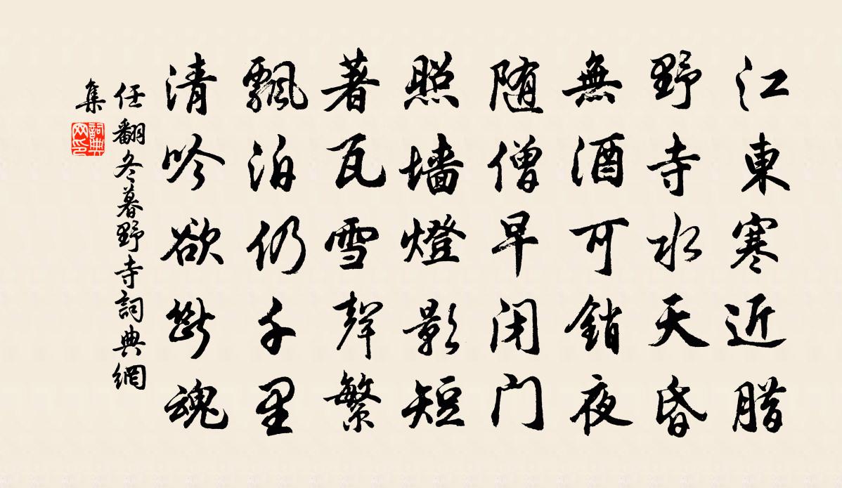詩詞名句歷史字典書法欣賞書法字典國語詞典說文解字康熙字典古漢語字典標 題 作 者 詩 句 冬暮野寺作者:任翻 朝代:唐代冬暮野寺原文江東寒近臘,野寺水天昏。無酒可銷夜,隨僧早閉門。照牆燈影短,著瓦雪聲繁。飄泊仍千里,清吟欲斷魂。詩詞問答問:冬暮野寺的作者是誰?答:任翻問:冬暮野寺寫於哪個朝代?答:唐代問:冬暮野寺是什麼體裁?答:五律任翻冬暮野寺書法欣賞冬暮野寺書法作品注釋全唐詩:卷727-34詩詞推薦題甘茂祠李復〔宋代〕奮身孤旅相秦王,欲去憂讒倫樂羊。不有私金助心賞,可能明日拔宜陽。招魂周文璞〔宋代〕天孫召魂,鬼伯催促,千歲之淵不為谷。巉岩既刊,松柏桓桓。曰惟君之魂,於茲考槃。其永安君窆初成,余以歸念奴嬌劉子實〔宋代〕一門相種,剩河英岳粹,共扶昌錄。夾輔正宜資魯衛,左右秉持鈞軸。緩駕輕車,任回虎節,何事勞山國。東民欲驀山溪姬翼〔元代〕從來習性,塵冗知多少。省後急消磨,動靜里、專專計較。閒非閒是,不掛一絲頭,牢閉口,緊降心,人我先除掃長思仙侯善淵〔元代〕道無邊。性光圓。認得龜蛇兩下纏。陰陽合地天。汞和鉛。氣神全。光迸流霞耀晃然。方知玄又玄。田家建除體洪咨夔〔宋代〕建鼓勸竭作,除田綠紛披。滿築沮澤岸,平流綺堘陂。定約欲水均,執熱願雨隨。破柱雷電合,危檐溜紳垂。成功再經胡城縣杜荀鶴〔唐代〕去歲曾經此縣城,縣民無口不冤聲。新來縣宰加朱紱,便是生靈血染成。行路難孟雲卿〔唐代〕君不見高山萬仞連蒼旻,天長地久成埃塵。君不見長松百尺多勁節,狂風暴雨終摧折。古今何世無聖賢,吾愛伯陽香林洞俞桂〔宋代〕月月岩頭古翠埋,綿雲深隔洞門開。蒼藤隨石無根活,靈杞何年有種栽。氣凝野煙疑麝過,暖熏山雨誤蜂來。空庭義鶻行杜甫〔唐代〕陰崖有蒼鷹,養子黑柏顛。白蛇登其巢,吞噬恣朝餐。雄飛遠求食,雌者鳴辛酸。力強不可制,黃口無半存。其父山中夜聞風雨王銍〔宋代〕空山清夜寒無寐,松檜搖聲風雨高。行盡江湖忘岩壑,猶疑繞屋盡波濤。觀漁李處權〔宋代〕老漁銅取魚倍知銅津,設銅提綱銅疑有神。船頭兀坐如鴟蹲,忽然一舉千百鱗。涎沫盈筥趨早市,掌握銅腥俱是利自和徐潭二首劉克莊〔宋代〕從今快活安斯寢,那復辛勤陟彼岡。萬而路曾雙不借,四天下只一禪床。寬如馬驛名方丈,劣似雞棲即客房。自唱柏仙詩王義山〔宋代〕古柏林間小劍仙,雲鬟低綰嚲輕蟬。願持天上長生錄,來祝東朝億萬年。時樂鳥篇張說〔唐代〕舊傳南海出靈禽,時樂名聞不可尋。形貌乍同鸚鵡類,精神別稟鳳凰心。千年待聖方輕舉,萬里呈才無伴侶。紅茸團垸俞大夫釋紹曇〔宋代〕貫鳳團花巧施設,黑漫漫地轉希奇。做教底板堅賓著,自有傍人彩畫伊。途次憶故居晁說之〔宋代〕自喜白髯翁,深居看歲窮。雪迷石嶺上,月在草堂中。樵客曉來市,田家夜半舂。豈期胡騎到,無地得相容。案上梅李彌遜〔宋代〕橫枝當案雪未融,夜窗印月影若空。人憐太瘦不奈冷,自抱綱獨無愁容。春風雜花豈不好,一知難與孤芳同。寧來寄模上人陳允平〔宋代〕林下逢支遁,人疑是宿生。病憐詩力減,老覺世緣輕。短髮吳霜淨,歸心剡雪明。相思聽猿夜,幽夢隔重城。一翁釋紹曇〔宋代〕獨立坤維老作家,心無二用裂千差。自從行道威音外,見著拈樁幾度花。名句推薦年方少,勿飲酒。飲酒醉,最為醜。李毓秀《弟子規·謹》 凡是人,皆須愛。天同覆,地同載。李毓秀《弟子規·泛愛眾》 早知恁么。悔當初、不把雕鞍鎖。柳永《定風波·自春來》 雨後雙禽來占竹,秋深一蝶下尋花。文同《北齋雨後》 相思無因見,悵望涼風前。李白《折荷有贈》 秋色從西來,蒼然滿關中。岑參《與高適薛據同登慈恩寺浮圖》 思君令人老,歲月忽已晚。佚名《行行重行行》 寵錫從仙禁,光華出漢京。張九齡《奉和聖制送尚書燕國公赴朔方》 假金方用真金鍍,若是真金不鍍金。李紳《答章孝標》 紅豆不堪看,滿眼相思淚。牛希濟《生查子·新月曲如眉》