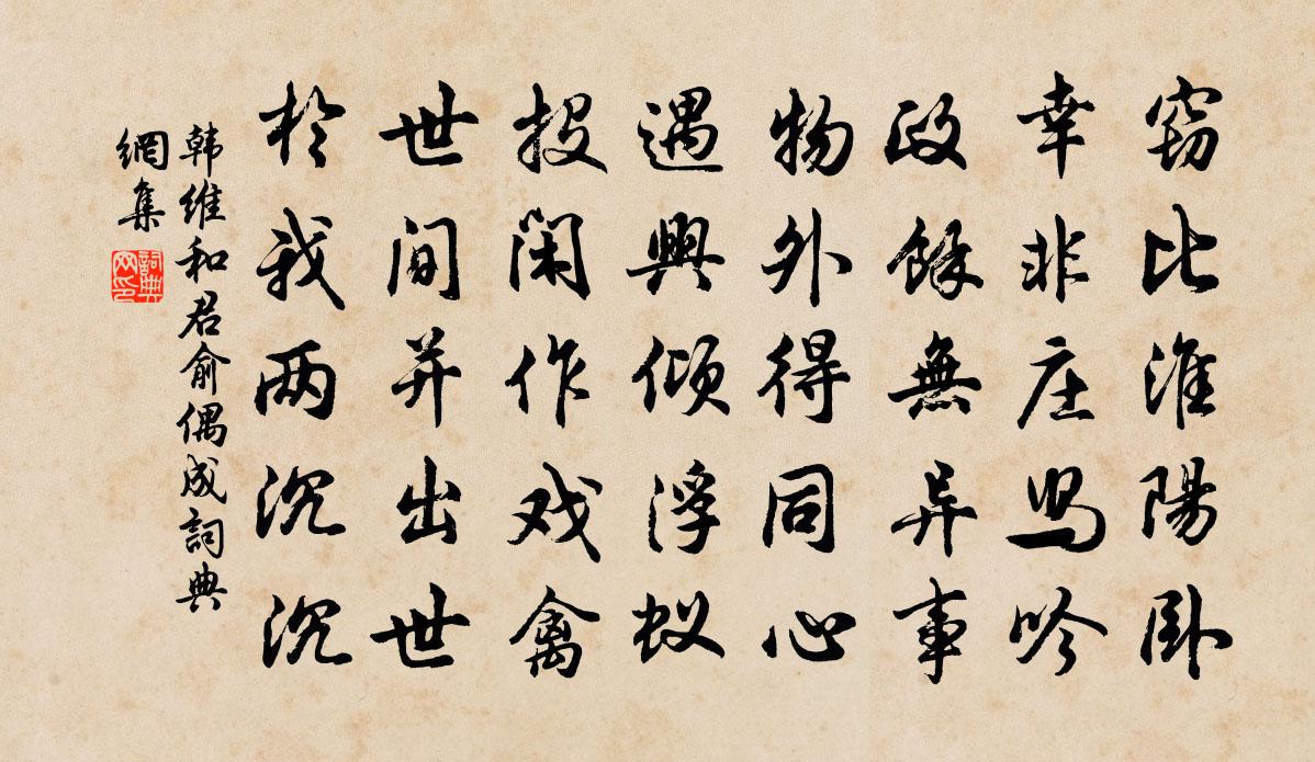 詩詞名句歷史字典書法欣賞書法字典國語詞典說文解字康熙字典古漢語字典標 題 作 者 詩 句 和君俞偶成作者:韓維 朝代:宋代和君俞偶成原文竊比淮陽臥,幸非莊舄吟。政余無異事,物外得同心。遇興傾浮蟻,投閒作戲禽。世間並出世,於我兩沉沉。詩詞問答問:和君俞偶成的作者是誰?答:韓維問:和君俞偶成寫於哪個朝代?答:宋代韓維和君俞偶成書法欣賞和君俞偶成書法作品詩詞推薦秋晚登樓望南江入始興郡路張九齡〔唐代〕潦收性沙衍出,性霜降天宇性晶。伏檻性一長眺,津途多遠情。思來江山外,望盡煙雲生。滔滔不自辨,役役且何更漏子馮延巳〔唐代〕夜初琴長,人近琴別,夢斷琴一琴殘月。鸚鵡睡,蟪蛄鳴,西風寒未成。紅蠟燭,半棋局,床上畫屏山綠。搴繡幌句朱惟賢〔宋代〕層檐月印高低影,寒壑風號遠近聲。漁父張松齡〔唐代〕樂是風波釣是閒,草堂松檜已勝攀。太湖水,洞庭山,狂風浪起且須還。贈別張西叔之豐城釋紹嵩〔宋代〕有客功名累,蕭蕭逐轉蓬。豐城千里外,茅屋萬山中。楊柳縈橋綠,秋梨繞地紅。登臨雖未並,談笑會當同。挽梁尚書二首吳芾〔宋代〕早歲膺宸眷,迴翔老禁塗。三持周版籍,九佩漢銅符。度量包千頃,聲名滿八區。誰知成奄忽,陳跡付龜趺。【雙調】落梅風_秋思懷桃葉張可久〔元代〕秋思懷桃葉,憶柳枝,仲宣樓杜陵詩思。白雲中兩三個新雁兒,寫相思不成愁字。虞美人(春寒)趙長卿〔宋代〕東風卷盡辛夷雪。逆旅清明節。黃昏煙雨失前山。陟遍朱欄、酒噤不禁寒。歸來誰護衣篝火。倒擁文鴛臥。可堪連送外龍輔〔宋代〕綠柳千條映遠空,郎君欲別思忡忡。願得化為江上水,與郎直到赤門東。十二月拜起居表回許渾〔唐代〕一章西奏拜仙曹,回馬天津北望勞。寒水欲春冰彩薄,曉山初霽雪峰高。樓形向日攢飛鳳,宮勢凌波壓抃鰲。空鎖過笪橋楊萬里〔宋代〕輕風欲動沒人知,早被垂楊報酒旗。行到笪橋中半處,鍾山飛入轎窗來。用前韻答黃一翁五首王炎〔宋代〕秣馬踐古轍,經術導先路。士要人品高,與俗殊好惡。忮心蠆尾毒,褊心螳臂怒。唾面令自乾,吾今仍非故。失調名佚名〔宋代〕獨倚闌乾十二。瘦馬行(一作老馬)杜甫〔唐代〕東郊瘦馬使我傷,骨骼硉兀如堵牆。絆之欲動轉欹側,此豈有意仍騰驤。細看六印帶官字,眾道三軍遺路旁。皮乾路乾陸游〔宋代〕日曬霜融步步泥,旬余不到石泉西。連朝和暖得乾路,喚取鄰翁來杖藜。贊勉齋黃先生像陳宓〔宋代〕貌之癯有顏之樂,氣之剛得軻之養。以身任道,老而益壯。仰止朱門,孰出其上。見黃仲達感秋意張耒〔宋代〕秋風吹衡茅,寂歷如荒村。獨立無與語,悲蟲鳴草根。老木經疾風,枝葉僅得存。疏蔭不滿地,白日耿當軒。北城途葉二絕杜范〔宋代〕腳踏京塵動數旬,歸途又復見書雲。群陰已放陽來復,看取新年別有春。至鄂期年以饟事不給於詩己亥夏五廿有八日始岳珂〔宋代〕昌黎久原列三王,我亦曾親翰墨香。惜別依依重回首,棠磯風月更思量。臘月二十二夜漏下數刻小飲徑醉坐小合睡傍無劉克莊〔宋代〕垂堂一跌血面,閉合三旬裹瘡。有佛至維摩室,無人拜德公床。名句推薦曉窗移枕,酒困香殘,春陰簾卷。吳文英《燭影搖紅·元夕雨》 朽木不可雕也,糞土之牆不可圬也!佚名《宰予晝寢》 辭柯霜葉,飛來就我題紅。朱庭玉《天淨沙·秋》 雁風自勁,雲氣不上涼天。吳文英《新雁過妝樓·中秋後一夕李方庵月庭延客命小妓過新水令坐間賦詞》 千萬恨,恨極在天涯。溫庭筠《夢江南·千萬恨》 昔有佳人公孫氏,一舞劍器動四方。杜甫《觀公孫大娘弟子舞劍器行》 客子光陰詩卷里,杏花訊息雨聲中。陳與義《懷天經智老因訪之》 大雪北風催,家家貧白屋。環山樵《薛寶釵·雪竹》 政之所興,在順民心。管仲《管子·牧民》 燕山雪花大如席,片片吹落軒轅台。李白《北風行》