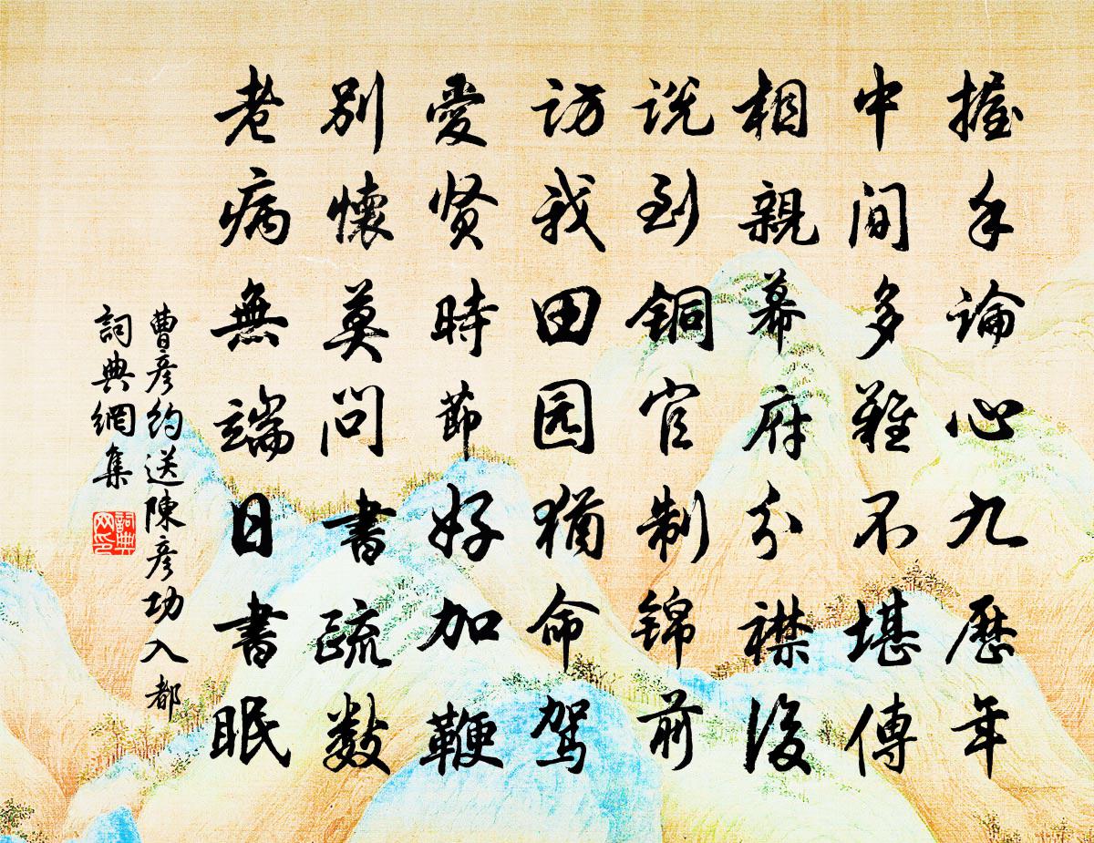 詩詞名句歷史字典書法欣賞書法字典國語詞典說文解字康熙字典古漢語字典標 題 作 者 詩 句 送陳彥功入都作者:曹彥約 朝代:宋代送陳彥功入都原文握手論心九歷年,中間多難不堪傳。相親幕府分襟後,說到銅官制錦前。訪我田園猶命駕,愛賢時節好加鞭。別懷莫問書疏數,老病無端日書眠。詩詞問答問:送陳彥功入都的作者是誰?答:曹彥約問:送陳彥功入都寫於哪個朝代?答:宋代曹彥約送陳彥功入都書法欣賞送陳彥功入都書法作品詩詞推薦寮前老郎請贊釋普度〔宋代〕心直如弦,性急似箭。翻手覆手,日面月面。零敲碎打破沙盆,我見人見眾生見壽者見。長沙汪元量〔宋代〕洞庭過了浪猶高,河伯欣然止怒濤。傍岸買魚仍問米,登樓呼酒更持螯。湘汀暮雨幽蘭溼,野渡寒風古樹號。詩到峽州至喜亭范成大〔宋代〕斷崖臥水口,連岡抱城樓。下有吳蜀客,檣竿立滄洲。雨後漲江急,黃濁如潮溝。時見山峽船,鐃鼓譟中流。適從偈頌九十三首釋梵琮〔宋代〕趙州南,石橋北,觀音院裡有彌勒。祖師遺下一隻履,直至而今覓不得。趙州老子,信手栽荊棘,當門種蒺蔾。四又和二首劉克莊〔宋代〕只有短轅車錫導,更無靈壽杖扶光。林間竹筍飽一世,閣下薇花閱幾郎。曩欲裂麻寧拂袖,老當還笏不須囊。綠陰晝錦堂佚名〔宋代〕雨洗桃花,風飄柳絮,日日飛滿雕檐。懊惱一春幽恨,盡屬眉尖。愁聞雙飛新燕語,更堪孤枕宿酲忺。雲鬟亂,獨同伯氏還鄉胡宏〔宋代〕江村沙暖蔞蒿長,味比枸杞新甘香。茁茁荻芽生近渚,紫花台萊初未嘗。牡羊烏牸俱在牧,茅舍竹籬是故鄉。人生已亥雜詩 274龔自珍〔清代〕明知此浦定重過,其奈尊前百感何。亦是今生未曾有,滿襟清淚渡黃河。偈頌一百零四首釋紹曇〔宋代〕丈夫膝下有黃金,爭肯與他人作禮。須彌燈王,腳頭腳底。明堂觀禮雜詠十三首回龍橋望駕王同祖〔宋代〕回龍橋上望龍顏,毅采英英仰視難。須信吾皇自神武,何憂中國不尊安。和魏定父早春十首王之道〔宋代〕門前溪水綠縈迴,風轂無邊費剪裁。待與東君寫春色,好教紅紫一時開。晨起張耒〔宋代〕曉色淡朦朧,園林白露濃。寒叢蛩響畔,秋屋葉聲中。更老心猶壯,雖貧尊不空。浮生仗天理,不擬哭途窮。問水詩蘇泂〔宋代〕頃別知何處,重來喜奈何。望洋夸海谷,倒篋注天河。變化龜文坼,淪漪鴨頂波。白鷗沒浩蕩,清興滿吟喔。東湖北崦人家釋文珦〔宋代〕柴門映石柟,茅屋似僧庵。蠶候家人熟,耕時父老諳。設罝當兔徑,添竹護魚潭。賽雨鳴簫鼓,迎神向水南。和別館即事趙希逢〔宋代〕溪搖日色遠生光,飛絮隨風上下狂。纈間群花連野發,錦添稚筍滿林香。斜陽落盡千山晚,帶月歸來一葦航。老矣送鄭剛中赴江東參議張鎡〔宋代〕去程遙指石頭城,秋與鐘山老氣清。紬繹蓬巒曾是正字,參陪蓮幕試論兵。時平得計甘微祿,學古無心急近榮。君和韋蘇州游靈岩山寺韻呈言上人王之道〔宋代〕我老懶成癖,貪引林泉幽。誰令吳中來,兩月乘江流。闔門十日雨,不得歷虎丘。讀子靈岩詩,還復令我愁。想見車賀還內大雪項安世〔宋代〕萬乘回轅入未央,六花迎駕舞康莊。都人失喜瞻天仗,旱俗相呼候歲穰。百局橋山方暴露,兩宮長信正淒涼。去年維揚即事張蘊〔宋代〕牛斗星邊禹貢州,東南禁止大江流。向來明月珠簾夢,不信秋風夜柝愁。聞桑葉賤甚感嘆有作趙蕃〔宋代〕種得桑栽接始成,剃鋤長及夏時營。葉黃已說都無價,蠶老那知轉更平。自是初頭放種薄,曷能斷手有絲嬴。田租名句推薦逢流星兮問路,顧我指兮從左。王逸《九思》 迴廊一寸相思地,落月成孤倚。納蘭性德《虞美人·銀床淅瀝青梧老》 西陸蟬聲唱,南冠客思深。駱賓王《詠蟬 / 在獄詠蟬》 片雲天共遠,永夜月同孤。杜甫《江漢》 檐流未滴梅花凍,一種清孤不等閒。鄭燮《山中雪後》 可憐九月初三夜,露似真珠月似弓。白居易《暮江吟》 母信者,其子必仁。劉向《列女傳·節義傳·楚昭越姬》 遊子春衫已試單,桃花飛盡野梅酸。吳濤《絕句·遊子春衫已試單》 算陰晴,渾似幾番,渭城故人離會。吳文英《永遇樂·乙巳中秋風雨》 十年花骨東風淚,幾點螺香素壁塵。史達祖《鷓鴣天·搭柳欄乾倚佇頻》