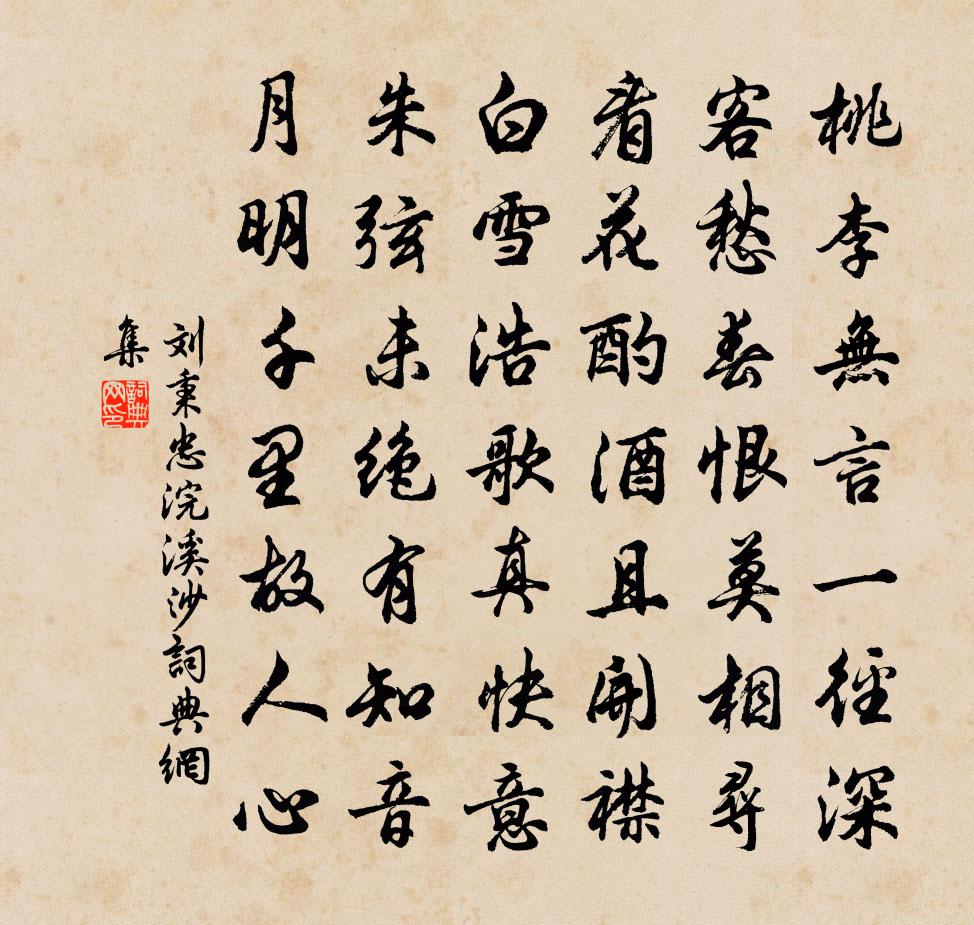 詩詞名句歷史字典書法欣賞書法字典國語詞典說文解字康熙字典古漢語字典標 題 作 者 詩 句 浣溪沙作者:劉秉忠 朝代:元代浣溪沙原文桃李無言一徑深。客愁春恨莫相尋。看花酌酒且開襟。白雪浩歌真快意,朱弦未絕有知音。月明千里故人心。詩詞問答問:浣溪沙的作者是誰?答:劉秉忠問:浣溪沙寫於哪個朝代?答:元代問:浣溪沙是什麼體裁?答:詞劉秉忠浣溪沙書法欣賞浣溪沙書法作品詩詞推薦送族弟凝之滁求婚崔氏李白〔唐代〕與爾情不淺,忘筌已得魚。玉台掛寶鏡,持此意何如。坦腹東床下,由來志氣疏。遙知向前路,擲果定盈車。錢舜舉瓜畫方回〔宋代〕老錢工作趙昌花,殘綠依稀姤五瓜。正叔晦翁凡六說,始知輔嗣大爭差。題薛直老府園萬象亭李彌遜〔宋代〕斷取方壺將郡壕,鉤連野色上亭皋。星移日轉天容麗,江淨山明地軸高。下榻筵賓供嘯詠,凝香罷寢助風騷。史君光上人求語釋亮〔宋代〕光明寂照偏河沙,認著依前滿眼化。喪盡諸緣回首看,寥寥四顧絕周遮。絕周遮處未為是,更須知有社師關。透得游洪福寺孔武仲〔宋代〕清晨戒童僕,匹馬出皇州。欲探逍遙趣,因成爛漫遊。藤蘿回書暝,雲雨送春愁。傍近緋桃塢,尋春亦少留。檐卜花楊巽齋〔宋代〕檐卜標名自寶坊,薰風開遍一庭霜。間來掃地跏趺坐,受用此花無盡香。望江南黃公紹〔宋代〕思晴好,試卜那朝晴。古木荒村雲淰淰,孤燈敗壁夜冥冥。不寐聽檐聲。紅葉楊萬里〔宋代〕詩人滿腹著清愁,吐作千詩未肯休。寫遍壁間無去處,卻將紅葉強題秋。尚書蔣溥奏進所刻御製詩集書此志懷乾隆〔清代〕伊余有結習,對時耽屬詠。賦詩何必多,杜老言誠正,況乎居九五,所貴行實政。享帚虞舛缺,綜錄予所命,殺青伏聞知府秘書欲取小杜桐廬詩語,以見花名堂范成大〔宋代〕使君來暖東堂席,又見堂前花信息。小白猶封竹外枝,微黃已點眉間色。山城十月如春台,聞有細書天上來。說與西湖舊夢汪元量〔宋代〕月香水影逋梅白,雨色晴光坡柳青。一箇銷金鍋子裡,舞裾歌扇不曾停。蒙使君召預池光之會朱長文〔唐代〕韋公池閣尚依然,賓主於今不乏賢。郡內欣逢兩耆俊,樽前喜會四同年。清談自可成珠玉,真常何須聽管弦。宴罷維摩贊釋祖欽〔宋代〕尪羸面孔,蹊蹺肚腸。憂愁苦惱,詐病在床。說離生死妙法,一默無雙。尤溪補陀岩釋慧空〔宋代〕岩下溪聲傾法雨,岩頭雲根聳華冠。遊人不入普門境,只作青山綠水看。與耿天騭會話王安石〔宋代〕邯鄲四十餘年夢,相對黃粱欲熟時。萬事只如空鳥跡,怪君強記尚能追。鷓鴣天向子諲〔宋代〕莫問清江與洛陽。山林總是一般香。兩家地占西南勝,可是前人例姓楊。石作枕,醉為鄉。藕花菱角滿池塘。雖無送仲秉赴廷試五首李呂〔宋代〕一元誰破碎,河洛漏微分。星斗昭乾緯,葩華粲地文。班揚渾細事,伊傅有殊勛。補履非神劍,相期敬所聞。禪人並化主寫真求贊釋正覺〔宋代〕年齒垂垂,鬚髮絲絲。月寒無影樹,春在未萌枝。得失折肱塞人馬,輸贏爛柯樵子棋。示現威儀而不起滅盡之定,送友人尋越中山水李白〔唐代〕聞道稽山去,偏宜謝客才。千岩泉灑落,萬壑樹縈迴。東海橫秦望,西陵繞越台。湖清霜鏡曉,濤白雪山來。八月餞潘使君二首劉克莊〔宋代〕一念拳拳帝所臨,士民皆諒使君心。隨車雨每孚精禱,下瀨船多出俸金。兩載公真茹檗苦,百年人尚愛棠陰。從今名句推薦不是花中偏愛菊,此花開盡更無花。元稹《菊花》 生而知之者上也,學而知之者次也;困而學之又其次也。困而不學,民斯為下矣。孔子弟子《論語·季氏篇》 秋風吹到江村,正黃昏,寂寞梧桐夜雨不開門。顧彩《相見歡·秋風吹到江村》 洛陽城裡春光好,洛陽才子他鄉老。韋莊《菩薩蠻》 風雨替花愁。風雨罷,花也應休。趙秉文《青杏兒·風雨替花愁》 家國興亡自有時,吳人何苦怨西施。羅隱《西施》 命室攜童弱,良日登遠遊陶淵明《酬劉柴桑》 台在山腰,一峰突起,離水十餘丈。沈復《浮生六記·浪遊記快》 至今不會天中事,應是嫦娥擲與人。皮日休《天竺寺八月十五日夜桂子》 故人何不返,春華復應晚。柳惲《江南曲》