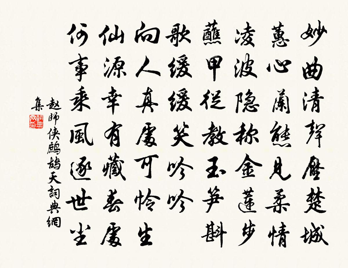 詩詞名句歷史字典書法欣賞書法字典國語詞典說文解字康熙字典古漢語字典標 題 作 者 詩 句 鷓鴣天作者:趙師俠 朝代:宋代鷓鴣天原文妙曲清聲壓楚城。蕙心蘭態見柔情。凌波隱稱金蓮步,蘸甲從教玉筍斟。歌緩緩,笑吟吟。向人真處可憐生。仙源幸有藏春處,何事乘風逐世塵。詩詞問答問:鷓鴣天的作者是誰?答:趙師俠問:鷓鴣天寫於哪個朝代?答:宋代問:鷓鴣天是什麼體裁?答:詞趙師俠鷓鴣天書法欣賞鷓鴣天書法作品詩詞推薦朝中措陳三聘〔宋代〕草堂春過一分余。幽事酒醒初。琴調細鳴焦木,矢聲不斷銅壺。關心藥里,忘年蓑笠,自著潛夫。雨後長鑱東麓,秋興汪莘〔宋代〕天處涵天心廣大,月中吐月性光明。夜來飛上崑崙頂,獨倚瓊樓嘯一聲。山庵夜宿呈深居先生張紹文〔宋代〕松逕轉幽密,一程深一程。濤聲在平地,月色正三更。僧定欲喚起,鶴眠頻夢驚。曉來真富貴,露葉綴珠瓔。次曾景建紅泉碧澗韻趙汝談〔宋代〕詩評明水好,笑我尚逶迤。丹穴三千仞,蒼藤千萬枝。谷耕聞好鳥,社飲見龐眉。他日煩君指,書堂與佛祠。挽商元鼎喻良能〔宋代〕舉世方貪祿,斯人只自怡。一官如涕唾,半世足遨嬉。心地陂千頃,生涯灑一卮。唯應郭有道,吾不愧為碑。即景乾隆〔清代〕即景為題信口拈,山莊樂事實無厭。蒼麋岩際行行見,紅葉林間漸漸添。碧宇雲稀天廓落,寒潭潦盡水沉潛。詎惟詠史·鬱郁澗底松左思〔魏晉〕鬱郁澗底松,離離山上苗。以彼徑寸莖,蔭此百尺條。世胄躡高位,英俊沉下僚。地勢使之然,由來非一朝。金張百一詩 十一應璩〔魏晉〕平生居□郭。寧丁憂貧賤。出門見富貴。□□□□□。灶下炊牛矢。甑中裝豆飯。滿庭芳侯善淵〔元代〕斗柄迴旋,紫微初現,緬平一色淳清。雲瑛搗盡,天寶耀華嬰。玉桂瓊林素羽,升玄御、光璨流精。冷然妙,丹黃三江陸游〔宋代〕三江郡東北,古戍郁嵯峨。漁子船浮葉,更人鼓應鼉。年豐坊酒賤,盜息海商多。老我無豪思,悠然寄醉歌。減字木蘭花汪莘〔宋代〕詩家清絕。檐外森然蒼玉節。學易無思。一笑窗前白玉妃。何人共說。山上青松松上雪。更有誰知。溪在門前月在於長史山池三日曲水宴陳子昂〔唐代〕摘蘭藉芳月,祓宴坐回汀。泛灩清流滿,葳蕤白芷生。金弦揮趙瑟,玉指弄秦箏。岩榭風光媚,郊園春樹平。煙花華生篇司馬光〔宋代〕涼風淨掃雲無跡,海月未生星曆歷。貝聊珠貫拱北辰,三五縱橫此何夕。重樓疊榭出秋空,鳷鵲露寒連桂宮。瑤井州中小飲便別牛相李紳〔唐代〕笙歌罷曲辭賓侶,庭竹移陰就小齋。愁不解顏徒滿酌,病非傷肺為憂懷。恥矜學步貽身患,豈慕醒狂躡禍階。從此二章黃庭堅〔宋代〕薄言采之,遵彼山曲。汝來遲遲,去我何速。伊時之人,誰適與同。不與我好,殆其覯凶。楊花吳錫疇〔宋代〕為見春風不久歸,顛狂上下弄晴暉。只饒天與無拘束,入幕穿簾任意飛。菩薩蠻(題錦機小軸)梅窗〔宋代〕淺紅綃透春裁剪。剪裁春透綃紅淺。機錦織情絲。絲情織錦機。意深憑遠寄。寄遠憑深意。波渺勝愁多。多愁勝渺題二陸祠陳琰〔宋代〕塵暗香殘二陸祠,可憐詞藻妙當時。聯鑣入洛成何事,一段淒涼鶴不知。澗上姜特立〔宋代〕晴蜻舞幽澗,水鵲立枯槎。予亦坐煙壑,有生俱有涯。使風韓偓〔唐代〕茶煙睡覺心無事,一卷黃庭在手中。欹枕捲簾江萬里,舟人不語滿帆風。名句推薦雖然不如延年妹,亦是當時絕世人。李白《中山孺子妾歌》 長安一片月,萬戶搗衣聲。李白《子夜吳歌·秋歌》 雨荒深院菊,霜倒半池蓮。杜甫《宿贊公房》 今人嗤點流傳賦,不覺前賢畏後生。杜甫《戲為六絕句》 但屈指西風幾時來,又不道流年暗中偷換。蘇軾《洞仙歌·冰肌玉骨》 腸斷月明紅豆蔻,月似當時,人似當時否?納蘭性德《鬢雲松令·枕函香》 唯有閒愁將不去,依舊住,伴人直到黃昏雨。段克己《漁家傲·詩句一春渾漫與》 搖落深知宋玉悲,風流儒雅亦吾師。杜甫《詠懷古蹟五首·其二》 樓台處處迷芳草,風雨年年怨落花。曾棨《維揚懷古》 窗前竹葉,凜凜狂風折。張淑芳《滿路花·冬》