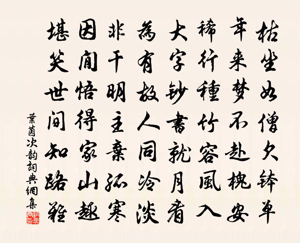 詩詞名句歷史字典書法欣賞書法字典國語詞典說文解字康熙字典古漢語字典標 題 作 者 詩 句 次韻作者:葉茵 朝代:宋代次韻原文枯坐如僧欠缽單,年來夢不赴槐安。稀行種竹容風入,大字鈔書就月看。為有故人同冷淡,非乾明主棄孤寒。因閒悟得家山趣,堪笑世間知路難。詩詞問答問:次韻的作者是誰?答:葉茵問:次韻寫於哪個朝代?答:宋代葉茵次韻書法欣賞次韻書法作品詩詞推薦閒步游紫極觀張鎡〔宋代〕青惜高杉覓望寬,仙廬幽占路紆盤。邊花制古裝門榜,老桂枝拳倚醮壇。顏色不同輕紫綬,精神常在慕黃冠。蜂巢東西道元稹〔唐代〕 * 開四極,便有東西道。萬古閱行人,行人幾人老。顧我倦行者,息陰何不早。少壯塵事多,那言壯年好。梅花絕句陸游〔宋代〕憶昔西戍日,夜宿僊人原。風吹野梅香,夢繞江南村。元夕偶成蘇籀〔宋代〕里唱塗謳鐃吹轟,軟塵梁苑記前生。寶珠穿蟻嬉遊肆,蓮蕊然犀 * 。透碗燈繁人晝繡,隔羅光醖酒澠清。春娃獨坐有懷杜伯高陸游〔宋代〕畫橋通小市,深院欲黃昏。愛月先移燭,留香每閉門。李侯有佳句,樂令善清言。老病貪搘枕,何由共一樽?論真青色賈似道〔宋代〕青金頭象菩提子,頭上毛青靛染成。若還鉗得芝蔴白,請君鬭盡莫疑生。和王右司游南嶽三絕王炎〔宋代〕懶跨狨鞍趁曉班,卻空蠟屐小游山。山頭草木生光彩,玉節曾行紫翠間。八歸 湘中送胡德華姜夔〔宋代〕芳蓮墜紛,疏桐吹綠,庭院暗雨乍歇。無端抱影銷魂處,還見篠[1]牆螢暗,蘚階蛩切。送客重尋西去路,問水山中夜歸釋圓悟〔宋代〕一鶴候柴關,林空境自閒。竹房秋後凍,病叟夜深遠。樹密疑無路,月明猶在山。幽居便所適,已是十年閒。農歌宋祁〔宋代〕農歌非度曲,新樂信蚩蚩。迺父知田事,吾王采諺辭。折楊時動笑,鼓腹自成嬉。日暮牛童笛,連聲下遠陂。吾廬吟邵雍〔宋代〕吾廬雖小粗容身,且免輕為僦舍人。大有世人無屋住,向人檐下索溫存。安樂窩中吟邵雍〔宋代〕安樂窩中設不安,略行湯劑自能痊。居常無病不服藥,就使有災宜俟天。理到昧時須索講,情於盡處更何言。自餘松翁承贊〔唐代〕倚澗臨溪自屈蟠,雪花銷盡蘚花乾。幽枝好折為談柄,入手方知有歲寒。鄰居送梅子朱櫻趙蕃〔宋代〕山居蔬果少,口腹每勞人。梅子欣初食,櫻桃並及新。供鹽貧亦辦,薦酪遠無因。便可呼杯勺,數朝陰雨頻。順堂夜雨錢時〔宋代〕海棠初綻錦成林,多少人間富貴心。雋永一燈論語課,蕭蕭風雨夜堂深。離嘉州宿平羌陸游〔宋代〕初挈囊衣宿水村,蕭然一掃舊巢痕。本來信手忘工拙,卻為無心少怨恩。自笑遠遊諳馬上,已營小築老雲根。淡煙獅子相觀音贊釋智朋〔宋代〕獅子國中,隨類度生。盤石海潮,呵吼不停。要見真獅子兒,於斯觀其音聲。送明守黃子由尚書赴召孫應時〔宋代〕燈火笙歌別海壖,詔書歸覲九重天。已將清淨安齊國,不使聲名減潁川。題品人才看贊贊,夫持皇極在平平。文星又漁社李先生寵以和篇復用韻楊冠卿〔宋代〕南國有秋茱,芳馨襲椒蘭。臞儒山澤間,晨霞卻朝餐。置之紅錦囊,薦以黃金盤。瓶乳下青雲,一笑頹玉山。雞犬吊辨才二首周文璞〔宋代〕讀了碑文讀祭詩,冷看遺像立多時。郎當嶺上生雲處,山鳥山花憶老師。名句推薦竹里繰絲挑網車,青蟬獨噪日光斜。李賀《南園十三首》 但知江湖者,都是薄命人。佚名《增廣賢文·下集》 早知潮有信,嫁與弄潮兒。李益《江南曲》 明日近長安,客心愁未闌。納蘭性德《菩薩蠻·白日驚飈冬已半》 思其艱以圖其易佚名《尚書·周書·君牙》 念月榭攜手,露橋聞笛。周邦彥《蘭陵王·柳》 此情可待成追憶?只是當時已惘然。李商隱《錦瑟》 暗燈涼簟怨分離,妖姬,不勝悲。閻選《河傳·秋雨》 舉善從諫,在上之明規; 進賢謁言,為臣之令范。姚思廉《陳書·本紀·卷五》 權,然後知輕重;度,然後知長短。物皆然,心為甚。孟子《孟子·梁惠王章句上·第八節》