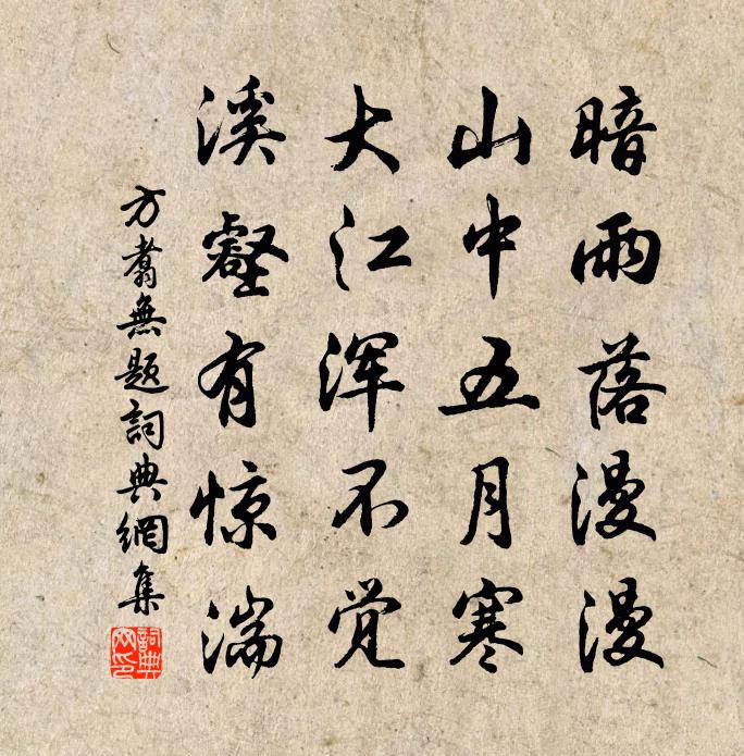 詩詞名句歷史字典書法欣賞書法字典國語詞典說文解字康熙字典古漢語字典標 題 作 者 詩 句 無題作者:方翥 朝代:宋代無題原文暗雨落漫漫,山中五月寒。大江渾不覺,溪壑有驚湍。詩詞問答問:無題的作者是誰?答:方翥問:無題寫於哪個朝代?答:宋代方翥無題書法欣賞無題書法作品詩詞推薦艷女詞梁鍠〔唐代〕露井桃花發,雙雙燕並飛。美人姿態里,春色上羅衣。自愛頻開鏡,時羞欲掩扉。不知行路客,遙惹五香歸。挽傅仲斐生母李氏陳宓〔宋代〕已登椿柏七旬算,終錫花釵九樹妝。懿行在人今已矣,西風笳鼓助淒涼。菩薩蠻沈會宗〔宋代〕落花迤邐層陰少,青梅競弄枝頭小。紅色雨和煙,行人江那邊。 好花都過了,滿地空芳草。落日醉醒問,一春無傷時(一作鄭遨詩)杜光庭〔唐代〕帆力劈開滄海浪,馬蹄踏破亂山青。浮名浮利過於酒,醉得人心死不醒。倒垂柳(重九)楊無咎〔宋代〕曉來煙露重,為重陽、增勝致。記一年好處,無似此天氣。東籬白衣至,南陌芳筵啟。風流曾未遠,登臨都在眼底奉和御製玉清昭應宮甘露歌夏竦〔宋代〕祝聖清場初展禮,鴻都向曉彰繁祉。鬱郁織枝正後凋,瀼瀼瑞采俄雰委。吉雲五色比還疏,況是嚴冬歲律餘。承以與兒孫小飲陸游〔宋代〕歲暮寒多雨,村深早閉門。荒園摘葵芥,近市買雞豚。短褐聯三世,幽窗共一樽。五曹常得此,餘事不須論。大人築室將畢道祖亦作宅基治園作四詩示道祖葛立方〔宋代〕世事只如許,幽居誠樂哉。報安知楚竹,索笑得江梅。岸放平湖入,窗邀遠岫來。兩家車馬地,莫遣染蒼苔。下第夜吟戴衢〔唐代〕擾擾東西南北情,何人於此悟浮生。還緣無月春風夜,暫得獨聞流水聲。往溪源祈雨賡李司法韻陳宓〔宋代〕一春雨脈發清泉,何以平疇旱欲然。太守自慚無善政,鈴齋朝夕謾祈天。春日泛舟釋永頤〔宋代〕野外苔磯好,孤舟未可拋。碧溪沿谷口,晴柳護塘坳。波靜魚吹沫,林深鵲隱巢。輕雲障暖日,間思渺春郊。陳留市隱黃庭堅〔宋代〕市井懷珠玉,往來人未逢。乘肩嬌小女,邂逅此生同。養性霜刀在,閱人清鏡空。時時能舉酒,彈鑷送飛鴻。感傷文天祥〔宋代〕地維傾渤澥,天柱折崑崙。清夜為揮淚,白雲空斷魂。死生蘇子節,貴賤翟公門。高廟神靈在,乾坤付不言。詠史下劉裕陳普〔宋代〕長安何但遺黎舞,翁仲銅駝亦笑開。他日佛貍南下路,青泥千尺髑髏台。霜節堂張鎡〔宋代〕風冽前村有墮巢,何心寒苦自為高。堪憐讓殺閒桃李,只得虛堂兩字褒。奉和聖制夏日游石淙山狄仁傑〔唐代〕宸暉降望金輿轉,仙路崢嶸碧澗幽。羽仗遙臨鸞鶴駕,帷宮直坐鳳麟洲。飛泉灑液恆疑雨,密樹含涼鎮似秋。老臣庚戌中秋病起言懷喻良能〔宋代〕病來十日不飲酒,起對中秋良可人。銀漢迢迢清未了,金波瀲瀲淨無塵。艷歌未暇成三疊,美醞何妨釂十分。記得送友人孔濟之之金華林景熙〔宋代〕餘子紛紛氣可吞,青霄萬里合孤騫。藻芹池冷三年客,絲竹堂高几世孫。前輩修名似山斗,斯文清氣在乾坤。故人醉思凡/醉太平孫惟信〔宋代〕 * 跨鸞。香銷夜闌。杏花樓上春殘。繡羅衾半閒。衣寬頻寬。千山萬山。斷腸十二闌乾。更斜陽暮寒。點絳唇馮去非〔宋代〕秋滿孤篷,翠蒲紅蓼留人住。一簾香縷。邊影驚鴻度。小據胡床,舊事新情緒。憑誰訴。蠟燈犀塵。擬共西風語。名句推薦寒眼亂空闊,客意不勝秋。楊炎正《水調歌頭·登多景樓》 瘦雪一痕牆角,青子已妝殘萼。王庭筠《謁金門·雙喜鵲》 舊時燕子還飛否?今古不勝情。歸莊《錦堂春·半壁橫江矗起》 始知鎖向金籠聽,不及林間自在啼。歐陽修《畫眉鳥》 居高聲自遠,非是藉秋風。虞世南《蟬》 斜風細雨作春寒。對尊前。朱淑真《江城子·賞春》 憶昔午橋橋上飲,坐中多是豪英。陳與義《臨江仙·夜登小閣憶洛中舊遊》 凡兵家之法,要在應變,好在知兵,舉動必先料敵。佚名《百戰奇略·第十卷·變戰》 水滿有時觀下鷺,草深無處不鳴蛙。陸游《幽居初夏》 我醉欲眠卿且去,明朝有意抱琴來。李白《山中與幽人對酌》