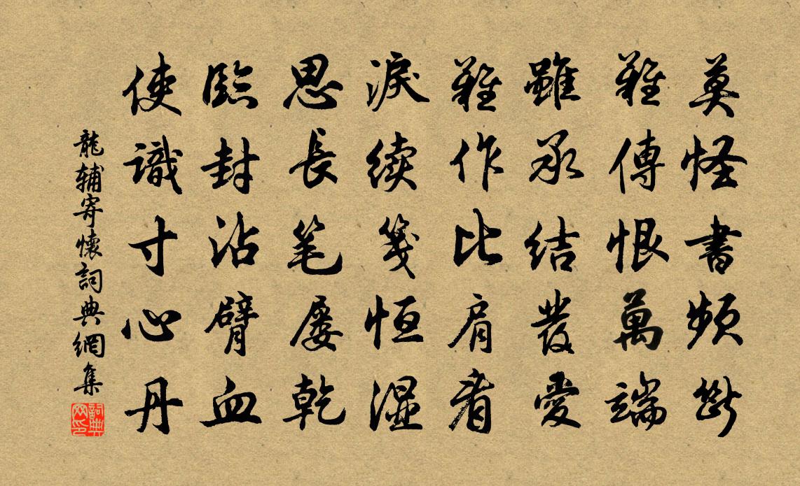 詩詞名句歷史字典書法欣賞書法字典國語詞典說文解字康熙字典古漢語字典標 題 作 者 詩 句 寄懷作者:龍輔 朝代:宋代寄懷原文莫怪書頻斷,難傳恨萬端。雖承結髮愛,難作比肩看。淚續箋恆濕,思長筆屢乾。臨封沾臂血,使識寸心丹。詩詞問答問:寄懷的作者是誰?答:龍輔問:寄懷寫於哪個朝代?答:宋代龍輔寄懷書法欣賞寄懷書法作品詩詞推薦奉酬魯望夏日四聲四首平入聲皮日休〔唐代〕先生何違時,一室習寂歷。松聲將飄堂,岳 * 壓席。彈琴奔玄雲,劚藥折白石。如教題君詩,若得札玉冊。挽胡制機康侯許月卿〔宋代〕鷺點青松白,鶯穿綠柳黃。兒時工對偶,老去更文章。誅意平生學,爰咨去路忙。酒邊招隱操,我更憶山堂。偈頌二十一首釋智愚〔宋代〕君勿受汪涼,清涼如火沸湯。君勿惡炎熱,炎熱如冰如積雪。勿愛亦勿惡,未是逍遙處。哭?十五章辛棄疾〔宋代〕百年風雨過,達者齊殤彭。嗟我反不如,其下不及情。長思仙 贈濱州李志持王丹桂〔元代〕李志持。做修持。早把心田荊棘治。休教下手遲。汲華池。灌華池。劣馬顛猿不騁馳。功成拜玉墀。玉闌乾朱彝尊〔清代〕玉闌乾外秋蛩語,一架豆花清露。蘭湯浴罷納新涼,攜縴手夜深爾汝。綠窗人遠紗空護,網暗塵,蛛絲無數。舊時浣溪沙史浩〔宋代〕遠岫數堆蒼玉髻。平湖千頃碧琉璃。笙歌催我上船時。載月有如浮玉鑒,採蓮還復擁燕脂。更於何處覓瑤池。富陽道中柴望〔宋代〕幾年只向長安去,今日囊書被旨回。馬首獨行秋葉路,鱸魚時共菊花杯。黃昏鍾動雁初下,夜半月明潮正來。我自黃注昆仲赴舉宋祁〔宋代〕君家日下有高名,驥子雙馳嗣世靈。滄海賦毫多灑白,南山書簡偏蒸青。縣歌酒釂催鳴鹿,學舍綀寒亂散螢。崑玉江子有懷二首白玉蟾〔宋代〕寒夢去易回,歸心動復止。天涯一逆旅,身傍五窮鬼。渺渺三山雲,浩浩九江水。幽窗風雨夜,此情竟誰委。贈釋疏言還道林寺詩李節〔唐代〕湘川床狺狺兮俗床獷且佷,床利殺業偷兮吏莫之馴。繄釋氏兮易暴使仁,釋何在兮釋在斯文,湘水滔滔兮四望何依和潘丈四子詩韻陳宓〔宋代〕此心無日不風沂,常恐春隨柳絮飛。才覺迷途先獨復,便於安危作真歸。生來理欲雖殊本,轉處危微在一機。同志午日三首梅堯臣〔宋代〕佳人五色縷,道士絳囊符。瘦臂不中系,百邪何用驅。從軍詩五首·其四王粲〔兩漢〕朝發鄴都橋,暮濟白馬津。逍遙河堤上,左右望我軍。連舫逾萬艘,帶甲千萬人。率彼東南路,將定一舉勛。籌策江城子(和彥時兄)王之道〔宋代〕新篁初上籜龍陂。綠陰稀。綠陰稀。牆外石榴,花放兩三枝。裙褶絳紗還半皺,追往事,惜佳期。流鶯嬌婉燕雙飛踏莎行佚名〔宋代〕玉母池邊,曾記舊識。玉京仙苑新移得。素娥青女好精神,比看終是無顏色。傳入漢宮,偷擬妝飾。壽陽空恁勞心靜院齊己〔唐代〕花院相重點破苔,誰心肯此話心灰。好風時傍疏篁起,幽鳥晚從何處來。筆硯興狂師沈謝,香燈魂斷憶宗雷。浮生高通直輓詩項安世〔宋代〕赤手開荒徑,朱門照廣津。兩班通印紱,三桂襲簪紳。壽考尊鄉曲,光華勸邑人。我生當恨晚,猶及望靈椿。畫壁鄧深〔宋代〕松柏雙雙夾竹青,來遊仙客稱閒情。一時幻出誰能爾,四者依然太瘦生。鬱郁相交堪掬翠,昂昂自得若聞聲。如何留題水北楊郎中園亭二首邵雍〔宋代〕買宅從來重見山,見山今直幾何錢。奇峰環列遠隔水,喬木俯臨微帶煙。行路客疑驚洞府,憑欄人恐是神仙。長憂名句推薦雲收雨過波添,樓高水冷瓜甜,綠樹陰垂畫檐。白樸《天淨沙·夏》 無言暗將紅淚彈。闌珊,香銷輕夢還。納蘭性德《河傳·春淺》 倚闌凝望,獨立漁翁滿江雪。李綱《六么令·次韻和賀方回金陵懷古鄱陽席上作》 吠犬雜鳴雞,燈火熒熒歸路迷。納蘭性德《南鄉子·秋暮村居》 行人悵望蘇台柳,曾與吳王掃落花。姜夔《姑蘇懷古》 立身成敗,在於所染吳兢《貞觀政要·卷十·論慎終》 洊雷,震;君子以恐懼修省。佚名《易傳·象傳下·震》 君子而詐善,無異小人之肆惡;君子而改節,不若小人之自新。洪應明《菜根譚·概論》 若問相思甚了期,除非相見時。晏幾道《長相思·長相思》 照花前後鏡,花面交相映。溫庭筠《菩薩蠻·小山重疊金明滅》
