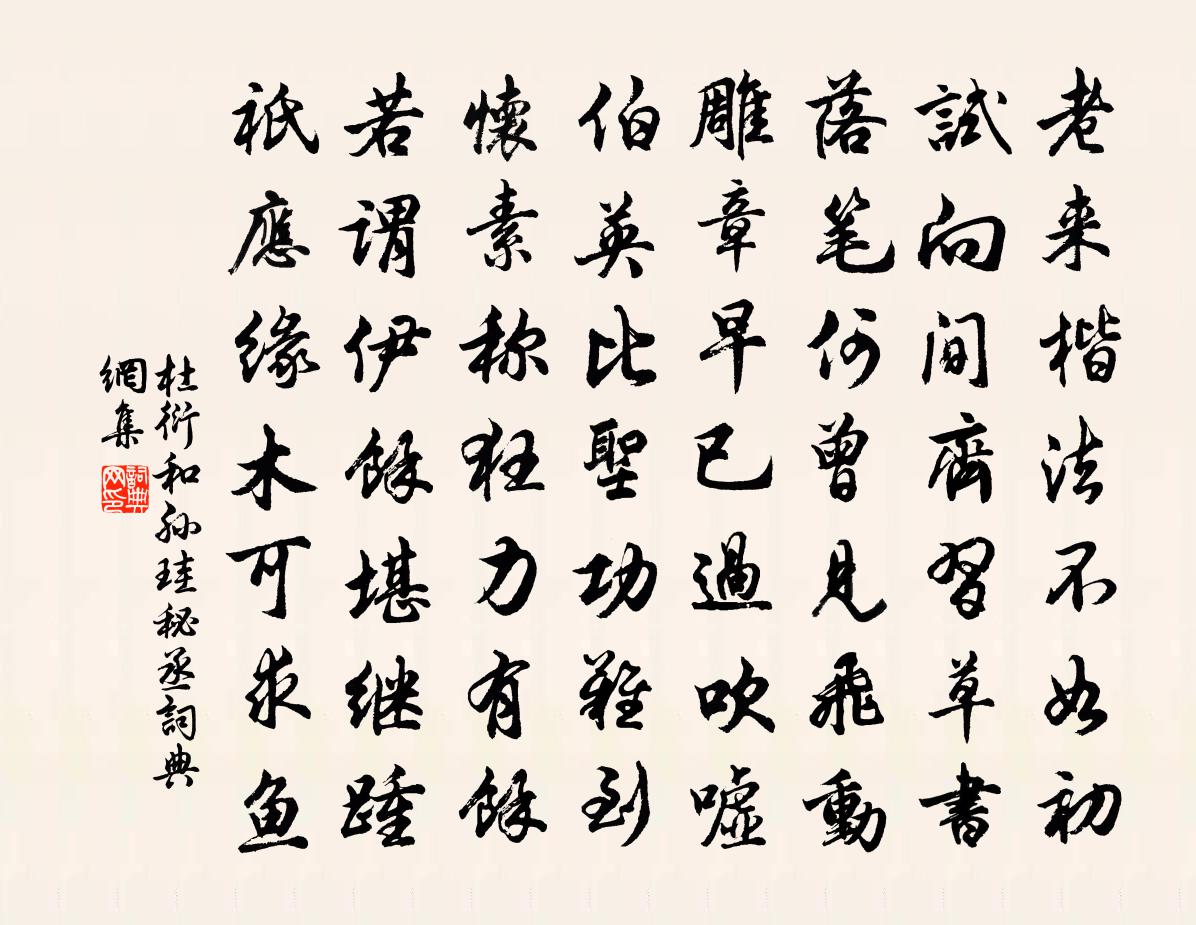 詩詞名句歷史字典書法欣賞書法字典國語詞典說文解字康熙字典古漢語字典標 題 作 者 詩 句 和孫珪秘丞作者:杜衍 朝代:宋代和孫珪秘丞原文老來楷法不如初,試向間齊習草書。落筆何曾見飛動,雕章早已過吹噓。伯英比聖功難到,懷素稱狂力有餘。若謂伊余堪繼踵,祇應緣木可求魚。詩詞問答問:和孫珪秘丞的作者是誰?答:杜衍問:和孫珪秘丞寫於哪個朝代?答:宋代杜衍和孫珪秘丞書法欣賞和孫珪秘丞書法作品詩詞推薦井上枸杞架孟郊〔唐代〕深鎖銀泉甃,高葉架雲空。不與凡木並,自將仙蓋同。影疏千點月,聲細萬條風。迸子鄰溝外,飄香客位中。花杯遇仙亭 繼重陽韻馬鈺〔元代〕喜喜蓬頭。達達根由。永永誓不貪求。漸漸歸於正覺,申申燕處優遊。萬萬塵緣識破,專專志做持修。遇遇風仙傳曉過吳縣洪邁〔宋代〕舟行有嚴程,越國常曉發。雙艪兀殘夢,起坐窺落月。人家岸野水,霧雨籠邃闥。遙憐瑣窗人,欹枕聽嘔軋。送僧釋重顯〔宋代〕知方流古意,雲樹別諸鄰。月不澄微水,山應立是塵。靜空孤鶚遠,高柳一蟬新。欲究勞生問,歸思莫厭頻。癸未至節以病晚起走筆戲書紀事排悶十首方回〔宋代〕此老誰能畫,蒙頭一破巾。有杯常設客,無局不饒人。仆醉鄰翁怒,兒啼乳媼嗔。佯聾付一笑,莫漫耗精神。贈鄭員外陶翰〔唐代〕驄馬拂繡裳,按兵遼水陽。西分雁門騎,北逐樓煩王。聞道五軍集,相邀百戰場。風沙暗天起,虜騎森已行。儒服送黃從政宰晉江蘇頌〔宋代〕泉山南望海之濱,家樂文儒里富仁。弦誦多於鄒魯俗,綺羅不減蜀吳春。懷章近輟樞廷傑,制錦重紆學館人。豈獨虞美人(七夕)吳儆〔宋代〕飛橋駕鵲天津闊。雲馭看看發。相思惟恨不相逢。及至相逢還是、去匆匆。垂絲插竹真堪笑。欲乞天孫巧。天孫多龍花寺主家小尼白居易〔唐代〕頭青眉眼細,十四女沙彌。夜靜雙林怕,春深一食飢。步慵行道困,起晚誦經遲。應似仙人子,花宮未嫁時。雨中宿靈峰寺陳與義〔宋代〕雁盪山中逢晚雨,靈峰寺里借繩床。只應護得綸巾角,還費高僧一炷香。清明釋斯植〔宋代〕堤上尋春步較遲,馬嘶芳草燕差池。南樓煙雨清明日,正是佳人墮淚時。西江月(書懷)陳著〔宋代〕老去坐來睡重,病多吟得詩慳。有時忽自拍闌乾。一點心隨天遠。柳絮飛從何處,鶯聲啼破空山。春風依舊滿人間潤州狠石石延年〔宋代〕水光浮柱礎,天影帶樓台。觸石雲孤起,吹潮雨四來。晚泛草塘有魚入舟呼童膾之適見瑞蓮駢植與客方岳〔宋代〕草塘晚泛亦佳哉,誰為貧謀獻膾才。自入船來銀潑刺,且留客共月徘徊。不須溪友投竿線,徑與詩人上酒杯。著意九隴津集盧照鄰〔唐代〕落落樹陰紫,澄澄水華碧。復有翻飛禽,裴回疑曳舄。峽中即事廉氏〔唐代〕清秋三峽此中去,鳴鳥孤猿不可聞。一道水聲多亂石,四時天色少晴雲。日暮泛舟溪漵口,那堪夜永思氛氳。題棲鳳亭四首白玉蟾〔宋代〕亭前綠密玉成叢,鳳宿枝頭煙雨空。簫管一聲人未寢,滿林明月浸清風。句諶祜〔宋代〕山花笑人人似醉,勸農文似天花墜。農今一杯回勸官,吏瘠民肥官有利。官休休,民休休,勸農文在牆壁頭。官此綠萼梅方蒙仲〔宋代〕楚楚碧霞裳,輕輕青玉履。三千一太真,道妝侍天子。夜遊宮陳允平〔宋代〕窄索樓兒傍水。漸秋到、漁村橘里。薄倖江南倦遊子。恣輕狂,戀高陽,歌酒市。獨自簾兒底。香羅帶、翠閒金墜名句推薦聞道梅花坼曉風,雪堆遍滿四山中。陸游《梅花絕句》 清風明月苦相思,盪子從戎十載餘。王維《伊州歌》 半死梧桐老病身,重泉一念一傷神。白居易《為薛台悼亡》 天上人間何處去,舊歡新夢覺來時,黃昏微雨畫簾垂。張曙《浣溪沙·枕障薰爐隔繡帷》 陽關萬里道,不見一人歸。庾信《重別周尚書》 人之初,性本善。性相近,習相遠。王應麟《三字經·全文》 十二峰頭秋草荒,冷煙寒月過瞿塘。何景明《竹枝詞·十二峰頭秋草荒》 入苑白泱泱,宮人正靨黃。李賀《同沈駙馬賦得御溝水》 榆柳蕭疏樓閣閒,月明直見嵩山雪。孟郊《洛橋晚望》 鴛鴦俱是白頭時,江南渭北三千里。賀鑄《惜余春·急雨收春》