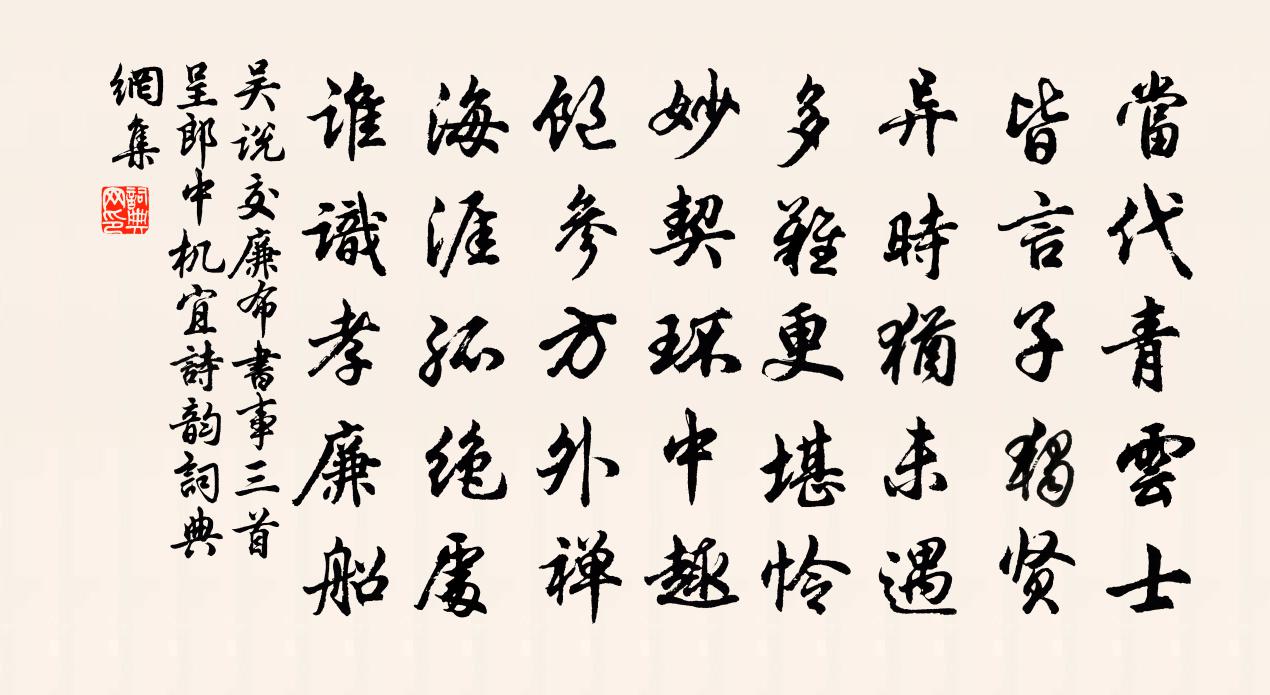 詩詞名句歷史字典書法欣賞書法字典國語詞典說文解字康熙字典古漢語字典標 題 作 者 詩 句 交廉布書事三首呈郎中機宜詩韻作者:吳說 朝代:宋代原文當代青雲士,皆言子獨賢。異時猶未遇,多難更堪憐。妙契環中趣,飽參方外禪。海涯孤絕處,誰識孝廉船。詩詞問答問:《交廉布書事三首呈郎中機宜詩韻》的作者是誰?答:吳說問:該詩寫於哪個朝代?答:宋代書法欣賞交廉布書事三首呈郎中機宜詩韻書法作品詩詞推薦出都來陳,所乘船上有題小詩八首,不知何人蘇軾〔宋代〕潁水非漢水,亦作蒲萄綠。恨無襄陽兒,令唱銅鞮曲。西園二首黃公度〔宋代〕清樾才十畝,炎陬別一天。華堂依怪石,老木插飛煙。長夏絕無暑,乘風幾欲仙。心閒境自勝,底處覓林泉。靈香閣呂希純〔宋代〕昔聞僧道開,清淨本求佛。談經悟教藏,施藥蠲眾疾。臨嶂起重閣,最上構禪室。靈香邈可繼,壯麗固已軼。桐廬此君室方蒙仲〔宋代〕人兮吾與游,竹兮吾與俱。世濁此獨清,室小自有餘。午頓白玉蟾〔宋代〕筍方合爪蕨擎拳,好與同參詩里禪。居士聞韶今已久,爐峰為我曉生煙。送周願判官歸嶺南姚系〔唐代〕早蟬望秋鳴,夜琴怨離聲。眇然多異感,值子江山行。由來重義人,感激事縱橫。往復念遐阻,淹留慕平生。晨奔韓昭侯徐鈞〔宋代〕敝袴囊中猶惜予,高門旱後忽興工。如何奢儉初終異,一相存亡事不同。長人詩胡仲弓〔宋代〕初長難掩膝,絕似漢金人。樓志幻全體。天丁現後身。眼高傾四海,力大引千鈞。手挽銀河水,來涓衣上塵。雜曲歌辭苦熱行僧齊己〔唐代〕離宮劃開赤帝怒,喝起六龍奔日馭。下土熬熬若煎煮,蒼生惶惶無處處。火雲崢嶸焚泬寥,東皋老農腸欲焦。何當謝人惠十色花箋並棋子齊己〔唐代〕陵州棋子浣花箋,深愧攜來自錦川。海蚌琢成星落落,吳綾隱出雁翩翩。留防桂苑題詩客,惜寄桃源敵手仙。捧受送刁紡戶掾太常下第范仲淹〔宋代〕精鑒本非深,英僚暫此沉。火炎方試玉,沙密偶遺金。豈累青雲器,猶孤白雪音。敢希蘇季子,潛有激儀心。行香子 問修行門戶劉志淵〔元代〕道體平平。瞽者難行。覓邊徼、執 * 精。貪游異路,昧卻前程。啟諸人,高著眼,認無生。湛湛澄澄,醞釀惺惺絕地楊備〔宋代〕列戟高門氣自雄,主人應是偶相逢。由來禍福皆人召,此地無辜喚作凶。謝重緣舊山水障子齊己〔唐代〕敢望重緣飾,微茫洞壑春。坐看終未是,歸臥始應真。已覺心中朽,猶憐四面新。不因公子鑒,零落幾成塵。送曾原伯運使歸會稽,用送徐叔智韻范成大〔宋代〕秧田水滿麥棲畝,勸農使者翩然去。去年愁苦救荒時,豈敢夢為今日歸。天津橋西官柳陌,文書燈火長相覓。江山上邠寧刑司徒賈島〔唐代〕箭頭破帖渾無敵,杖底敲球遠有聲。馬走千蹄朝萬乘,地分三郡擁雙旌。春風欲盡山花發,曉角初吹客夢驚。不是定叟弟生朝遣詩為壽張栻〔宋代〕我昔在嚴城,惟子桂林思。舊遊復更踐,相望仍今茲。行止不可期,會合何參差。況乃近重九,清杯憶同持。想子思婦吟蘇拯〔唐代〕秋風雁又歸,邊信一何早。攬衣出門望,落葉滿長道。一從秉箕帚,十載孤懷抱。可堪日日醉寵榮,不說思君令人偈頌十首釋德光〔宋代〕蓬萊有個李八伯,一對眼睛如漆黑。且莫錯認定盤星。冬日書事二首張耒〔宋代〕孤城已慘澹,晚色復朦朧。日動烏棲葉,雲開雁去風。草繁田尚綠,霜薄葉微紅。已是悲搖落,那堪歲更窮。名句推薦君獨不見長城下,死人骸骨相撐拄。陳琳《飲馬長城窟行》 不義不昵,厚將崩。左丘明《左傳·隱公·隱公元年》 我歌君起舞,潦倒略相同。陳師道《除夜對酒贈少章》 雪岸叢梅發,春泥百草生。杜甫《陪裴使君登岳陽樓》 輕陰池館水平橋,一番弄雨花梢。陳子龍《畫堂春·雨中杏花》 亦有白骨歸鹹陽,營家各與題本鄉。王建《渡遼水》 白雁亂飛秋似雪,清露生涼夜。吳西逸《清江引·秋居》 惻隱之心,人皆有之孟子《孟子·告子章句上·第六節》 樂極生悲,否極泰來。施耐庵《水滸傳·第二十六回》 夕陽閒淡秋光老,離思滿蘅皋柳永《少年游·參差煙樹灞陵橋》