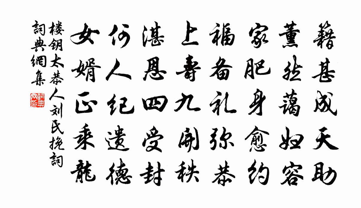 詩詞名句歷史字典書法欣賞書法字典國語詞典說文解字康熙字典古漢語字典標 題 作 者 詩 句 太恭人劉氏輓詞作者:樓鑰 朝代:宋代太恭人劉氏輓詞原文籍甚成天助,薰然藹婦容。家肥身愈約,福備禮彌恭。上壽九開秩,湛恩四受封。何人紀遺德,女婿正乘龍。詩詞問答問:太恭人劉氏輓詞的作者是誰?答:樓鑰問:太恭人劉氏輓詞寫於哪個朝代?答:宋代樓鑰太恭人劉氏輓詞書法欣賞太恭人劉氏輓詞書法作品詩詞推薦賦婺州之錄參廳明遠樓為李中甫董奇卿作也姜特立〔宋代〕腳蹴南樓咫尺間,手摩八詠境全慳。東西合抱兩溪水,遠 * 分千里山。但見孤鴻渺天際,更無野馬隘人寰。一時洞仙歌(壽中甫)劉辰翁〔宋代〕也曾海上,啖如瓜大棗。海上歸來相公老。畫堂深、滿引明月清風,家山好、一笑塵生蓬島。六年春易過,贏得清秋晚雜興陸游〔宋代〕煙波萬頃鏡湖秋,清嘯雖聞不可求。自是世間知者少,山林何代乏巢由?酬黎居士淅川作(曇壁上人院走筆成)王維〔唐代〕儂家真箇去,公定隨儂否。著處是蓮花,無心變楊柳。松龕藏藥裹,石唇安茶臼。氣味當共知,那能不攜手。八十吟十絕劉克莊〔宋代〕誠翁僅有四千首,惟放翁幾滿萬篇。老子胸中有殘錦,問天乞與放翁年。次韻梅花四首陳棣〔宋代〕得得尋梅已覺遲,憑欄空賦惜花詩。流傳遠信人千里,漏泄春工雪一枝。照水丰容妃子浴,傍山瘦影伯夷飢。最憐讀馮道傳鄭起〔宋代〕西山有薇,二子采之。二子竟死,薇不療飢。匪惡周粟,食不下咽。君臣義重,彼蒼者天。爾道何人,數主一身。小重山(別情)趙善扛〔宋代〕汲水添瓶恰換花。蜂兒爭要采,打窗紗。青春誰與度年花。弦索暗,無緒幾曾拿。春思正交加。馬蹄聲錯認,客還寄謝李雪林顧逢〔宋代〕日本僧高誼,勞君序拙吟。名雖傳海外,價不及雞林。白髮消豪氣,青燈見苦心。豈無鍾子耳,但欠伯牙琴。浣溪沙·伏雨朝寒愁不勝納蘭性德〔清代〕伏雨朝寒愁不勝,那能還傍杏花行。去年高摘斗輕盈。漫惹爐煙雙袖紫,空將酒暈一衫青。人間何處問多情。嘉禾百詠跨塘橋張堯同〔宋代〕路接張涇近,塘連谷水長。一聲清鶴唳,片月在滄浪。正紀誕辰輒成三絕句為壽所謂壽者非世俗之壽郭印〔宋代〕中冬蟾彩八分圓,可是人間誕謫仙。怪得心光吞萬象,鐫鑱造化付詩篇。秋懷十首汪莘〔宋代〕秋雲無復似春濃,天地何人到此窮。斜日淡煙今古恨,如何都付與孤鴻。寄審知並屬彥博三首趙蕃〔宋代〕病榻論詩罷,僧輿趨駕歸。倦書疏竹几,多夢繞湖扉。赤葉霜前墜,黃花雨後稀。直堪凋鬢髮,何只減腰圍。觀書梅堯臣〔宋代〕山陽女子大字書,不比常流事梳洗。親傳筆法中郎孫,妙作蠶頭魯公體。試寫麻牋滑似苔,黑蛟矯矯秋潭底。行不由徑俞簡〔唐代〕古人心有尚,乃是孔門生。為計安貧樂,當從大道行。詎應流遠跡,方欲料前程。捷徑雖雲易,長衢豈不平。後來再用前韻袁甫〔宋代〕本是塵中詩興微,秋風偶折最高枝。詩壇方築那言去,為我留連百首詩。寄松坡胡仲弓〔宋代〕別去京華又一霜,懷人心事莫雲長。高樓不見青山面,明月偏來照屋樑。湖海歸深難久駐,乾坤許大任行藏。書生石留趙文〔宋代〕江流湯湯,日夜不休。瞿塘灩澦,屹然不流。人心人心,反覆難任。昨日朱絲琴,今日白頭吟。南真觀謝諤〔宋代〕人煙一簇古溪頭,竹樹低昂映碧流。曳杖不知山路檢,南真觀里謁浮丘。名句推薦調角斷清秋,征人倚戍樓。張喬《書邊事》 花近高樓傷客心,萬方多難此登臨。杜甫《登樓》 就解佩旗亭,故人相遇。吳文英《掃花游·西湖寒食》 映階碧草自春色,隔葉黃鸝空好音。杜甫《蜀相》 酒肆人間世,琴台日暮雲。杜甫《琴台》 記得別伊時,桃花柳萬絲。納蘭性德《菩薩蠻·新寒中酒敲窗雨》 中庭月色正清明,無數楊花過無影。張先《木蘭花·乙卯吳興寒食》 齊唱憲王春樂府,金梁橋外月如霜。李夢陽《汴京元夕》 置酒長安道,同心與我違。王維《送綦毋潛落第還鄉 / 送別》 移風易俗,莫善於樂。孔子及其弟子《孝經·廣要道》