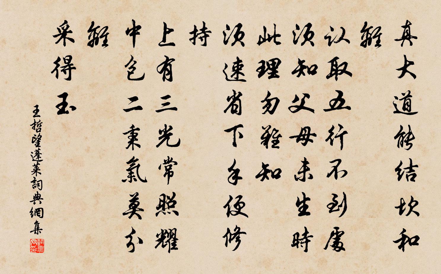 詩詞名句歷史字典書法欣賞書法字典國語詞典說文解字康熙字典古漢語字典標 題 作 者 詩 句 望蓬萊作者:王哲 朝代:元代望蓬萊原文真大道,能結坎和離。認取五行不到處,須知父母未生時。此理勿難知。須速省,下手便修持。上有三光常照耀,中包二秉氣莫分離。採得玉詩詞問答問:望蓬萊的作者是誰?答:王哲問:望蓬萊寫於哪個朝代?答:元代問:望蓬萊是什麼體裁?答:詞王哲望蓬萊書法欣賞望蓬萊書法作品詩詞推薦送顏韶(得飛字)岑參〔唐代〕遷客猶未老,聖朝今復歸。一從襄陽住,幾度梨花飛。世事了可見,憐君人亦稀。相逢貪醉臥,未得作春衣。淳熙二年發太上皇帝太上皇后冊寶十一首佚名〔宋代〕天畏遐福,允彰父慈。維昔曠典,我能舉之。徐爾陟降,敬爾威備。申錫無疆,永言保之。中秋夜半後無雲而月色微淡尤為絕景陸游〔宋代〕輕煙薄靄九霄寒,素月渾如隔縠看。此夕洞庭應更好,誰能從我跨青鸞?清平樂張炎〔宋代〕百花開後。一朵疑堆繡。絕色年年常似舊。因甚不隨春瘦。脂痕淡約蜂黃。可憐獨倚新妝。太白醉游何處,定應忘黃州呈趙使君孫應時〔宋代〕雪堂老居士,赤壁故將軍。蘭舟醉煙月,羽扇麾風雲。登臨生感慨,江空水沄沄。從公一長嘯,神遊儻相聞。八聲甘州(中秋小集無月)李曾伯〔宋代〕問孀娥、僝僽厭看人,唯復厭人看。正涼宵準擬,招延素魄,慰藉蒼顏。廉纖梧桐細雨,吹徹玉簫寒。仿佛山河影讀書柳宗元〔唐代〕幽沉謝世事,俯默窺唐虞。上下觀古今,起伏千萬途。遇欣或自笑,感戚亦以吁。縹帙各舒散,前後互相逾。瘴痾送張嘉父長官蘇軾〔宋代〕都城昔傾蓋,駿馬初服輈。再見江湖間,秋鷹已離鞲。於今三會合,每進不少留。豫章既可惜,瑚璉誰當收。微官對殘春劉滄〔唐代〕楊花漠漠暗長堤,春盡人愁鳥又啼。鬢髮近來生處白,家園幾向夢中迷。霏微遠樹荒郊外,牢落空城夕照西。唯有酬趙侍御王建〔唐代〕年少同為鄴下游,閒尋野寺醉登樓。別來衣馬從勝舊,爭向邊塵滿白頭。送大淵宰安溪七言三首劉克莊〔宋代〕御堦人看放班回,誰記乾淳舊事哉。進卷已嘗觀所主,聞弦上欲老其才。割雞必待民謠著,峨豸多由縣譜來。莫道武康邑中劉王廟董嗣杲〔宋代〕水圍聚落藹藤纏,靈紀金刀祀典專。碑語誰非年月誤,神功自托道途傳。三鄉捐廩祈多福,百里齋香卜有年。爭怪秋山寄陳讜言王昌齡〔唐代〕岩間寒事早,眾山木已黃。北風何蕭蕭,茲夕露為霜。感激未能寐,中宵時慨慷。黃蟲初悲鳴,玄鳥去我梁。獨臥跋東坡木張元乾〔宋代〕玉局老仙天下人,平生愛與石傳神。長江絕島風濤里,千古常令墨色新。朝中措(安人生日·三之一)張綱〔宋代〕年時生日宴高堂。歡笑擁爐香。今日山前停棹,也須隨分飛觴。東陽太守,攜家遠去,方溯桐江。把酒祝君長健,木蘭花慢(客贈牡丹)劉克莊〔宋代〕維摩居士室,晨有鵲、噪檐聲。排闥者誰歟,冶容袨服,寶髻珠瓔。疑是毗耶城裡,那天魔、變作散花人。姑射神別源釋紹曇〔宋代〕不續曹溪正脈,支分一派朝宗。弘滿清涼窟宅,春雷變化魚龍。幼圃蒲橋寓居,庭有刳方而實以土者。小孫子楊萬里〔宋代〕寓舍中庭劣半弓,鷰泥為圃石為墉。瑞香萱草一兩本,蔥葉蔊苗三四叢。稚子落成小金谷,蝸牛卜築別珠宮。也思觀物丘葵〔宋代〕氣聚則明施,氣散則明匿。孰能知其妙,聚散乃為客。法象乃糟糠,真機乃虛寂。太哉無方體,是謂神與易。臨江仙(慶謝操生子)郭應祥〔宋代〕憶我歸舟初系岸,君家盛事先知。後房深處第三姬。熊羆符吉兆,鷲鷟產佳兒。袞袞慶源真未艾,謝蘭還茁新枝。名句推薦青青河畔草,綿綿思遠道。佚名《飲馬長城窟行》 佳游不可得,春風惜遠別。李白《登梅岡望金陵贈族侄高座寺僧中孚》 來掃千山雪,歸留萬國花。袁枚《春風》 待到重陽日,還來就菊花。孟浩然《過故人莊》 伯牙鼓琴,志在高山佚名《伯牙鼓琴/伯牙絕弦》 粉黛暗愁金帶枕,鴛鴦空繞畫羅衣,那堪辜負不思歸!顧敻《浣溪沙·雲淡風高葉亂飛》 漸紅濕杏泥,愁燕無語。吳文英《掃花游·西湖寒食》 是故江河不惡小谷之滿己也,故能大。聖人者,事無辭也,物無違也,故能為天下器。墨子《墨子·01章 親士》 梨花自寒食,進節只愁余。楊萬里《寒食上冢》 不見又思量,見了還依舊。李之儀《謝池春·殘寒銷盡》