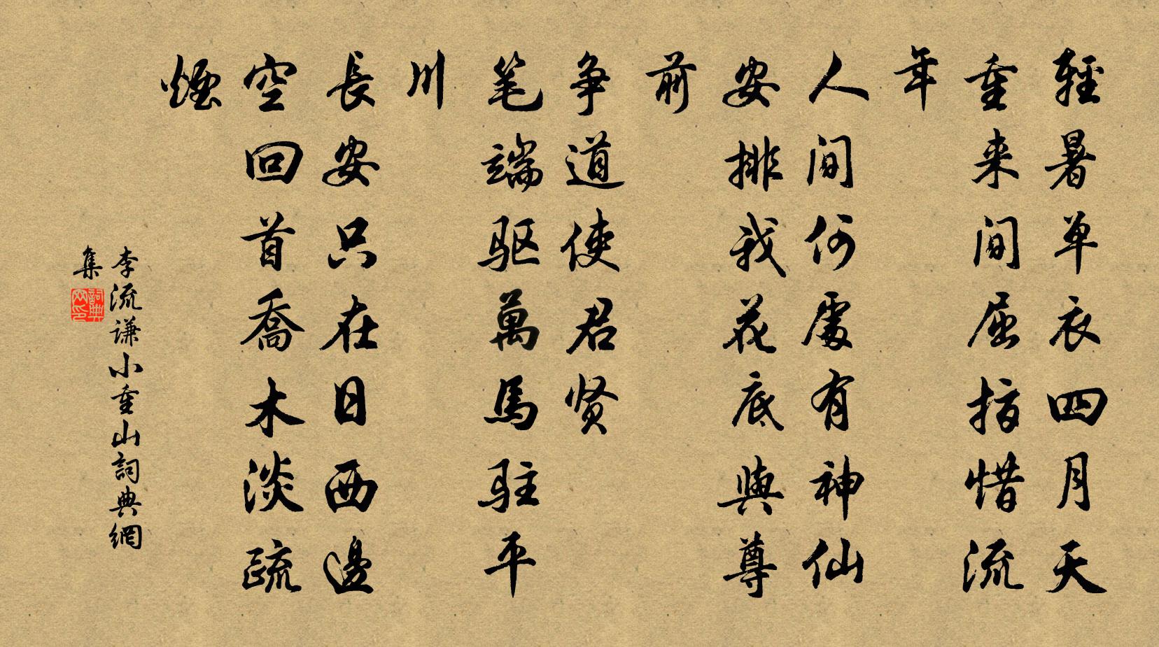 詩詞名句歷史字典書法欣賞書法字典國語詞典說文解字康熙字典古漢語字典標 題 作 者 詩 句 小重山作者:李流謙 朝代:宋代小重山原文輕暑單衣四月天。重來間屈指,惜流年。人間何處有神仙。安排我,花底與尊前。爭道使君賢。筆端驅萬馬,駐平川。長安只在日西邊。空回首,喬木淡疏煙。詩詞問答問:小重山的作者是誰?答:李流謙問:小重山寫於哪個朝代?答:宋代問:小重山是什麼體裁?答:詞李流謙小重山書法欣賞小重山書法作品詩詞推薦題金粟洞胡仲弓〔宋代〕名山洞府三十六,若擬帽峰猶未足。有人曾此坐丹爐,有人曾此安碁避。一朝悟道歸去來,依舊紫雲鎖林屋。武榮白雪歌送武判官歸京岑參〔唐代〕北風捲地白草拆,胡天八月即飛雪。忽如一夜春風來,千樹萬樹梨花開。散入珠簾濕羅幕,狐裘不暖錦衾薄。將軍送徐成之通判永寧軍孔武仲〔宋代〕少年意氣橫寥廓,淬拭龍泉出鋒鍔。人情俱欲向長安,天語新令倅河朔。霜風冽冽吹邊州,青驄駿馬錦貂裘。也知拌毫筆李石〔宋代〕管城無別派,毛族競分支。公子兔三穴,大夫羊五皮。端能開句眼,未肯畫愁眉。若問結繩祖,先從六畫推。歸田(時三十七)元稹〔唐代〕陶君三十七,掛綬出都門。我亦今年去,商山淅岸村。冬修方丈室,春種桔槔園。千萬人間事,從茲不復言。嚴鄭公宅同詠竹(得香字)杜甫〔唐代〕綠竹半含籜,新梢才出牆。色侵書帙晚,陰過酒樽涼。雨洗娟娟淨,風吹細細香。但令無剪伐,會見拂雲長。偈頌六十八首釋法薰〔宋代〕兔馬有角,牛關無角。不知不會,事同一家。多見多聞,千差萬別,畢竟天無第二月。東湖晚步洪恩橋海棠洞三首陳杰〔宋代〕百花洲前萬柳堤,一川紅綠醉春時。樓台忽斷見西爽,鶯燕正深聞子規。羅敷媚(二之二)陳師道〔宋代〕芙蓉不借韶華助,故著緗黃。宿面留妝。不出寒花只暫香。傷春不盡悲秋苦,落蕊浮觴。知在誰傍。一笑盈盈百種愚人食鹽僧伽斯那〔南北朝〕昔有愚人,至於他家。主人與食,嫌淡無味。主人聞已,更為益鹽。既得鹽美,便自念言:“所以美者,緣有鹽故清平樂(楊侯書院聞酒所奏樂)張孝祥〔宋代〕油幢畫戟。玉鉉調春色。動閥諸郎俱第一。風流前輩敵。玉人雙鞚華睪。翠雲深處消搖。有客留君東闔,時聞風雜詩二十七首曹勛〔宋代〕一山孤秀隱溪雲,溪影涵光隔世紛。松竹徑深涼意透,衣巾不覺午風薰。游維山新興寺,宿石屏村謝叟家許渾〔唐代〕晚過石屏村,村長日漸曛。僧歸下嶺見,人語隔溪聞。谷響寒耕雪,山明夜燒雲。家家扣銅鼓,欲賽魯將軍。望江南/憶江南王琪〔宋代〕江南酒,何處味偏濃。醉臥春風深巷裡,曉尋香旆小橋東。竹葉滿金鍾。檀板醉,人麵粉生紅。青杏黃梅朱閣上,三將軍歌並序張維屏〔清代〕三將軍,一姓葛,兩姓陳,捐軀報國皆忠臣。英夷犯粵寇氛惡,將軍奉檄守沙角。奮前擊賊賊稍卻,公奮無如兵力錦屏山圖釋文珦〔宋代〕錦屏山勢舞雙鸞,影入嘉陵江水寒。人在東南歸未得,時時獨展畫圖看。送單丙文先生歸沅州徐璣〔宋代〕傅得臨池訣,勤勞敢遽忘。錐沙惟是正,舞劍本非狂。舊隱尋芳芷,離懷對碧湘。寸心長記面,不似隔他鄉。和舍弟中秋月黃庭堅〔宋代〕高秋搖落四十五,清都早霜凋桂叢。纖塵不隔四維淨,寒光獨照萬象中。少年氣與節物競,詩豪酒聖難爭鋒。桓伊示高台足庵紹印胡寅〔宋代〕萬生紛綸墮迷綱,誰能自拔起情想。隙塵初傍陰色空,燒草又趁春風長。將身出家參佛祖,此病中作膏肓養。足庵題畫蘭鄭燮〔清代〕蘭草已成行,山中意味長。 堅貞還自抱,何事斗群芳。名句推薦彊弩之極,矢不能穿魯縞;衝風之末,力不能漂鴻毛。司馬遷《史記·七十列傳·韓長孺列傳》 洛陽城裡春光好,洛陽才子他鄉老。韋莊《菩薩蠻》 克城以武,戡亂以仁。張廷玉《明史·本紀·卷一》 孤花片葉,斷送清秋節。納蘭性德《清平樂·孤花片葉》 兒童強不睡,相守夜歡嘩。蘇軾《守歲》 半天涼月色,一笛酒人心。袁枚《夜過借園見主人坐月下吹笛》 風暖有人能作伴,日長無事可思量。楊基《浣溪沙·上巳》 滄浪之水清兮,可以濯我纓;佚名《滄浪歌》 非知之難,行之為難;非行之難,終之斯難。吳兢《貞觀政要·卷十·論慎終》 悠悠洛陽道,此會在何年。陳子昂《春夜別友人二首·其一》