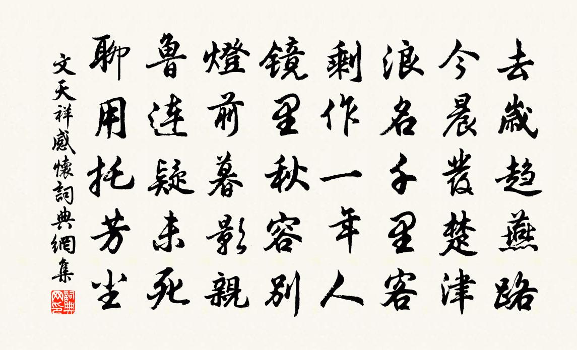 詩詞名句歷史字典書法欣賞書法字典國語詞典說文解字康熙字典古漢語字典標 題 作 者 詩 句 感懷作者:文天祥 朝代:宋代感懷原文去歲趨燕路,今晨發楚津。浪名千里客,剩作一年人。鏡里秋容別,燈前暮影親。魯連疑未死,聊用托芳塵。詩詞問答問:感懷的作者是誰?答:文天祥問:感懷寫於哪個朝代?答:宋代問:文天祥的名句有哪些?答:文天祥名句大全文天祥感懷書法欣賞感懷書法作品詩詞推薦紹興親享明堂二十六首佚名〔宋代〕耳聽鋗玉,目瞻熉珠。樂人周奏,們參漢圖。神人來況,天地同符。亦既見帝,王心則愉。上史魏公壽三首孫應時〔宋代〕中書考已敵汾陽,神氣清明骨更強。客倒壺觴弄風月,酒闌燈火事文章。傳家正有書千卷,積慶真成笏一床。看取西江月王庭珪〔宋代〕一拂退黃衫子,幾團嗅芯蜂兒。西風吹下月中枝。種在寒岩影里。人道蠟梅相似,又傳菊滿東籬。饒伊顏色入時宜驟雨記所見趙蕃〔宋代〕翠篠蕭騷入屋寒,欻驚平地起風湍。馴除飢雀低飛去,弱羽毰毸似畏彈。聞長安庚子歲事徐夤〔唐代〕羽檄交馳觸冕旒,函關飛入鐵兜鍪。皇王去國未為恨,寰海失君方是憂。五色大雲凝蜀郡,幾般妖氣撲神州。唐堯殘句背之不見與無同蘇軾〔宋代〕背之不見與無同。和利州鮮于轉運公劇八詠會景亭司馬光〔宋代〕景物浩無窮,茲為一都會。之人心若鑒,萬狀靜相對。喬林擁砌底,修嶺倚窗背。流雲過席上,去鳥出天外。徐徐春晚圃田道中三首晃沖之〔宋代〕度柳穿橋聽午雞,一溝春水國門西。行人不用傷新別,看取塵間萬馬蹄。智果寺觀東坡墨跡參寥泉徐集孫〔宋代〕煮茗評詩歲月深,堂堂遺像篆煙沉。數間老屋關興廢,一段清名無古今。碑斷亂雲封字腳,井昏落葉覆泉心。斜陽句劉爚〔宋代〕雲影猶帶濕,日光初漏明。湯村逢陳安性晁補之〔宋代〕束裝清曉來江浦,瘦馬羸童犯山雨。解鞍入寺聞鐘聲,堂上僧齋日初午。故人聆我足音喜,紗帽相逢坐東廡。別來曉詠歐陽修〔宋代〕簾外星辰逐斗移,紫河聲轉下雲西。九雛烏起城將曙,百尺樓高月易低。露裛蘭苕惟有淚,秋荒桃李不成蹊。西堂江寧夾口三首王安石〔宋代〕茅屋滄洲一酒旗,午煙孤起隔林炊。江清日暖蘆花轉,只似春風柳絮時。臨江仙蘇軾〔宋代〕九十日春都過了,貪忙何處追游。三分春色一分愁。雨翻榆莢陣,風轉柳花球。閬苑先生須自責,蟠桃動是千秋。和漁具十絕牟巘五〔宋代〕即此暗庚冰,醉棹舞波面。何似宮亭湖,為我覓如原。詠燈韓偓〔唐代〕高在酒樓明錦幕,遠隨漁艇泊煙江。古來幽怨皆銷骨,休向長門背雨窗。春雪吳仁璧〔唐代〕雪霽凝光入坐寒,天明猶自臥袁安。貂裘穿後鶴氅敝,自此風流不足看。織婦處默〔唐代〕蓬鬢蓬門積恨多,夜闌燈下不停梭。成縑猶自陪錢納,未直青樓一曲歌。得潮州楊相公繼之書並詩以此寄之白居易〔唐代〕詩情書意兩殷勤,來自天南瘴海濱。初睹銀鉤還啟齒,細吟瓊什欲沾巾。鳳池隔絕三千里,蝸舍沉冥十五春。唯有賀聖朝(雙調)張先〔宋代〕淡黃衫子濃妝了。步縷金鞋小。愛來書幌綠窗前,半和嬌笑。謝家姊妹,詩名空杳。何曾機巧。爭如奴道,春來情名句推薦春山煙欲收,天淡星稀小牛希濟《生查子·春山煙欲收》 胭脂淚,相留醉,幾時重。李煜《相見歡·林花謝了春紅》 不覺碧山暮,秋雲暗幾重。李白《聽蜀僧濬彈琴 / 聽蜀僧浚彈琴》 命由我作,福自己求。袁黃《了凡四訓·立命之學》 梅似雪,柳如絲。試聽別語慰相思。辛棄疾《鷓鴣天·送歐陽國瑞入吳中》 驟雨過,珍珠亂撒,打遍新荷。元好問《驟雨打新荷》 生而知之;或學而知之;或困而知之:及其知之,一也。子思《中庸·第二十章》 江水漾西風,江花脫晚紅。王安石《江上》 九曲黃河萬里沙,浪淘風簸自天涯。劉禹錫《浪淘沙·九曲黃河萬里沙》 君子動而世為天下道,行而世為天下法,言而世為天下則。子思《中庸·第二十九章》