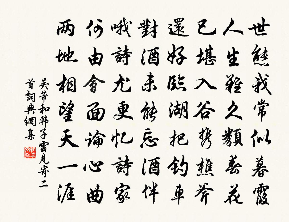 詩詞名句歷史字典書法欣賞書法字典國語詞典說文解字康熙字典古漢語字典標 題 作 者 詩 句 和韓子云見寄二首作者:吳芾 朝代:宋代和韓子云見寄二首原文世態我常似暮霞,人生難久類春花。已堪入谷攜樵斧,還好臨湖把釣車。對酒未能忘酒伴,喔詩尤更憶詩家。何由會面論心曲,兩地相望天一涯。詩詞問答問:和韓子云見寄二首的作者是誰?答:吳芾問:和韓子云見寄二首寫於哪個朝代?答:宋代吳芾和韓子云見寄二首書法欣賞和韓子云見寄二首書法作品詩詞推薦慶元二年恭上太皇太后皇太后太上皇帝太上皇佚名〔宋代〕上帝有赫,百靈效祥。儲祉垂恩,錫年降康。皇持睟溫,帝躬肅莊。三宮齊民,地久天長。牧童歌十首蒲壽宬〔宋代〕前山飛暮雨,牛上展青蓑。回首牛呼犢,哀音兒唱歌。贈海上觀音院文依上人李中〔唐代〕煙霞海邊寺,高臥出門慵。白日少來客,清風生古松。虛窗從燕入,壞屐任苔封。幾度陪師話,相留到暮鍾。劉向徐鈞〔宋代〕忠言歷歷總成虛,二十餘年列大夫。未死已知他日禍,此身幸不見新都。池鶴八絕句。鶴答鳶白居易〔唐代〕無妨自是莫相非,清濁高低各有歸。鸞鶴群中彩雲里,幾時曾見喘鳶飛?寓杭久無詩長至後偶賦懷歸五首呈仁仲實方回〔宋代〕嚴灘合問紫陽津,誤簉西湖寂寞濱。老子通身唯是骨,梅梢作意為誰春。飽更世故全如夢,慣忍霜寒最益人。莫笑玉連環/一落索賀鑄〔宋代〕別酒更添紅粉淚。促成愁醉。相逢淺笑合微吟,撩惹到、 * 地。花下解攜重附耳。佳期深記。青翰舟穩繡衾香,新竹趙蕃〔宋代〕新竹不數輩,歲慳非地貧。破苔方挺出,突屋已長身。未害少為貴,居同德有鄰。山中乏朋友,舍爾復誰親。戊戌與彭元忠相別於安城丙午皆為東廣幕屬遂曾豐〔宋代〕同郡同年五弟兄,兩人猶幸竊餘生。要閒莫苦追名路,得健休冤落選坑。一別九年頭半白,三城重見眼增明。相從夢入禪林有老宿方升座或雲通悟禪師也陸游〔宋代〕塵埃車馬何憧憧,獐頭鼠目厭妄庸。樂哉夢見德人容,巍巍堂堂人中龍。舉頭仰望太華峰,攝衣欲往路無從。忽然南山下舊居閒放張九齡〔唐代〕祗役已雲久,乘閒返服初。塊然屏塵事,幽獨坐林閭。清曠前山遠,紛喧此地疏。喬木凌青靄,修篁媚綠渠。耳和秋日寄吟友杜荀鶴〔唐代〕閒坐細思量,唯吟不可忘。食無三畝地,衣絕一株桑。蟬樹生寒色,漁潭落曉光。青雲舊知己,未許釣滄浪。京師逢賣梅花五首梅堯臣〔宋代〕此去吾鄉二千里,不看素萼兩三年。移根種子誰辛苦,上苑偷來值幾錢。次韻子夷兄弟十首張耒〔宋代〕經時不飲酒,廩薄人口眾。人閒多是非,不敢盜鄰瓮。二公洛陽日,想見飲屢痛。行求放湖海,種秫代官俸。謹次十七叔去鄭詩韻二章以寄家叔一章以自詠陳與義〔宋代〕蚍蜉堪笑亦堪憐,撼樹無功更怫然。賦就柳州聊解祟,詩成彭澤要歸田。身謀共悔蛇安居,理遣須看佛舉拳。懷祖篔簹谷文同〔宋代〕池通一谷波溶溶,竹合兩岸煙蒙蒙。尋幽直去景漸野,宛爾不似在塵中。頌古九十八首釋印肅〔宋代〕何處無雲不是門,藏鋒不露理難論。雪峰未盡玄沙意,惹得村人村又村。題郭恕先雪霽江行圖樓鑰〔宋代〕妙絕丹青郭恕先,幻成雪霽大江船。沿流更飽輕帆舉,上水仍勞百丈牽。捩柂長年渾欲動,褰帷佳客若將仙。侍親蝶戀花黃人傑〔宋代〕問訊梅花開也未。孕雪┭香,春在寒梢尾。試與折來供一醉。壽鄉容與生春意。律轉黃鍾霜小霽。月姊乘鸞,伴我挽張梅坦二首陳著〔宋代〕同飲嵩溪水,綢繆況有連。心期天地闊,情話歲時遷。一病幫三暑,長歸竟九泉。誰知之子憾,薛鳳定翩翩。名句推薦年年今夜,月華如練,長是人千里。范仲淹《御街行·秋日懷舊》 士雖有學,而行為本焉。墨子《墨子·02章 修身》 十輪霜影轉庭梧,此夕羈人獨向隅。晏殊《中秋月》 明月如霜,好風如水,清景無限。蘇軾《永遇樂·彭城夜宿燕子樓》 冰,水為之,而寒於水。荀子《勸學》 不似秋光,只與離人照斷腸。蘇軾《減字木蘭花·春月》 寒雨連江夜入吳,平明送客楚山孤。王昌齡《芙蓉樓送辛漸》 白雲映水搖空城,白露垂珠滴秋月。李白《金陵城西樓月下吟》 君子而詐善,無異小人之肆惡;君子而改節,不若小人之自新。洪應明《菜根譚·概論》 淡泊以明志,寧靜而致遠。羅貫中《三國演義·第三十七回》