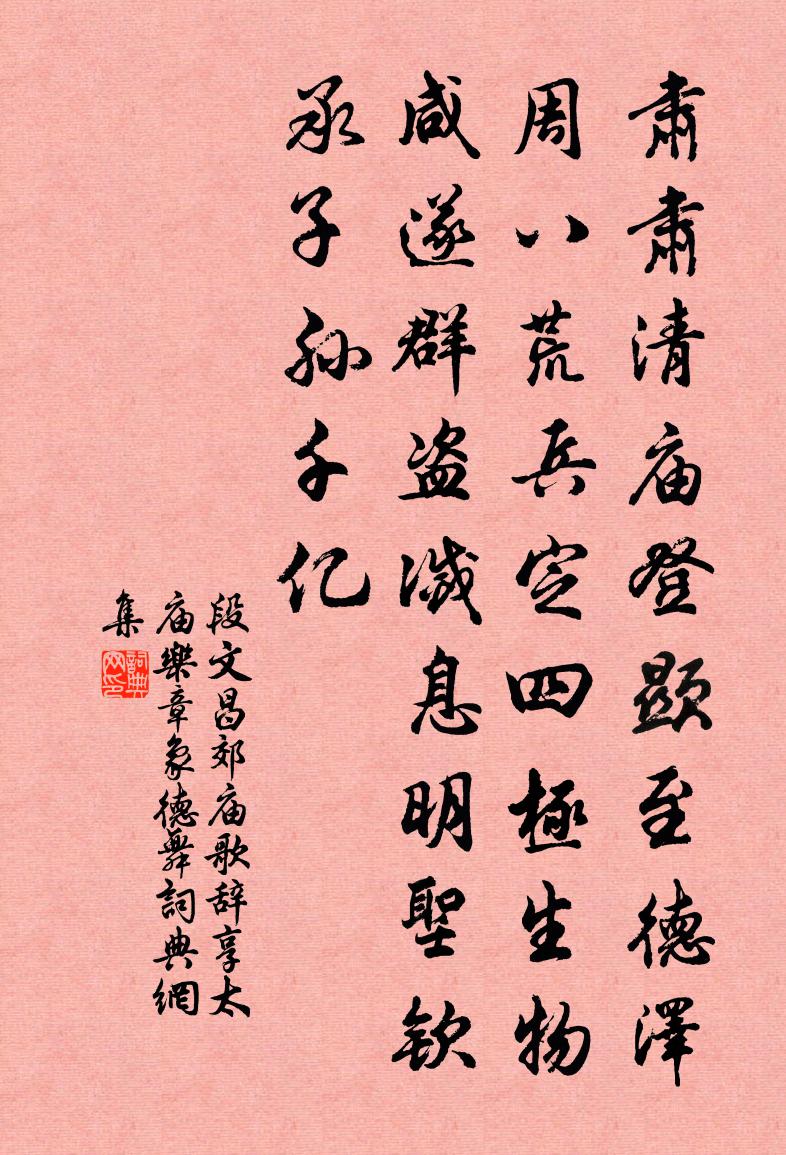 詩詞名句歷史字典書法欣賞書法字典國語詞典說文解字康熙字典古漢語字典標 題 作 者 詩 句 郊廟歌辭。享太廟樂章。象德舞作者:段文昌 朝代:唐代原文肅肅清廟,登顯至德。澤周八荒,兵定四極。生物鹹遂,群盜滅息。明聖欽承,子孫千億。詩詞問答問:《郊廟歌辭。享太廟樂章。象德舞》的作者是誰?答:段文昌問:該詩寫於哪個朝代?答:唐代問:該詩是什麼體裁?答:樂府書法欣賞郊廟歌辭。享太廟樂章。象德舞書法作品注釋全唐詩:卷13_68詩詞推薦題奣岩何揚祖〔宋代〕石室何時霹靂開,曾聽繡斧凱歌回。誰知二百餘年後,復有旌旗笳鼓來。代書寄宋州錢大監徐鉉〔唐代〕衰配經煩暑,慵將病共侵。北窗時企足,東望一披襟。秘監清罇滿,平台綠樹深。年來書信少,保以慰離心。送李道士歸山崔峒〔唐代〕秋城臨古路,城上望君還。曠野入寒草,獨行隨遠山。授人鴻寶內,將犬白雲間。早晚燒丹罷,遙知冰雪寒。呈摺子明丈十首趙蕃〔宋代〕兒時已見葆真詩,寫誦抄藏不憚疲。白首始游衡岳寺,扶藜處處讀苔碑。送途中舍監韶州錢監梅堯臣〔宋代〕孤青水上石,片白蒼梧雲。虞舜不可見,簫韶不可聞。君為漢錢官,鑿山取銅礦。韶石不生銅,留為千古景。酬次李辰甫所寄三首吳說〔宋代〕近知盡室入煙霞,兒女甘貧慣食鮭。方外何人差可友,歲闌底處定為家。江城潮盛漫秋鹵,驛道風高卷霽沙。子拾書事趙蕃〔宋代〕山溪急宵舂,野市赴朝糴。人言非踴貴,富者猶露積。豐年且不飽,惡歲真可豐。懸釜以待炊,衾裯寧許直。次韻陳勉仲登群山觀王之道〔宋代〕十年放江湖,親朋益疏散。不知跬步間,遊覽有奇觀。因君寄新詩,心目益淒斷。東城俯荻洲,下有魚鳥亂。想見示俞秀老二首王安石〔宋代〕君詩何以解人愁,初日紅蕖碧水流。未怕元劉妨獨步,每思陶謝與同游。按行府城通判張太博有詩美山川風俗因繼作宋祁〔宋代〕百尺譙城一憑欄,提封占盡古常山。公私雨足耕疇遍,赤白囊空寒候閒。撥剌河魴供大嚼,含糊趙瑟勸酡顏。正應高士詠嚴君平吳筠〔唐代〕漢皇舉遺逸,多士鹹已寧。至德不可拔,嚴君獨湛冥。卜筮訓流俗,指歸暢玄經。閉關動元象,何必游紫庭。五言玩初月重遊聯句顏真卿〔唐代〕春溪與岸平,初月出谿明。 ——張薦璧彩寒仍潔,金波夜轉清。 ——李崿孤光遠近滿,練色往來輕。 ——顏宴後題府中水堂贈盧尹中丞(昔予為尹日創造之)白居易〔唐代〕水齋歲久漸荒蕪,自愧甘棠無一株。新酒客來方宴飲,舊堂主在重歡娛。莫言楊柳枝空老,直至櫻桃樹已枯。[府浪淘沙·好恨這風兒石孝友〔宋代〕好恨這風兒,催俺分離!船兒吹得去如飛,因甚眉兒吹不展?叵耐風兒!不是這船兒,載起相思?船兒若念我孤恓小園儲泳〔宋代〕墾葦栽花柳,園林小小成。旋分 * 本,新偏草堂名。池水通湖活,江風過竹清。不期車馬到,足自稱幽情。句游酢〔宋代〕青山控野雙門壯,白浪排空萬馬來。古意張碧〔唐代〕鑾輿不碾香塵滅,更殘三十六宮月。手持紈扇獨含情,秋風吹落橫波血。菩薩蠻 寄都下友人許有壬〔元代〕憑高日望金台路。黃沙盡處空煙樹。歲晚足蕭疏。雁聲無夜無。簿書臨俗態。人道儒酸在。何以慰相思。半年無好句賴仙翁〔宋代〕一條丁水銅魚塞,三十年來舊相識。巧妙四山雲岫落,玲瓏雙甑月燈明。寶山流連井,久立方知省。送陸暢歸江南(暢娶董溪女)韓愈〔唐代〕舉舉江南子,名以能詩聞。一來取高第,官佐東宮軍。迎婦丞相府,夸映秀士群。鸞鳴桂樹間,觀者何繽紛。人事名句推薦鳥銜野田草,誤入枯桑里。李白《樹中草》 煙蘿翠竹,欠羅袖、為倚天寒日暮。吳文英《絳都春·余往來清華池館六年賦詠屢矣感昔傷今益不堪懷乃復作此解》 危樓高百尺,手可摘星辰。李白《夜宿山寺》 待到黃昏月上時,依舊柔腸斷。程垓《卜運算元·獨自上層樓》 高詞迥映,如朗月之懸光;疊意回舒,若重岩之積秀。房玄齡《晉書·列傳·第二十四章》 朝作輕寒暮作陰,愁中不覺已春深。屈大均《壬戌清明作》 紛披乍依迥,掣曳或隨風。李世民《詠興國寺佛殿前幡》 待約個梅魂,黃昏月淡,與伊深憐低語。柳如是《金明池·詠寒柳》 林中有奇鳥,自言是鳳凰。阮籍《詠懷八十二首·其七十九》 惱他香閣濃睡,撩亂有啼鶯。晏殊《訴衷情·東風楊柳欲青青》