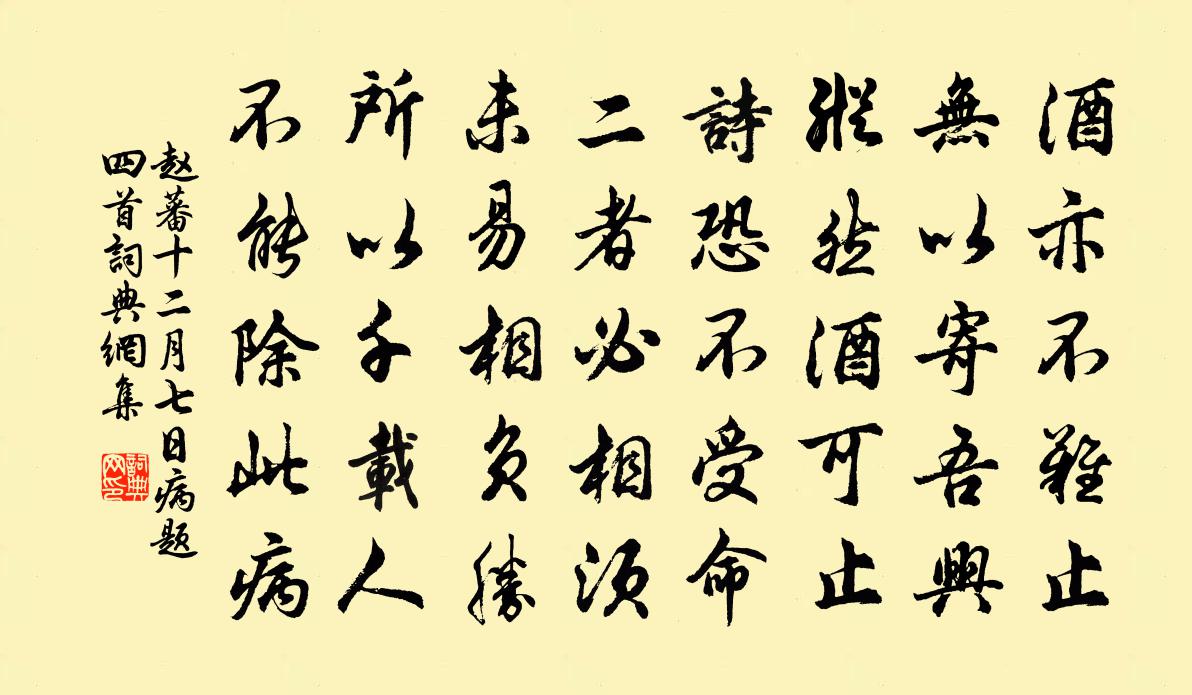 詩詞名句歷史字典書法欣賞書法字典國語詞典說文解字康熙字典古漢語字典標 題 作 者 詩 句 十二月七日病題四首作者:趙蕃 朝代:宋代十二月七日病題四首原文酒亦不難止,無以寄吾興。縱然酒可止,詩恐不受命。二者必相須,未易相負勝。所以千載人,不能除此病。詩詞問答問:十二月七日病題四首的作者是誰?答:趙蕃問:十二月七日病題四首寫於哪個朝代?答:宋代趙蕃十二月七日病題四首書法欣賞十二月七日病題四首書法作品詩詞推薦和答黃時舉貢士獻黃草布孫應時〔宋代〕九陌塵中一笑看,肯隨風月倒遙山。應知枕石先秋冷,何羨槃氷及夏頒。古意佇衣仍縞帶,襟期華發更蒼顏。多君送東上人釋道璨〔宋代〕上頭上面得人憎,少見生獰個樣僧。莫道無又輕放過,病來無力舉烏藤。贈韋秘書子春李白〔唐代〕谷口書鄭子真,書躬耕在岩書石。高名書動京師,天下皆籍籍。斯人竟不起,雲臥從所適。苟無濟代心,獨善亦何句李燾〔宋代〕斷碑唐日寺,遺像晉時僧。元宵王鎡〔宋代〕柳院春歸雪未乾,試燈歌巷月痕寒。懶隨翠影紅香走,自買梅花插燭看。和王瞻叔泉字韻吳芾〔宋代〕暮年亦復侍甘泉,每對青茼只自憐。寧忍憂疑探虎穴,且將得失付魚筌。歸來但欲無身累,老去那能徇世緣。若得鵲橋仙 贈可行弟許有壬〔元代〕花香滿院,花陰滿地。夜靜月明風細。南坡一室小如舟,都斂盡、山林清致。竹簾半卷,柴門不閉。好個暮春天氣次韻裴仲謨和何先輩二首秦觀〔宋代〕聞說何郎操行端,蕭然環堵若為安。鳥啼花發阻攜手,水遠山高空憑欄。別後想多黃絹作,春來尤厭惠文彈。兩章書感陸游〔宋代〕人生百憂坐一官,況與群飛接羽翰。兩具吳牛給耕足,三間茅屋著身寬。焄蒿悽愴會不免,簡儉寂默差可安。康莊句曾幾〔宋代〕紅皺解羅襦處,清香開玉肌時。題趙秀才壁陳造〔宋代〕日日危亭憑曲欄,幾層蒼翠擁煙鬟。連朝策馬沖雲去,儘是亭中望處山。菩薩蠻張元乾〔宋代〕天涯客里秋容晚。妖紅聊戲思鄉眼。一朵醉深妝。羞渠照鬢霜。開時誰斷送。不待司共花。有腳號陽春。芳菲屬主送微文章釋重顯〔宋代〕雙蓮亭上送行客,菡萏清香散秋色。野興斷山雲片高,孤影澄江月華白。希聲險絕堪誰知,大道機存曾未可。縱闢劉子履少聊輓辭二首張鎡〔宋代〕釋和書上已經年,敵騎南來果犯邊。太息龜靈成底事,漫聞鴻寶得家傳。平生喜踏天山雪,晚歲愁看瘴浦煙。務實次韻千岩雜謠姜夔〔宋代〕平生中散七不堪,鳳塵時時伴燕談。道士有神傳火棗,故人無字入雲藍。雨涼竹葉宜三酌,日落荷花倚半酣。極欲宿牡羊二絕李流謙〔宋代〕古柳維舟帶暝陰,夜寒剪剪到衣棱。客中不覺年華換,小市人家已試燈。獻同年孔郎中林寬〔唐代〕炊瓊爇桂帝關居,賣盡寒衣典盡書。驅馬每尋霜影里,到門常在鼓聲初。蟾枝交彩清蘭署,鸞佩排光映玉除。一顧芄蘭佚名〔先秦〕芄蘭之支,童子佩觿。雖則佩觿,能不我知。容兮遂兮,垂帶悸兮。芄蘭之葉,童子佩韘。雖則佩韘,能不我甲。三月三日李廌〔宋代〕柳眼脫殼花將飛,麥梢弄黃青穗肥。鵓鴣翩翩避舟去,燕泥悞落沾人衣。樹外浮陽湖水淥,漠漠不動含晴暉。沙暖野寺病居喜盧綸見訪李端〔唐代〕青青麥壟白雲陰,古寺無人新草深。乳燕拾泥依古井,鳴鳩拂羽歷花林。千年駁蘚明山履,萬尺垂蘿入水心。一臥名句推薦一朝哭都市,淚盡歸田畝。元結《農臣怨》 憐君片雲思,一棹去瀟湘。杜牧《送薛種游湖南》 回樂烽前沙似雪,受降城外月如霜。李益《夜上受降城聞笛》 十有五而志於學,三十而立,四十而不惑,五十而知天命,六十而耳順,七十而從心所欲,不逾矩。孔子弟子《論語·為政篇》 心心視春草,畏向階前生。王維《雜詩三首 / 雜詠三首》 舉觴酹先酒,為我驅憂煩。柳宗元《飲酒》 何日功成名遂了,還鄉,醉笑陪公三萬場。蘇軾《南鄉子·和楊元素時移守密州》 水滿池塘花滿枝。亂香深里語黃鸝。趙令疇《浣溪沙·水滿池塘花滿枝》 巴子城頭青草暮。巴山重疊相逢處。張先《漁家傲·和程公辟贈》 形不正者,德不來;中不精者,心不冶。正形飾德,萬物畢得管仲《管子·心術下》