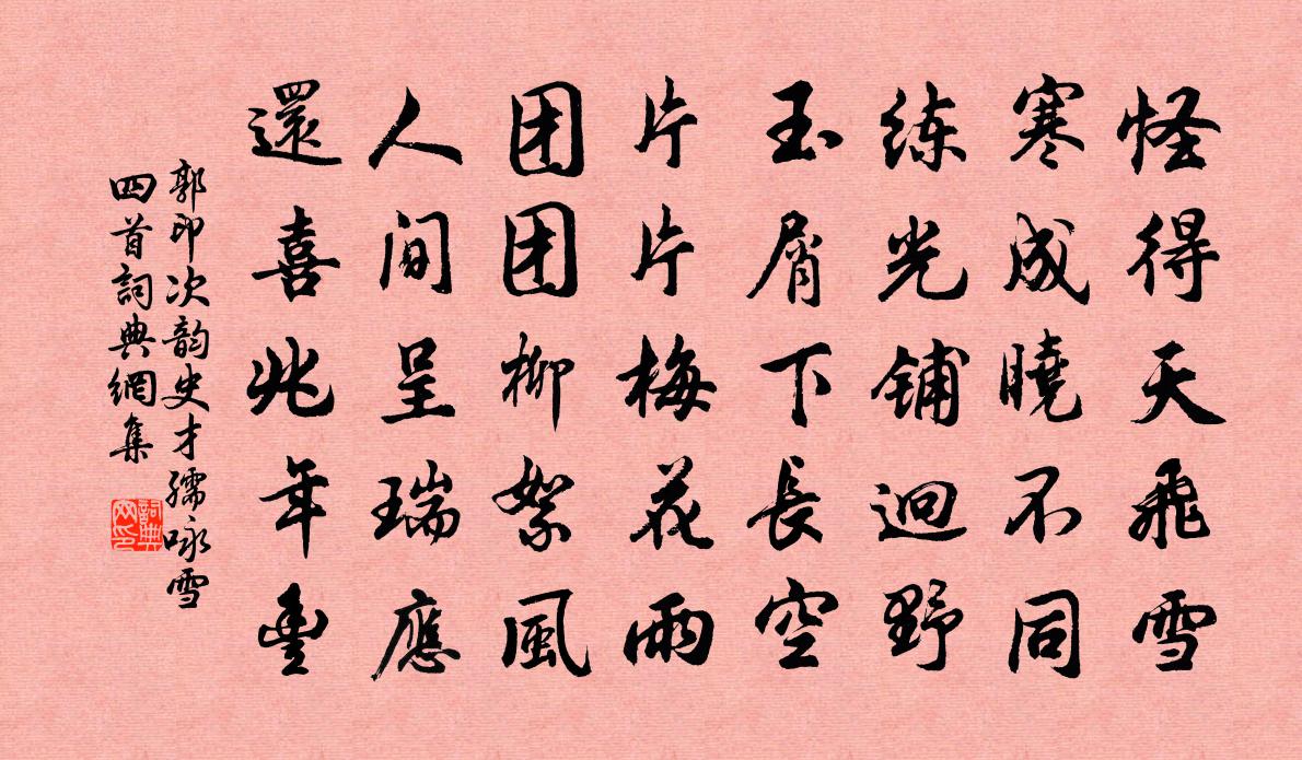 詩詞名句歷史字典書法欣賞書法字典國語詞典說文解字康熙字典古漢語字典標 題 作 者 詩 句 次韻史才孺詠雪四首作者:郭印 朝代:宋代次韻史才孺詠雪四首原文怪得天飛雪,寒成曉不同。練光鋪迥野,玉屑下長空。片片梅花雨,團團柳絮風。人間呈瑞應,還喜兆年豐。詩詞問答問:次韻史才孺詠雪四首的作者是誰?答:郭印問:次韻史才孺詠雪四首寫於哪個朝代?答:宋代郭印次韻史才孺詠雪四首書法欣賞次韻史才孺詠雪四首書法作品詩詞推薦范致能以詩求二色桃再次韻二首周必大〔宋代〕翰墨場中蔡少霞,如今悟徹頌桃花。看朱成碧吾方眩,試把橫枝問作家。雜興王昌齡〔唐代〕握中銅匕首,紛銼楚山鐵。義士頻報仇, * 不曾缺。可悲燕丹事,終被狼虎滅。一舉無兩全,荊軻遂為血。誠知入夏黎廷瑞〔宋代〕入夏才幾日,新晴已不禁。闌珊花晚景,掩映樹初陰。西照山河影,南風天地心。物情殊可笑,團扇已騃騃。蘭陵王(為十年故人作)高觀國〔宋代〕鳳簫咽。花底寒輕夜月。蘭堂靜,香霧翠深,曾與瑤姬恨輕別。羅巾淚暗疊。情人歌聲怨切。殷勤意,欲去又留,官舍夢歸南湖張鎡〔宋代〕林野相望不隔關,夢魂逕到豈為難。恍如天上飛升客,忘卻人間走俗官。岸桂直通籠鶴檻。水葓斜倚釣魚竿。覺來唐享太廟樂章。永和佚名〔唐代〕眇嘉樂,授靈爽。感若來,思如往。休氣散,迴風上。返寂寞,還惚恍。懷靈駕,結空想。郊廟歌辭。晉朝饗樂章。舉酒佚名〔唐代〕大明御宇,至德動天。君臣慶會,禮樂昭宣。劍佩成列,金石在懸。椒觴再獻,寶曆萬年。再次韻呈張守陳造〔宋代〕朋舊攜持過陋棲,炊香淪雪鱠拖泥。酒澆礧磈聊娛老,詩愬酸寒最切題。種秫集功今有約,對棋銷日不嫌迷。千奴上張丞相十首張元乾〔宋代〕閩粵諸侯地,春風盡去思。三年歌德政,萬戶繪生祠。位極聊方伯,謀深必帝師。待 * 社稷,四海被恩私。題刊匠圖書冊方岳〔宋代〕黃金漢鼎青錯落,綠玉秦璽紅屈蟠。龍翔鳳翥入刀筆,寶晉山林風月寒。上己三首楊萬里〔宋代〕雨冷風酸數日強,老懷不可更禁當。春寒幸自歸將去,喚取重來是海棠。又題霅隴墳庵衛宗武〔宋代〕斗大山庵歷幾春,茂林豐草綠初勻。青山繚繞猶列戟,玉澗縈迴似曳紳。新竹羽成雛鳳尾,古松鱗長老龍身。吾年贈黃降自宜城赴官許昌曾鞏〔宋代〕所學從誰得最完,豫間新出已難攀。不搖聲利心能定,欲正哇淫手自刪。潁水珠璣來席上,鄢城桃李在人間。高齋臨江仙 壽程雪樓張伯淳〔元代〕白雪樓前清畫,新來喜事連綿。朱明綠暗麥秋天。繡衣何日去,丹荔已香傳。前夜團圓明月好,清光流照華筵。錦又答趙象獨坐(一作寄贈蟬錦香囊)佚名〔唐代〕無力嚴妝倚繡櫳,暗題蟬錦思難窮。近來贏得傷春病,柳弱花欹怯曉風。新河袁說友〔宋代〕路轉風回四面歌,新河磨盡磨盤河。一川漲碧分灘遠,萬柳排青夾岸多。此日經行空嘆息,當年功績未鐫磨。客游菩薩蠻(照溪)侯置〔宋代〕江梅占盡江頭雪。忍寒玉骨夸清絕。不似杜秋娘。婆娑秋水傍。波光涵晚日。照影從教密。隱隱認遙黃。隔溪十里酹江月 次李壽卿侍西軒先生九日賞菊蒲道源〔元代〕暮秋天氣,似堪悲、還有一般堪悅。憔悴黃花風露底,香韻自能招客。手當紅牙,觴飛急羽,且為酬佳節。龍山依句釋曉瑩〔宋代〕薄飯粗繒老此生。次韻張十七九日贈子由蘇軾〔宋代〕千戈萬槊擁篦籬,九日清樽豈復持。(是日南都敕使按兵。)官事無窮何日了,菊花有信不吾欺。逍遙瓊館真堪羨名句推薦已向丹霞生淺暈,故將清露作芳塵。睦石《玉蘭》 昔日芙蓉花,今成斷根草。李白《妾薄命》 秋夜訪秋士,先聞水上音。袁枚《夜過借園見主人坐月下吹笛》 小來思報國,不是愛封侯。岑參《送人赴安西》 如來不應以具足諸相見。鳩摩羅什譯《金剛經·離色離相》 吃著碗裡看著鍋里曹雪芹《紅樓夢·第十六回》 人閒桂花落,夜靜春山空。王維《鳥鳴澗》 只因一著錯,滿盤俱是空。馮夢龍《醒世恆言·卷八》 言必有主,行必有法,親人必有方。戴聖《大戴禮記·曾子立事第四十九》 人生天地之間,若白駒之過隙,忽然而已。莊子《莊子·外篇·知北游》