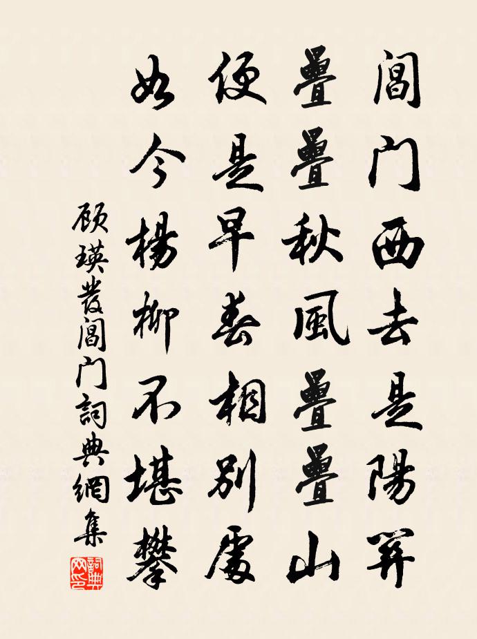 詩詞名句歷史字典書法欣賞書法字典國語詞典說文解字康熙字典古漢語字典標 題 作 者 詩 句 發閶門作者:顧瑛 朝代:元代發閶門原文閶門西去是陽關,疊疊秋風疊疊山。便是早春相別處,如今楊柳不堪攀。詩詞問答問:發閶門的作者是誰?答:顧瑛問:發閶門寫於哪個朝代?答:元代問:發閶門是什麼體裁?答:七絕顧瑛發閶門書法欣賞發閶門書法作品注釋元詩別裁集詩文賞析今春送於外史歸越上。詩詞推薦韓樞密夫人輓詞二首秦觀〔宋代〕天上開華屋,丘山忽返真。內人歸賵盛,挽者轉哀新。鸞詔初乾墨,魚軒已暗塵。藹然多德善,論次有蒼珉。行役有嘆二首楊萬里〔宋代〕去年丐西歸,謂可休餘生。今年復東下,駕言入神京。臥治方小安,趨召豈不榮。何如還家樂,醉吟聽溪聲。山中言事·欹枕亦吟行亦醉方乾〔唐代〕欹枕亦吟行亦醉,臥吟行醉更何營。貧來猶有故琴在,老去不過新發生。山鳥踏枝紅果落,家童引釣白魚驚。潛夫臨江仙蔡伸〔宋代〕繁杏枝頭蜂蝶亂,香風闔坐微聞。靚妝濃艷任東君。無情風雨,春事已平分。珍重主人留客意,夜闌秉燭開尊。何夏雲峰(聖節)曹勛〔宋代〕紹洪基,撫萬宇,中興寶運符千。樞電瑞繞,景命燕及雲天。挺生真主,平四海、復禹山川。班列立、瞻雲就日,謝尉西歸梅堯臣〔宋代〕曾為洛陽客,喜見洛陽人。每憶舊遊處,相逢借問頻。當時伊水上,醉弄岩花春。而今絕茲樂,欲語已酸辛。明朝學舍晝上宋祁〔宋代〕風射長廊雪絮春,經筵無客有流塵。捫心自問何功德,五管支離治繲人。好事近朱雍〔宋代〕春事為誰來,枝上半留殘雪。恰近小園香徑,對霜林寒月。危闌淒斷笛聲長,吹到偏嗚咽。最好短亭歸路,有行人送修撰楊學士留守南京夏竦〔宋代〕畫船樵鼓忽東浮,留幕賓從候舳艫。宮裡銅魚勘門鑰,府中銀兔合軍符。鳴騶苑路人千騎,送客河橋酒百壺。莫為送殷中丞游邊項斯〔唐代〕話別無長夜,燈前聞曙鴉。已行難避雪,何處合逢花。野寺門多閉,羌樓酒不賒。還須見邊將,誰擬靜塵沙。頌古釋守緣〔宋代〕世間無物可羅籠,獨立嵯峨萬仞峰。忽若有人猛推落,騰身雲外不留縱。贈畫士龔子陳造〔宋代〕古人論畫索畫外,世俗區區較形似。眼明亦有可人者,龔子畫形兼畫意。秋蘭春蕙相與芳,梅花照景勝暗香。倚煙幽園即事四首王洋〔宋代〕籬邊楊格似羅敷,裊裊娉娉十五餘。無賴風光相料理,忽看柯葉可藏烏。寄黃溪雲趙希桐〔宋代〕十年成遠別,幾度上高樓。風遞江南信,雲消渭北愁。春心驚海燕,曉夢入溪鷗。何日西窗燭,相看說舊遊。乾德以後祀感生帝十首佚名〔宋代〕三陽開律,萬彙勝精。既蘇崑蟲,畢達勾萌。具陳物象,式主誠明。錫以蕃祉,永保鹹平。萬秀才園齋宋祁〔宋代〕仁里樂丘園,茨茅構回軒。檻風叢篠密,畦雨晚菘繁。列岫非他境,疏流即故源。彥倫回駕日,於此愧驚猿。別濠樂主人丘葵〔宋代〕客中四月衣猶裌,桐下今年米似金。惘惘江山歸興動,悠悠歲月主恩深。三春已過仍淫雨,百事無緣空苦心。五十和陶淵明飲酒二十首方回〔宋代〕高台翳榛棘,荷鍤岡路開。振衣陟雲端,朗然豁秋懷。言念半死樹,類我晚節乖。風雷劈半腹,葉落禽不棲。幸不題惠泉師壁路振〔宋代〕漢公嘗說惠泉師,解講楞嚴解賦詩。今日我來師已支,草堂風雨立多時。古樂府釋斯植〔宋代〕攜君石上琴,彈我窗前月。月缺又還圓,誰能免離別。名句推薦望闕雲遮眼,思鄉雨滴心。白居易《陰雨》 能親仁,無限好,德日進,過日少。李毓秀《弟子規·親仁》 離情被橫笛,吹過亂山東。王安石《江上》 女也不爽,士貳其行。士也罔極,二三其德。佚名《氓》 社下燒錢鼓似雷,日斜扶得醉翁回。范成大《春日田園雜興》 君子不動而敬,不言而信。子思《中庸·第三十三章》 君思我、回首處,正江涵秋影雁初飛。辛棄疾《木蘭花慢·席上送張仲固帥興元》 不教而誅,則刑繁而邪不勝;教而不誅,則奸民不懲。荀子《荀子·富國》 桃根桃葉終相守,伴殷勤、雙宿鴛鴦。納蘭性德《一叢花·詠並蒂蓮》 何處合成愁。吳文英《唐多令·惜別》