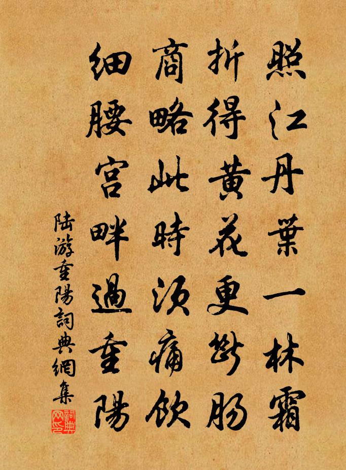 詩詞名句歷史字典書法欣賞書法字典國語詞典說文解字康熙字典古漢語字典標 題 作 者 詩 句 重陽作者:陸游 朝代:宋代重陽原文照江丹葉一林霜,折得黃花更斷腸。商略此時須痛飲,細腰宮畔過重陽。詩詞問答問:重陽的作者是誰?答:陸游問:重陽寫於哪個朝代?答:宋代問:陸游的名句有哪些?答:陸游名句大全陸游重陽書法欣賞重陽書法作品詩詞推薦詩酒陸游〔宋代〕酒隱凌晨醉,詩狂徹旦歌。憫憐蝸左角,嘲笑螘南柯。風月隨長笛,江湖入短蓑。平生會心處,最向漆園多。送人游玉泉寺齊己〔唐代〕西峰大雪開,萬疊向空堆。客貴猶尋去,僧高肯不來。潭澄猿覷月,竇冷鹿眠苔。公子將才子,聯題興未回。在軍中贈先還知己駱賓王〔唐代〕蓬轉俱行役,瓜時獨未還。魂迷金闕路,望斷玉門關。獻凱多慚霍,論封幾謝班。風塵催白首,歲月損紅顏。落雁過蕉塤楊萬里〔宋代〕楓葉乾余尚小紅,苕花飛盡不留茸。經旬欲雪還無雪,只作清寒惱殺儂。將之天長題新亭壁二首張耒〔宋代〕新亭登眺解征鞍,飛鳥悠揚雲意閒。誰謂塵埃無野興,故乘風雨看秋山。題西岩寺三絕裴大亮〔宋代〕□□□□送行人,山水清音益愴神。莫惜少留題石□,□□□□□紅塵。尚書打球小驄步驟最奇因有所贈徐夤〔唐代〕善價千金未可論,燕王新寄小龍孫。逐將白日馳青漢,銜得流星入畫門。步驟最能隨手轉,性靈多恐會人言。桃花風作方岳〔宋代〕年光何啻蛇赴壑,仕宦略如魚上竿。疇昔本無溫飽志,歸來只作等閒看。人間萬事風濤急,雨外一蓑天地寬。潮落金鳳鉤·送春晁補之〔宋代〕春辭我,向何處?怪草草、夜來風雨。一簪華發,少歡饒恨,無計殢春且住。春回常恨尋無路,試向我、小園徐步為游叔蕃覓苦椎羅公升〔宋代〕丘中有佳人,被褐抱白玉。百年老風雨,坐閱成毀速。霜余乃脫潁,磊落隱者屋。平生苦硬姿,卓爾受命獨。虞翻岳亭趙方〔宋代〕南嶽亭峰七十二,祝融峰直老人星。平生最有看山償,一上斯亭雙眼青。晚秋煙波文同〔宋代〕直於一丈素,寫盡千里景。雲山杳杳已成秋,煙水漻漻方入暝。君應無心得此畫,我豈有言能爾詠。金剛隨機無盡頌結實分主釋印肅〔宋代〕青山藏不得,走殺參禪客。拶破洛浦珠,面前光烜赫。訪潯陽友人不遇韋莊〔唐代〕不見安期悔上樓,寂寥人對鷺鷥愁。蘆花雨急江煙暝,何處潺潺獨棹舟?讀史羅公升〔宋代〕隋文偉姿相,談笑取周鼎。俘陳朝突厥,四海絕纖警。奈何梟獍禍,老不保腰領,不如臨春人,到此醉不醒。虎求百獸劉向〔兩漢〕荊宣王問群臣曰:“吾聞北方之畏昭奚恤也,果誠何如?”群臣莫對。江乙對曰:“虎求百獸而食之,得狐。狐曰代兒童作立春貼門詩三首范成大〔宋代〕剪采宜春勝,泥金祝壽幡。雪梅同雪鬢,相對兩凌寒。田氏南樓對月馬戴〔唐代〕主人同露坐,明月在高台。咽咽陰蟲叫,蕭蕭寒雁來。影搖疏木落,魄轉曙鍾開。倖免丹霞映,清光溢酒杯。王夫人輓詞樓鑰〔宋代〕閫內誰無助,夫人事特明。傾囊資色養,勉學就清名。遯世期高節,辭風嘆落英。丁寧猶在耳,伉儷若為情。雨後月下寄懷羊二十七資州竇群〔唐代〕夕霽涼飆至,翛然心賞諧。清光松上月,虛白郡中齋。置酒平生在,開衿願見乖。殷勤寄雙鯉,夢想入君懷。名句推薦昨夜江邊春水生,艨艟巨艦一毛輕。朱熹《活水亭觀書有感二首·其二》 鳥無聲兮山寂寂,夜正長兮風淅淅。李華《弔古戰場文》 遙知未眠月,鄉思在漁歌。杜荀鶴《送人游吳》 謙似乎諂,然謙是虛心,諂是媚心;故處世貴謙,而不可諂。王永彬《圍爐夜話·第四三則》 家有常業,雖飢不餓;國有常法,雖危不亡。韓非及後人《韓非子·飾邪》 疏籬曲徑田家小。雲樹開清曉。周邦彥《虞美人·疏籬曲徑田家小》 忘卻成都來十載,因君未免思量。蘇軾《臨江仙·送王緘》 神椎鑿石塞神潭,白馬參覃赤塵起。溫庭筠《拂舞詞 / 公無渡河》 霸圖今已矣,驅馬復歸來。陳子昂《燕昭王》 守真志滿,逐物意移。周興嗣《千字文·全文》