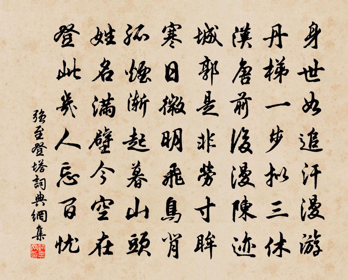詩詞名句歷史字典書法欣賞書法字典國語詞典說文解字康熙字典古漢語字典標 題 作 者 詩 句 登塔作者:強至 朝代:宋代登塔原文身世如追汗漫遊,丹梯一步擬三休。漢唐前後漫陳跡,城郭是非勞寸眸。寒日微明飛鳥背,孤煙漸起暮山頭。姓名滿壁今空在。登此幾人忘百憂。詩詞問答問:登塔的作者是誰?答:強至問:登塔寫於哪個朝代?答:宋代強至登塔書法欣賞登塔書法作品詩詞推薦題義節夫人傳吳說〔宋代〕國步阽危古所稀,曠無仗節不勝譏。得夫人輩戡多難,撥亂興衰亦庶幾。虞美人謝薖〔宋代〕人間離合常相半。璧月寧長滿。九秋風露又方闌。何日小窗相對、話悲歡。月華臨夜宜人醉。老去嗟顏悴。君如玉奉陪段相公晚夏登張儀樓李敬伯〔唐代〕層屋架城隈,賓筵此日開。文鋒摧八陣,星分應三台。望雪煩襟釋,當歡遠思來。披雲霄漢近,暫覺出塵埃。滕昌佑芙蓉文同〔宋代〕雙乾發寒葩,一枿立紋羽。欲品精妙人,君當二三數。望九華李曾伯〔宋代〕猶記午橋邊,曾吟太華蓮。浮生春夢耳,山色故人然。翠滴層巒雨,青橫一抹煙,何時身此境,濯我以清泉。歸自寸金堤繞城南轉至望涉樓下柳陰扶路草色項安世〔宋代〕十里河堤接郡城,城邊楊柳密於屏。行人盡日翠陰里,啼鳥數聲殘酒醒。七澤觀前無限草,高沙湖外一時青。斜陽獨步白玉蟾〔宋代〕月澹黃茅路,煙明紅葉村。有懷如阮籍,更贈一聲猿。感興五首次韻和李希孝四晁補之〔宋代〕不肯埽一室,顧欲天下清。少日又不羈,頗復鄉黨輕。長年始羞悔,耳目尚聰明。何須更市藥,小女故知名。奉酬樂道韓維〔宋代〕故人從我游,里{外門內千}非瀟湘。文章老益壯,欲掩李杜光。新詩來連翩,奔走獲與臧。調高豈能繼,愛重如村舍二首許渾〔唐代〕自翦青莎織雨衣,南峰煙火是柴扉。萊妻早報蒸藜熟,童子遙迎種豆歸。魚下碧潭當鏡躍,鳥還青嶂拂屏飛。花時池上春日林逋〔宋代〕一池春水綠於苔,水上花枝竹間開。芳草得時依舊長,文禽無事等閒來。年顏近老空多感,風雅含情苦不才。獨有鵲橋仙(贈鷺鸞)辛棄疾〔宋代〕溪邊白鷺。來吾告汝。溪里魚兒堪數。主人憐汝汝憐魚,要物我、欣然一處。白沙遠浦。青泥別渚。剩有蝦跳鰍舞正月十六日雪趙蕃〔宋代〕竹屋偏宜雪,江亭更受風。一杯時自酌,五字不須工。柳色全然未,梅花半墮空。東江雖可住,吾志在江東。趙湖州東園雜詠和人韻雋游陳文蔚〔宋代〕亭據高峰上上頭,登臨人世一漚浮。囂塵到此都遺盡,直欲乘風跨鶴游。同次道元日宿尚書省聽誓戒寄州邵不疑司馬光〔宋代〕椒花獻歲新,瑄玉侍祠頻。此夕同華省,非才愧後塵。江風迎苗旆,沙雨待朱輪。不比齋官冷,端居棄擲春。琵琶洲饒魯〔宋代〕潯陽江上譜無傳,化作沙汀越水邊。一段遺音人不識,夜深幽咽下灘泉。曾侍郎輓詞樓鑰〔宋代〕文獻南豐裔,源充曲阜公。岩岩雙法從,凜凜舊家風。金玉方交映,人琴忽併空。平生心地直,流慶尚無窮。多稼亭前小步楊萬里〔宋代〕櫻桃拋過隔牆莟,芍藥叢抽刺土芽。最是蜜蜂無意思,忍將塵腳蹈梅花。次韻王簽判陳造〔宋代〕奧學聞君不近名,聲華猶是壓時英。詩篇向我肯揮掃,句法驚人渾老成。未厭泛蓮依衛幕,只今薦鶚達周京。明朝太常引元好問〔金代〕東園歌管日相娛。佳釀出兵廚。陶寫在桑榆。便鶴到、揚州未如。欹紅濃露,綠陰清吹,長□下樓居。高枕即吾廬名句推薦翠華想像空山里,玉殿虛無野寺中。杜甫《詠懷古蹟五首·其四》 客睡何曾著,秋天不肯明杜甫《客夜》 他鄉生白髮,舊國見青山。司空曙《賊平後送人北歸》 蕭蕭落木不勝秋,莫回首、斜陽下。納蘭性德《一絡索·過盡遙山如畫》 城裡夕陽城外雪,相將十里異陰晴。王守仁《次韻陸僉憲元日春晴》 春風對青冢,白日落梁州。張喬《書邊事》 將受命之日則忘其家,臨軍約束則忘其親,援枹鼓之急則忘其身。司馬遷《史記·七十列傳·司馬穰苴列傳》 秋霜切玉劍,落日明珠袍李白《白馬篇》 莫失莫忘,仙壽恆昌。曹雪芹《紅樓夢·第八回》 那裡是清江江上村,香閨里冷落誰瞅問?好一個憔悴的憑欄人。關漢卿《大德歌·冬》