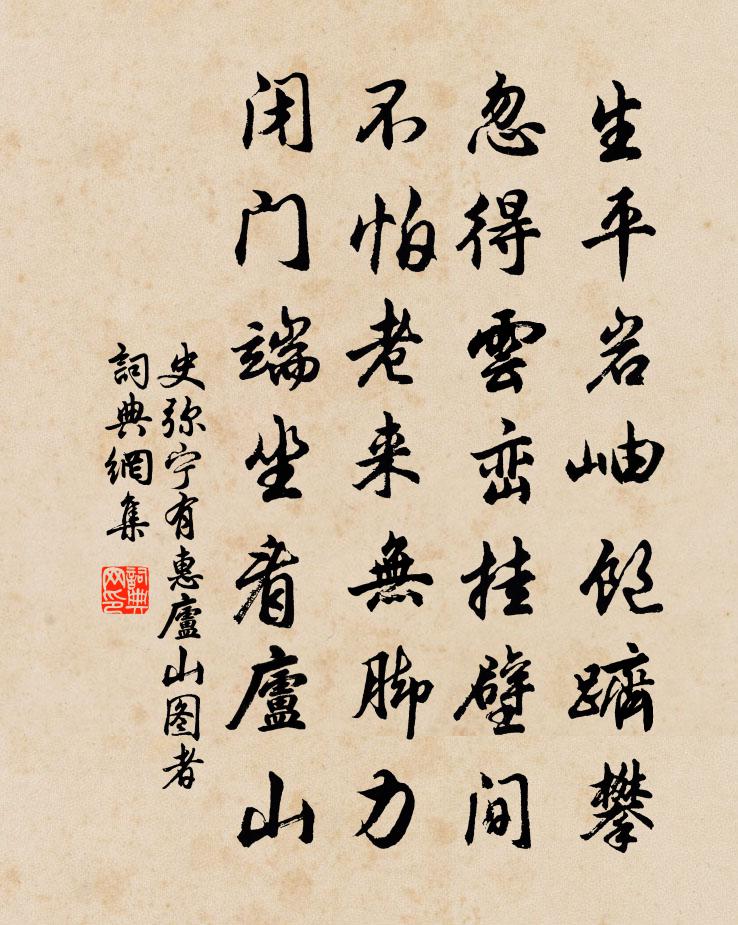 詩詞名句歷史字典書法欣賞書法字典國語詞典說文解字康熙字典古漢語字典標 題 作 者 詩 句 有惠廬山圖者作者:史彌寧 朝代:宋代有惠廬山圖者原文生平岩岫飽躋攀,忽得雲巒掛壁間。不怕老來無腳力,閉門端坐看廬山。詩詞問答問:有惠廬山圖者的作者是誰?答:史彌寧問:有惠廬山圖者寫於哪個朝代?答:宋代史彌寧有惠廬山圖者書法欣賞有惠廬山圖者書法作品詩詞推薦頌古七首釋慧性〔宋代〕外道懷藏寶鏡時,世尊良久為高提。渾哪良馬窺鞭影,不覺全身陷鐵圍。因假歸白閣西草堂岑參〔唐代〕雷聲傍太白,雨在 * 峰。東望白閣雲,半入紫閣松。勝概紛滿目,衡門趣彌濃。幸有數畝田,得延二仲蹤。早聞樹上烏(癸卯)元稹〔唐代〕樹上烏,洲中有樹巢若鋪。百巢一樹知幾烏,一烏不下三四雛,雛又生雛知幾雛。老烏未死雛已烏,散向人間何處北湖陶弼〔宋代〕寧越佳山水,城樓枕北湖。丘陵助形勢,溝洫借膏腴。晚景群峰會,春流眾壑趨。自知千載後,歌調有農天。題田道者院修睦〔唐代〕入門空寂寂,真箇出家兒。有行鬼不見,無心人謂痴。古岩寒柏對,流水落花隨。欲別一何懶,相從所恨遲。招丁元珍王安石〔宋代〕默默不自得,紛紛何所為。畫墁聊取食,獵較且隨時。秋入江湖暗,風生草樹悲。黃花一杯酒,思與故人持。雜詠一百首茅焦劉克莊〔宋代〕焦子如天膽,秦王似屋嗔。如何刀機上,活得解衣人。永安寺遇父老羅鞏〔宋代〕複水橫山清且長,弦歌亹亹過黌堂。相迎父老爭冠帶,自是涇川禮義鄉。放吟釋文珦〔宋代〕心絕馳競如安流,身逃系屬同虛舟。無車每每跨黃犢,有暇時時盟白鷗。隨分嬉遊隨分樂,可曾計較可曾愁。老吟歲旦立春張鎡〔宋代〕讚美平時萬口同,聳觀造化協天功。聖朝家法皆仁德,寬大應符帝詔中。題于越亭張祜〔唐代〕扁舟亭下駐煙波,十五年游重此過。洲觜露沙人渡淺,樹稍藏竹鳥啼多。山銜落照欹紅蓋,水蹙斜文卷綠羅。腸斷頌古二十七首釋雲賁〔宋代〕認得斑斑急上弦,吼風一鏃去驚天。近前子細來觀覷,誰把藍田石射穿。又漁社李先生寵以和篇復用韻楊冠卿〔宋代〕西風寒岩鞠蘂斑,索米長安得路難。投林倦翼蚤知還,袖手歸來三徑間。雲屏萬疊匡廬山,鶴唳猿啼千古閒。和敖教諭陳杰〔宋代〕又遲東南緝落毛,兒衣折盡海紋濤。靜看機事梟群奕,醉倚西風蠃二豪。 * 籬間三引滿,夕陽樓上一憑高。故人驀山溪(和鶩州晏倅酴醿)楊無咎〔宋代〕天姿雅素,不管群芳妒。微笑倚春風,似窺宋、牆頭凝佇。一春花草,陡覺更無香,懸繡帳,結羅巾,誰更熏沈炷送韓廷評婺州市征宋祁〔宋代〕去程菸草妬藍袍,越絕天文寶婺高。五兩樵風船畫鷁,九秋犀燭鷺翻濤。吳監煮海通關賦,陸橐收金析利毫。仙酎游坊口懸泉,偶題石上(時為河南尹)白居易〔唐代〕濟源山水好,老尹知之久。常日聽人言,今秋入吾手。孔山刀劍立,沁水龍蛇走。危磴上懸泉,澄灣轉坊口。虛明題龍山鍾鄧剡〔宋代〕豐山背後鍾,霜月平原定。夜半響鯨音,隱隱天地應。山靈鶴夢醒,獨聽還獨詠。蕭蕭蓬蒿中,收入杜陵徑。題蘇小小墓張祜〔唐代〕漠漠窮塵地,蕭蕭古樹林。臉濃花自發,眉恨柳長深。夜月人何待,春風鳥為吟。不知誰共穴,徒願結同心。呈伯父元仲二首周麟之〔宋代〕干戈十年余,荏苒百憂至。誰憐齒未壯,遽失彩衣戲。捫心天不聞,空下千斛淚。藐然一星孤,未忍隨以逝。雨濕名句推薦微陽下喬木,遠色隱秋山。馬戴《落日悵望》 居軒冕之中,不可無山林的氣味;處林泉之下,須要懷廊廟的經綸。洪應明《菜根譚·概論》 一年之計在於春,一日之計在於寅。佚名《增廣賢文·上集》 有為者辟若掘井,掘井九軔而不及泉,猶為棄井也。孟子《孟子·盡心章句上·第二十九節》 露蓼香涇,記年時相識吳文英《尾犯·甲辰中秋》 西湖又還春晚,水樹亂鶯啼。仲殊《訴衷情·寶月山作》 海燕歲微渺,乘春亦暫來。張九齡《歸燕詩》 漢家旌幟滿陰山,不遣胡兒匹馬還。戴叔倫《塞上曲二首·其二》 千人之諾諾,不如一士之諤諤。司馬遷《史記·商君列傳》 詩成自寫紅葉,和恨寄東流。晏幾道《訴衷情·憑觴靜憶去年秋》