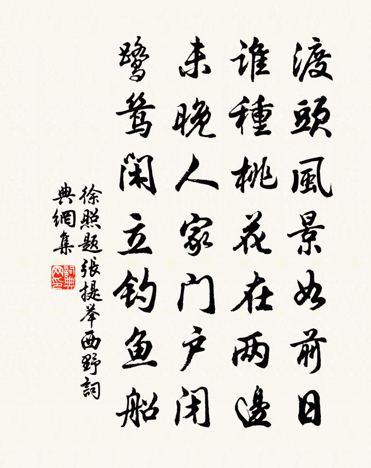 詩詞名句歷史字典書法欣賞書法字典國語詞典說文解字康熙字典古漢語字典標 題 作 者 詩 句 題張提舉西野作者:徐照 朝代:宋代題張提舉西野原文渡頭風景如前日,誰種桃花在兩邊。未晚人家門戶閉,鷺鷥閒立釣魚船。詩詞問答問:題張提舉西野的作者是誰?答:徐照問:題張提舉西野寫於哪個朝代?答:宋代徐照題張提舉西野書法欣賞題張提舉西野書法作品詩詞推薦楊柳塘寄徐照趙師秀〔宋代〕因貧為遠別,已是十三程。盡日行山色,逢人問地名。近書無便寄,新句與誰評。想爾寒宵雨,思予亦夢成。梅花六首趙蕃〔宋代〕梅從何遜驟知名,句入林逋價轉增。佳故品題因度遠,暗能摸索為香凝。每逢陳跡空搔首,不見斯人但服膺。菊徑狂吟八韻送英公暫歸故鄉遷殯二親宋白〔宋代〕十八般書四海傳,長安話別已多年。今來帝里重相見,轉覺師心更自然。下筆入神皆得法,出言成句書通玄。花時奉和聖制途經華岳應制蘇頲〔唐代〕朝望蓮華獄,神心就日來。晴觀五千仞,仙掌拓山開。受命金符葉,過祥玉瑞陪。霧披乘鹿見,雲起馭龍回。偃樹個人三十韻吳融〔唐代〕裊裊復盈盈,何年墜玉京。見人還道姓,羞客不稱名。故事諳金谷,新居近石城。臉橫秋水溢,眉拂遠山晴。粉薄留別王閒叟賀鑄〔宋代〕婆娑晚境未知還,邂逅故人增厚顏。次道志包宇宙外,子牟身寄江湖間。一悉妙義想冰釋,九死餘生非石頑。敢負水圖詩壽王丞相項安世〔宋代〕水於天地間,體物而不倚。其數為天一,眾有之所始。其辰為壬癸,重任之所揆。其德為智端,非非而是是。其聲西山泳長老請贊釋大觀〔宋代〕馽空雲蒂,補太虛縫。雖在窮相手頭,卻要因人發用。等閒撞著個冤家,活脫臨時看拈弄。留別成父弟以貧賤親戚離為韻五首趙蕃〔宋代〕我家如陶舍,幼稚有盈室。汝家亦十口,持去何可得。嗟我寡兄弟,至此得無戚。雖爾敢或忘,呴濡期沫濕。送崔諭德致政東歸權德輿〔唐代〕天子坐法宮,詔書下江東。懿此嘉遁士,蒲車赴丘中。褐衣入承明,朴略多古風。直道侍太子,昌言沃宸聰。岩居成紀書事二首許棠〔唐代〕東吳遠別客西秦,懷舊傷時暗灑巾。滿野多成無主冢,防邊半是異鄉人。山河再闊千餘里,城市曾經一百春。閒與詠雨張道古〔唐代〕亢陽今已久,嘉雨自雲傾。一點不斜去,極多時下成。次韻子瞻送顧子敦河北都運二首黃庭堅〔宋代〕今代顧虎頭,骨相自雄偉。不令長天宮,亦合丞御史。能貧安四壁,無慍可三已。昨來立清班,國士相顧喜。何因送陳秀才將游霅上便議北歸方乾〔唐代〕婆娑戀酒山花盡,繞繚還家水路通。轉楫擬從青草岸,吹帆猶是白蘋風。淮邊欲暝軍鼙急,洛下先寒苑樹空。詩句贈段琴沈說〔宋代〕我琴未弦進,渾然心與耳。自從識開指,反為琴所使。雨中觀庭下梅二首晁公溯〔宋代〕霏霏凍雨細無聲,解洗梅花花上塵。似與橫枝借顏色,故應添我一分春。東院白居易〔唐代〕松下軒廊竹下房,暖檐晴日滿繩床。淨名居士經三卷,榮啟先生琴一張。老去齒衰嫌橘醋,病來肺渴覺茶香。有時寄題盤山雲峰通濟橋二首曾豐〔宋代〕何人彼岸幻長虹,接引眾生入大通。彼此本來無間斷,度人了後勿論功。送馮夢授試禮部李新〔宋代〕年來初識小馮君,鞭靮何妨馭晏嬰。三世卿雲涪水秀,一門巢許蜀山清。飄零殊幸逢公子,邂逅相看不世情。入手學舍直歸晚霽三首宋祁〔宋代〕聚雨挫炎威,歸軒廣陌西。渠聲流作瀑,日腳側成霓。換錦龍媒埒,淹花燕子泥。比來巾角墊,李郭定相攜。名句推薦楊柳回塘,鴛鴦別浦。綠萍漲斷蓮舟路。賀鑄《芳心苦·楊柳回塘》 晝短苦夜長,何不秉燭游!佚名《生年不滿百》 獨立揚新令,千營共一呼。盧綸《和張僕射塞下曲·其一》 清愁滿眼共誰論。卻應台下草,不解憶王孫。李之儀《臨江仙·登凌歊台感懷》 團扇不搖風自舉,盈盈翠竹,纖纖白薴,不受些兒暑。文徵明《青玉案·庭下石榴花亂吐》 多少六朝興廢事,盡入漁樵閒話。張昪《離亭燕·一帶江山如畫》 暗暗淡淡紫,融融冶冶黃。李商隱《菊花》 尋尋覓覓,冷冷清清,淒悽慘慘戚戚。李清照《聲聲慢·尋尋覓覓》 故知之始己,自知而後知人也。王詡《鬼谷子·反應》 律回歲晚冰霜少,春到人間草木知。張栻《立春偶成》