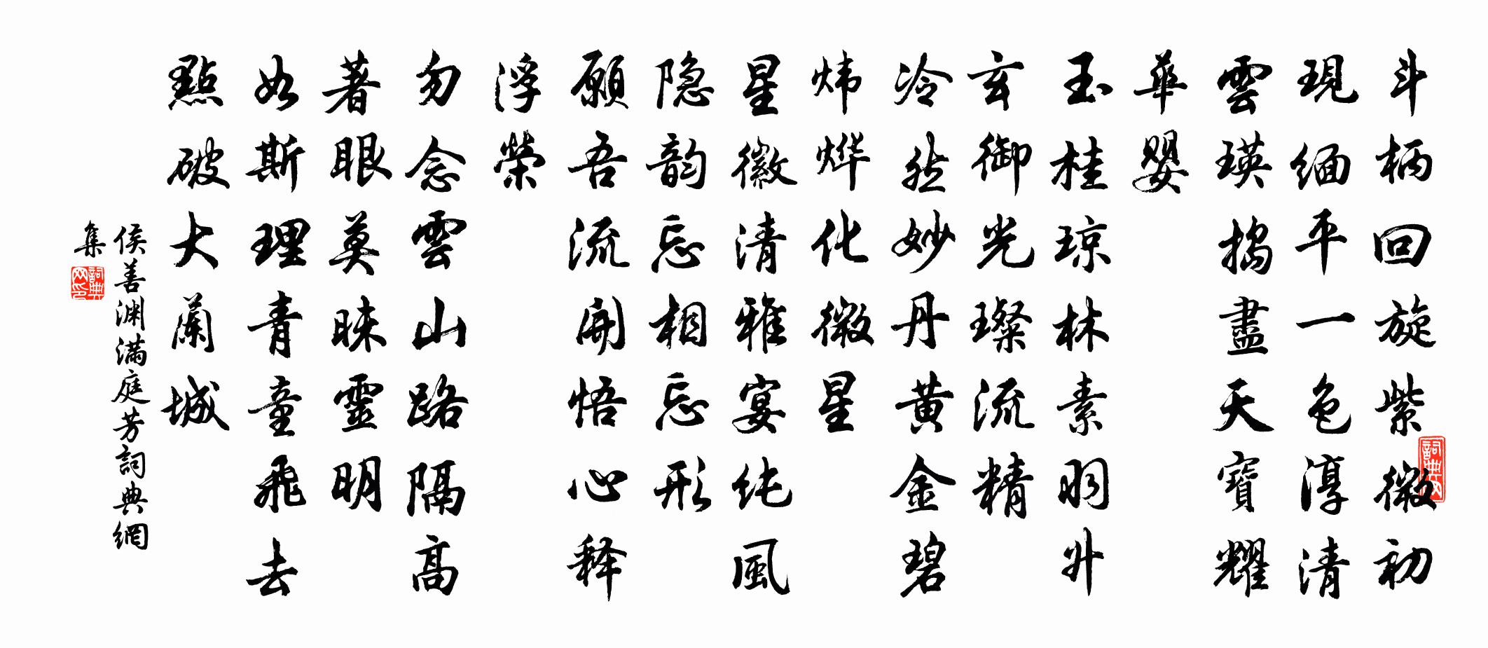 詩詞名句歷史字典書法欣賞書法字典國語詞典說文解字康熙字典古漢語字典標 題 作 者 詩 句 滿庭芳作者:侯善淵 朝代:元代滿庭芳原文斗柄迴旋,紫微初現,緬平一色淳清。雲瑛搗盡,天寶耀華嬰。玉桂瓊林素羽,升玄御、光璨流精。冷然妙,丹黃金碧,煒燁化微星。星徽清雅宴,純風隱韻,忘相忘形。願吾流開悟,心釋浮榮。勿念雲山路隔,高著眼、莫昧靈明。如斯理,青童飛去,點破大蘭城。詩詞問答問:滿庭芳的作者是誰?答:侯善淵問:滿庭芳寫於哪個朝代?答:元代問:滿庭芳是什麼體裁?答:詞侯善淵滿庭芳書法欣賞滿庭芳書法作品詩詞推薦送韓司直路出延陵(一作劉長卿詩)郎士元〔唐代〕游吳還適越,來往任風波。復送王孫去,其如春草何。岸明殘雪在,潮滿夕陽多。季子留遺廟,停舟試一過。懷隱堂周邦彥〔宋代〕昔賢抱奇識,閱世猶鼠肝。深顰畏軒冕,自謂山林寬。至今仰高躅,凜若冰雪寒。我侯坐少孤,久著聚鶡,屢費黃宿銅陵張耒〔宋代〕山色日已遠,問人歸路長。碧天涼夜闊,秋物雨余荒。人靜路傍寺,鳥啼林下房。銅陵竟何就,空死漢吳王。過青潭鋪用杜少陵韻胡銓〔宋代〕世路羊腸險,崎嶇不計層。附炎蛾並火,待暗鼠窺燈。國削臣心折,秋高虜勢增,魚蝦何足慮,回前顧鯨鵬。送李遂之越郎士元〔唐代〕未習風波事,初為東越游。露沾湖草晚,月照海山秋。梅市門何處,蘭亭水向流。西興待潮信,落日滿孤舟。二月六日雨中簡諸君趙蕃〔宋代〕人言好雨智地節,紅白紛紛奈若何。田父相呼稻當種,園官語我菜添科。日長燕子自無事,渚漲桃花思泛波。寄謝霜天曉角陳著〔宋代〕感不已江寒雁咽。短棹還催發。曾是玉堂仙伯,相別處、滿蓬雪。此別。那堪說。溯風空淚血。惟有梅花依舊,香曉登水亭楊萬里〔宋代〕露氣仍荷氣,秋風更曉風。身兼水亭子,雙隨玉壺中。送子謹叔杜范〔宋代〕少小從君游,忽已各壯年。蒙銅未披髮,憂孽故熏煎。羨君懷利器,吾宗秀而賢。刮摩盡結實,涵揉歸本源。南陽道中許渾〔唐代〕月斜孤館傍村行,野店高低帶古城。籬上曉花齋後落,井邊秋葉社前生。飢烏索哺隨雛叫,乳牸慵歸望犢鳴。荒草覽鏡楊公遠〔宋代〕覽鏡顏非昔,相將老態催。青春彈指去,白雪上頭來。興逸三杯酒,詩清百詠梅。襟期除此外,萬事付悠哉。責逋二首華岳〔宋代〕刳腸植粟餧官牛,牛骨成塵粟未酬。何事蓮參猶閣筆,反憐花縣若虛舟。季公素重千金諾,膠鬲當貽萬世羞。願效寄毫州秦伯鎮兵部邵雍〔宋代〕酒涵花影滿巵紅,瀉入天和胸臆中。最愛一般情味好,半醺時與太初同。潞府客亭寄崔鳳童王昌齡〔唐代〕蕭條郡城閉,旅館空寒煙。秋月對愁客,山鍾搖暮天。新知偶相訪,斗酒情依然。一宿阻長會,清風徒滿川。鵲橋仙(七夕)葛勝仲〔宋代〕涼飆破暑,清歌縈坐,缺月稀星庭戶。瓜華草草具杯盤,喜共浥、初筵零露。天孫東處,牽牛西望,勸汝一杯清醑和程泰之閣學詠雪十二題藏雪袁說友〔宋代〕凜節清姿老更堅,不須藏雪待炎天。明年歸拜頒冰寵,吉甫清風在舜弦。寄秋懷趙蕃〔宋代〕憶我江東弟,書來得暫怡。寺居因市近,村舍與貧宜。兒輩詩書力,童奴薪水為。尤欲護吾竹,及此夏初時。吳母葉氏大孺人輓詞楊萬里〔宋代〕發以留賓短,家從教子貧。班衣奉當署,象服鏡湖春。許穆詩還廢,班姑史尚新。不堪萱草露,也解泣慈親。題三蘇先生族譜俊載帥初為其七世孫撰序方回〔宋代〕眉山萬古老蘇仙,坡潁兒孫世世賢。尚想九關排虎豹,□須七葉珥貂蟬。何人不作無窮地,今日才知已定□。紹述賀聖朝 此首前尚有賀聖朝夕陽沈後一首亦未佚名〔宋代〕野僧歸後,漁舟才纜,綠檜生煙。對寒燈、瀟灑枕書眠。聽石漱流泉。丹爐火滅,琴房人靜,風自調弦。待孤峰、名句推薦遠路應悲春晼晚,殘霄猶得夢依稀。李商隱《春雨》 賞心樂事共誰論?花下銷魂,月下銷魂。唐寅《一剪梅·雨打梨花深閉門》 半夜倚喬松,不覺滿衣雪。孟郊《苦寒吟》 老來情味減,對別酒,怯流年。辛棄疾《木蘭花慢·滁州送范倅》 宦情羈思共淒淒,春半如秋意轉迷柳宗元《柳州二月榕葉落盡偶題》 學不可以已。荀子《荀子·勸學》 求之有道,得之有命,是求無益於得也,求在外者也。孟子《孟子·盡心章句上·第三節》 翠娥執手送臨歧,軋軋開朱戶柳永《採蓮令·月華收》 思牽今夜腸應直,雨冷香魂吊書客。李賀《秋來》 過橋分野色,移石動雲根。賈島《題李凝幽居》