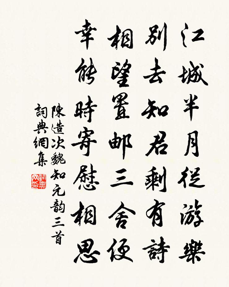 詩詞名句歷史字典書法欣賞書法字典國語詞典說文解字康熙字典古漢語字典標 題 作 者 詩 句 次魏知元韻三首作者:陳造 朝代:宋代次魏知元韻三首原文江城半月從遊樂,別去知君剩有詩。相望置郵三舍便,幸能時寄慰相思。詩詞問答問:次魏知元韻三首的作者是誰?答:陳造問:次魏知元韻三首寫於哪個朝代?答:宋代陳造次魏知元韻三首書法欣賞次魏知元韻三首書法作品詩詞推薦秋夕書事陸游〔宋代〕寂寂青楓岸,蕭蕭白版扉。端居常嬾動,偶出卻忘歸。時泰徵科簡,師還驛置稀。江村日無事,煙火自相依。次韻胡正卿方回〔宋代〕長途疾足詎容休,政是嘶風抹電秋。小復低回從吏隱,未應拘窘嘆官囚。聲名甫逐濤江起,魂夢空隨沁水流。一顧有所嘆五首張耒〔宋代〕衛青功高不薦賢,猶有蘇建能拳拳。魏其已誅武安死,將軍畏禍無敢言。田竇安知天下士,可是一言誰得罪。當憂和顏長官百詠負薪朱繼芳〔宋代〕有薪可賣未須悲,滿百青銅況有奇。十指束枯從禿盡,不堪棘刺罥人衣。送趙正夫使江東孔武仲〔宋代〕酌我酒一樽酒,送酒君千里行酒。青天酒連上黨,秋雁回汾並。戍壘鞠芳草,耕夫歌太平。庶獄須照膽,多士在提白紵歌張籍〔唐代〕皎皎白紵白且鮮,將作春衣稱少年。裁縫長短不能定,自持刀尺向姑前。復恐蘭膏污纖指,常遣傍人收墮珥。衣裳緣識宋太宗〔宋代〕一莖枯竹作魚竿,豈畏蛟螭坐釣灘。若獲得魚舡許大,應想恐悚不心安。沁園春方岳〔宋代〕歲在永和,癸丑暮春,修禊蘭亭。有崇山峻岭,茂林修竹,清流湍激,映帶山陰。曲水流觴,群賢畢至,是日風和螺青山下皆地錦花白玉蟾〔宋代〕螺青山綰青螺髻,地錦花鋪錦地衣。雨過花嬌山色茜,疑山解無欲狂飛。飛雲亭朱景玄〔唐代〕上結孤圓頂,飛軒出泰清。有時迷處所,梁棟曉雲生。曉坐荷橋四首楊萬里〔宋代〕雨後晨前絕爽時,胡床四面是荷池。荷珠細走惟愁落,為報薰風莫急吹。晨起陸游〔宋代〕勳業文章謝不能,生涯分付一枝藤。身同湘浦孤舟客,心羨廬山下版僧。倦枕厭聞窗外雨,殘膏猶在壁間燈。草芝贈山南嚴兵馬使(即僕射堂弟也)歐陽詹〔唐代〕為雁為鴻弟與兄,如雕如鶚傑連英。天旋地轉煙雲黑,共鼓長風六合清。失調名佚名〔宋代〕東南嫵媚,雌了男兒。和富谷館書事蘇頌〔宋代〕迢迢歸馭指榆津,日日西風起塞塵。沙底暗冰頻踠馬,嶺頭危徑罕逢人。客心牢落偏多感,天意融怡漸發春。珍重見薛大臂鷹作(一作李白)高適〔唐代〕寒楚十二月,蒼鷹 * 毛。寄言燕雀莫相啅,自有雲霄萬里高。第一山閻蒼舒〔宋代〕極目平淮渺莽間,翠巒特地起煙鬟。要渠天下無雙手,題作東南第一山。送徐季益赴婺州陳尚書之招並屬寄謝郡守韓侍趙蕃〔宋代〕禪月台邊草樹蒼,下臨溪流碧泱泱。君卜居之歲且長,徑路不忍夷其荒。我時巾幅上君堂,勞君煮茶炷爐香。與談浣溪沙(賦梅)趙長卿〔宋代〕雪壓前村曲徑迷。萬山寒立玉參差。孤舟獨釣一蓑歸。別塢時聽風折竹,斷橋閒看水流澌。一枝凍蕊出疏籬。至郡累旬惡風楊億〔宋代〕鄧禹功曹器,馬周令長才。叨臨萬室郡,驟致五風災。大木行將拔,繁雲暗不開。自知蒙闇極,民吏竊相咍。名句推薦三百年間同曉夢,鐘山何處有龍盤。李商隱《詠史二首·其一》 一自胡塵入漢關,十年伊洛路漫漫。陳與義《詠牡丹》 報答春光知有處,應須美酒送生涯。杜甫《江畔獨步尋花七絕句》 不義不昵,厚將崩。左丘明《左傳·隱公·隱公元年》 人迷洞庭水,雁度瀟湘煙。李白《郢門秋懷》 晴煙漠漠柳毿毿,不那離情酒半酣。韋莊《古離別》 教也者,長善而救其失者也。戴聖《禮記·學記》 嘆十年心事,休休莫莫。吳潛《滿江紅·豫章滕王閣》 昨日屋頭堪炙手,今朝門外好張羅白居易《放言五首·其四》 偶然值林叟,談笑無還期。王維《終南別業 / 初至山中 / 入山寄城中故人》