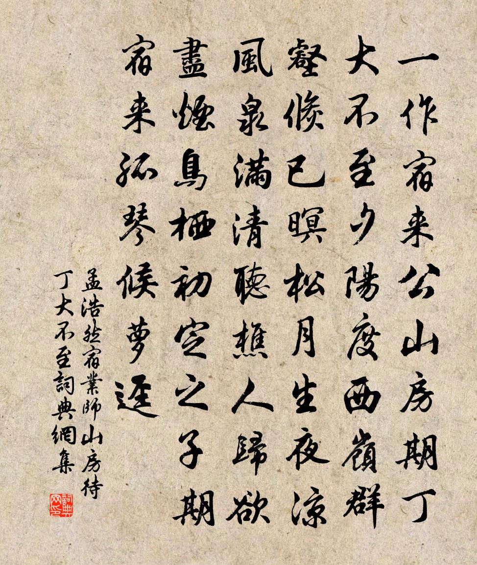 一作宿來公山房期丁大不至。夕陽度西嶺,群壑倏已暝。松月生夜涼,風泉滿清聽。樵人歸欲盡,煙鳥栖初定。之子期宿來,孤琴候蘿逕。