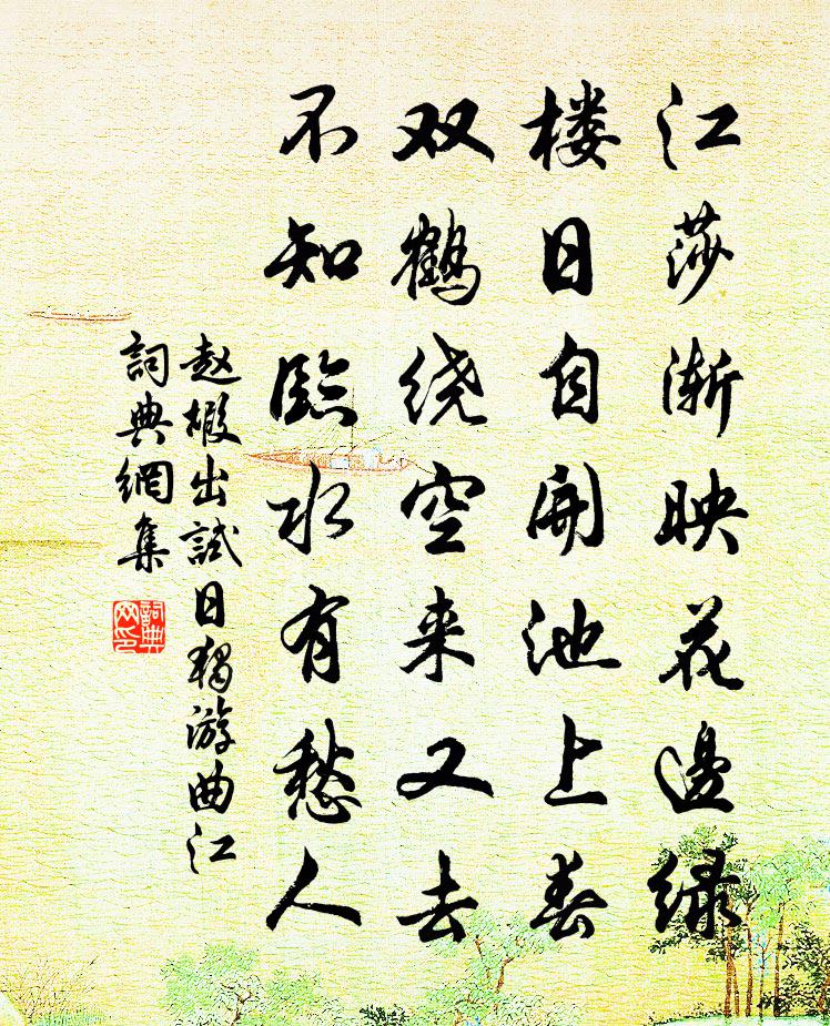江莎漸映花邊綠,樓日自開池上春。雙鶴繞空來又去,不知臨水有愁人。