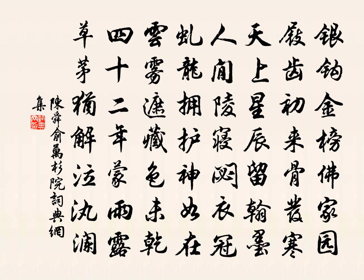 詩詞名句歷史字典書法欣賞書法字典國語詞典說文解字康熙字典古漢語字典標 題 作 者 詩 句 萬杉院作者:陳舜俞 朝代:宋代萬杉院原文銀鉤金榜佛家園,屐齒初來骨發寒。天上星辰留翰墨,人閒陵寢閟衣冠。虬龍擁護神如在,雲霧遮藏色未乾。四十二年蒙雨露,草茅猶解泣汍瀾。詩詞問答問:萬杉院的作者是誰?答:陳舜俞問:萬杉院寫於哪個朝代?答:宋代陳舜俞萬杉院書法欣賞萬杉院書法作品詩詞推薦城南亭作張說〔唐代〕珂馬朝歸連萬石,稍門洞啟親迎客。北堂珍重琥珀酒,庭前列肆茱萸席。長袖遲回意緒多,清商緩轉目騰波。舊傳春雪韓愈〔唐代〕片片驅鴻急,紛紛逐吹斜。到江還作水,著樹漸成花。越喜飛排瘴,胡愁厚蓋砂。兼雲封洞口,助月照天涯。暝見頌古四十八首釋慧開〔宋代〕拈起花來,尾巴已露。迦葉破顏,人天岡措。答客問王冕〔元代〕人間塵土苦囂煩,林下風生六月寒。夜半酒醒方脫屐,日高眠起不簪冠。笑看游蟻巡危磴,靜聽閒花落古壇。老我懷寄潘孝本兼簡其子言賀鑄〔宋代〕春色先梅嶺,秋聲後桂林。溪通五羊險,雲近九疑陰。無雁難逢信,有猿能伴吟。一樽燒酒美,應對阿戎斟。好事近汪莘〔宋代〕閬苑夢回時,窗外數聲啼鳥。覺我床前天氣,便清明多少。詩人門戶約花開,宿蝶誤飛了。一段山青水綠,作洞庭入蜀劉叉〔唐代〕望空問真宰,此路為誰開。峽色侵天去,江聲滾地來。孔明深有意,鍾會亦何才。信此非人事,悲歌付一杯。首夏三首白玉蟾〔宋代〕滿目晴巒總是詩,詩情飛絮逐遊絲。雨肥碧澗落花水,風瘦青松啼鳥枝。滿庭芳(賞牡丹)曾覿〔宋代〕冶態輕盈,香風搖盪,畫欄淑景初長。彩霞深處,明艷奪昭陽。試問沈香舊事,應勸我、莫負韶光。多情是,低徊晝眠呈夢錫孔平仲〔宋代〕百忙之際一閒身,更有高眠可詫君。春入四支濃似酒,風吹孤夢亂如雲。諸生弦誦何妨靜?滿席圖書不廢勤。向晚用廣陳君以畫徵題張衡〔兩漢〕陳君昨從江右歸,元龍豪氣如虹霓。清晨訪敘契闊,手持錦軸徵余題。遠山近山凡幾簇,三兩人家住溪曲。酒旗扔張端義應詔上書謫曲江正月一日贛州相遇戴復古〔宋代〕憂世心何切,謀身計甚疏。樽前話不盡,天下事何如。漢武求言詔,賈生流涕書。龍顏那可犯,謫向曲江居。贈日本友人彥九郎唐寅〔明代〕萍蹤兩度到中華,歸國憑將涉歷夸。劍佩丁年朝帝扆,星晨午夜拂仙槎。 驪歌送別三年客,鯨海遄征萬里家。此和文潛試院道舊晁補之〔宋代〕璧月照歌淮上舫,姚花引醉福昌城。何如閶闔門西北,臥聽秋風枕畔聲。二郎神(七夕)張孝祥〔宋代〕坐中客。共千里、瀟湘秋色。漸萬寶西成農事了,稏看、黃雲阡陌。喬□橘洲風浪穩,岳鎮聳、倚天青壁。追前謝束丈王令〔宋代〕卓鄭簪裾密作林,相如貧病強來臨。藜羹才飽無他志,肉食餓充有媿心。死馬偶能逢市骨,濫竽常恐負知音。古來次韻子瞻游羅浮山蘇轍〔宋代〕客迷墮澗逢玉京,雲行夭喬風號鳴。暗中過盡石髓滑,驚喜觀闕朝霞明。東坡南去類此客,擠者力盡非求生。偶然初致仕後戲酬留守牛相公,並呈分司諸寮友白居易〔唐代〕南北東西無所羈,掛冠自在勝分司。探花嘗酒多先到,拜表行香盡不知。炮筍烹魚飽餐後,擁袍枕臂醉眠時。報君陰雨白居易〔唐代〕嵐霧今朝重,江山此地深。灘聲秋更急,峽氣曉多陰。 望闕雲遮眼,思鄉雨滴心。將何慰幽獨,賴此北窗琴。念奴嬌沈瀛〔宋代〕賞心佳處,登臨地、千古人人都說。何況江天來雪望,添得十分奇絕。倚遍欄乾,下窺寒鏡,照我容顏拙。舉頭驚名句推薦記得綠羅裙,處處憐芳草。賀鑄《綠羅裙·東風柳陌長》 今夜故人來不來,教人立盡梧桐影。呂岩《梧桐影·落日斜》 花滿河陽,為君羞褪晨妝茜。吳文英《燭影搖紅·賦德清縣圃古紅梅》 城上日出群烏飛,鴉鴉爭赴朝陽枝。柳宗元《跂烏詞》 梯橫畫閣黃昏後,又還是、斜月簾櫳張先《一叢花令·傷高懷遠幾時窮》 別來不寄一行書。尋常相見了,猶道不如初。晁沖之《臨江仙·憶昔西池池上飲》 離恨又迎春,相思難重陳。和凝《菩薩蠻·越梅半拆輕寒里》 誰見汀洲上,相思愁白蘋。劉長卿《餞別王十一南遊》 宴爾新婚,以我御窮。佚名《谷風》 湖光秋月兩相和,潭面無風鏡未磨。劉禹錫《望洞庭》