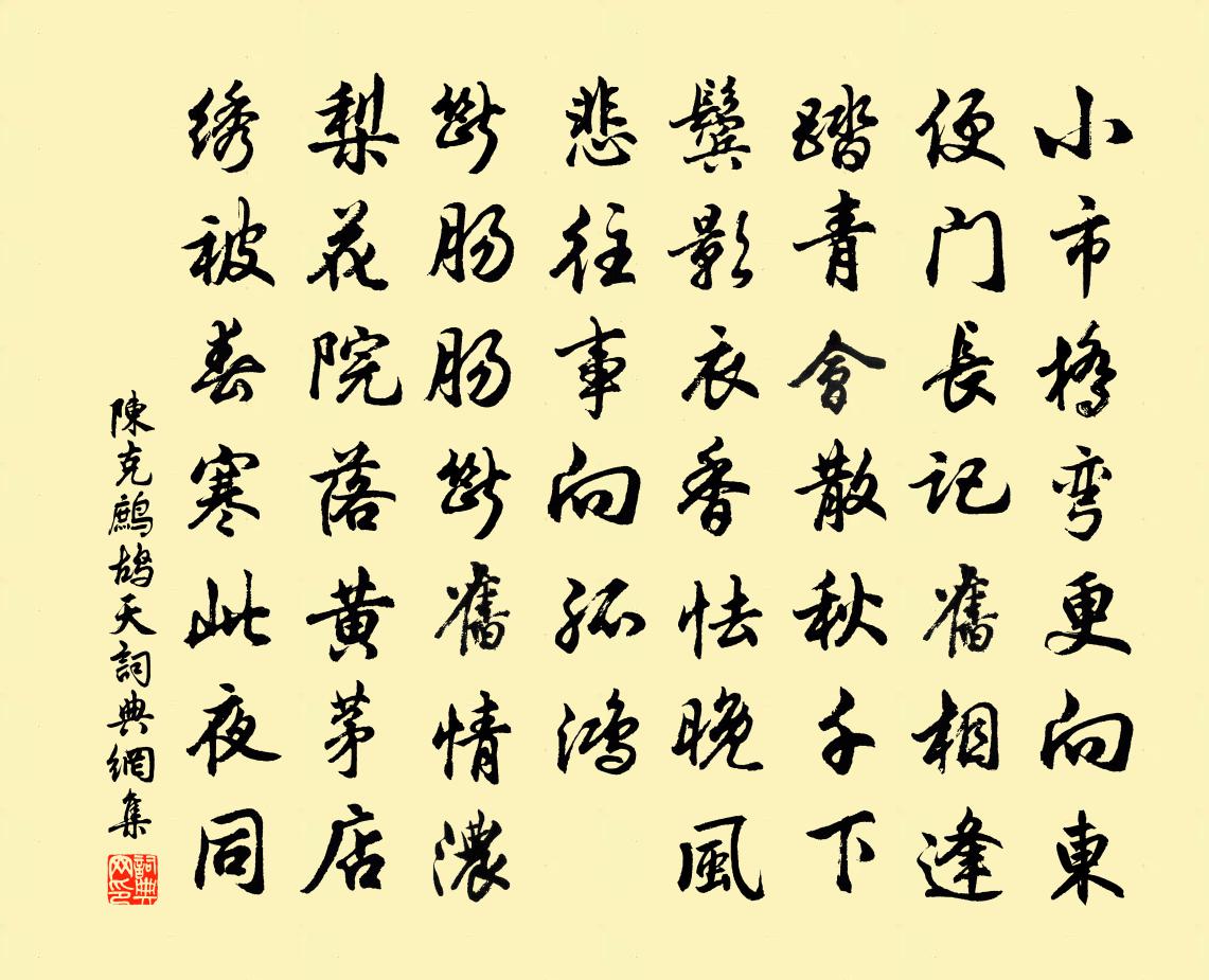 詩詞名句歷史字典書法欣賞書法字典國語詞典說文解字康熙字典古漢語字典標 題 作 者 詩 句 鷓鴣天作者:陳克 朝代:宋代鷓鴣天原文小市橋彎更向東。便門長記舊相逢。踏青會散鞦韆下,鬢影衣香怯晚風。悲往事,向孤鴻。斷腸腸斷舊情濃。梨花院落黃茅店,繡被春寒此夜同。詩詞問答問:鷓鴣天的作者是誰?答:陳克問:鷓鴣天寫於哪個朝代?答:宋代問:鷓鴣天是什麼體裁?答:詞問:陳克的名句有哪些?答:陳克名句大全陳克鷓鴣天書法欣賞鷓鴣天書法作品詩詞推薦鳳棲梧/蝶戀花程垓〔宋代〕門外飛花風約住。訊息江南,已釀黃梅雨。蜀客望鄉歸不去。當時不合催南渡。憂國丹心曾獨許。縱吐長虹,不奈題長洲陳明府小亭方乾〔唐代〕坐看孤峭卻勞神,還是微吟到日曛。松鶴認名呼得下,沙蟬飛處聽猶聞。夜闌亦似深山月,雨後唯關滿屋雲。便此題潮出海門圖二首陳造〔宋代〕絕島平岡卷欲空,兩崖相對屹穹崇。即今畫手兼詩筆,更與江山角長雄。奉和別越王李敬玄〔唐代〕飛蓋回蘭坂,宸襟佇柏梁。別館分涇渭,歸路指衡漳。關山通曙色,林籞遍春光。帝念紆千里,詞波照五潢。一絡索·過盡遙山如畫納蘭性德〔清代〕過盡遙山如畫。短衣匹馬。蕭蕭落木不勝秋,莫回首、斜陽下。別是柔腸縈掛。待歸才罷。卻愁擁髻向燈前,說不禮局致齋宋祁〔宋代〕枌榆秋報漢家壇,齋誓先朝令不刊。抱蕝一身依禮署,飯蔬三日屬祠官。天池唳鶴驚宵滴,宮堞棲烏噪暮寒。倦枕感歌行李新〔宋代〕春陌露草悲銅駝,漢宮秋吹驚紈羅。北蟲成塵天峨峨,鐵牛古背橫黃河。蘭陵千篇窮愁死,屠狗一劍袪群魔。酒闌景陽井楊備〔宋代〕擒虎戈矛滿六宮,春花無樹不秋風。蒼惶益見多情處,同穴甘心赴井中。自吟徐釣者〔唐代〕曾見秦皇架石橋,海神忙迫漲驚潮。蓬萊隔海雖難到,直上三清卻不遙。次韻惟西堂巧山二首陳著〔宋代〕清風明月本無邊,我亦尋盟到白蓮。青玉軒前坐來久,淡中滋味自相賢。玉樓春·寂寂畫堂樑上魏承班〔唐代〕寂寂畫堂樑上燕,高卷翠簾橫數扇。一庭春色惱人來,滿地落花紅幾片。愁倚錦屏低雪面,淚滴繡羅金縷線。好天瑞鶴仙 成數造化金丹王吉昌〔元代〕金丹真造化。在進火、功夫抽添相亞。綿綿息全藉。配天關地軸,器爐形借。鑽消汞瀉。引彩鳳、金烏自下。入黃弓李嶠〔唐代〕桃文稱辟惡,桑質表初生。宛轉雕鞬際,依稀半月明。遙彎落雁影,虛引怯猿聲。徒切烏號思,攀龍遂不成。句胡枚〔宋代〕西梁萬里何時到,爭似懷沙入九泉。天基瑞應宮劉學箕〔宋代〕金碧擁瓊廬,天開繞電區。鳥流周室瑞,蛇斷漢家府。石井騰曦馭,瑤壇布斗樞。願將皇極福,敷錫偏康衢。酬崔駙馬惠箋百張兼貽四韻楊巨源〔唐代〕百張雲樣亂花開,七字文頭艷錦回。浮碧空從天上得,殷紅應自日邊來。捧持價重凌雲葉,封裹香深笑海苔。滿篋天淨沙·寧可少活十年嚴忠濟〔元代〕寧可少活十年,休得一日無權。大丈夫時乖命蹇。有朝一日天隨人願,賽田文養客三千!送李殿丞通判處州梅堯臣〔宋代〕拜官將近親,不畏千里險。泝流上贛水,石亂波驚颭。舟人素已諳,曲折就回閃。豈虞失便利,倚慣憂亦掩。昔余秋寒白居易〔唐代〕雪鬢年顏老,霜庭景氣秋。病看妻撿藥,寒遣婢梳頭。身外名何有,人間事且休。澹然方寸內,唯擬學虛舟。紹興以後蜡祭四十二首佚名〔宋代〕除壇西郊,坎其聲鼓。百靈至止,結來作主。秬鬯湛淡,玉斝觩觖。是謂嘉德,神其安留。名句推薦重幃深下莫愁堂,臥後清宵細細長。李商隱《無題·重幃深下莫愁堂》 先行其言而後從之。孔子弟子《論語·為政篇》 東風不為吹愁去,春日偏能惹恨長。賈至《春思二首·其一》 花開深洞仙門小,路過懸橋羽節輕。劉滄《贈道者》 呼兒將出換美酒,與爾同銷萬古愁。李白《將進酒》 孤煙村際起,歸雁天邊去。孟浩然《南歸阻雪》 飛流直下三千尺,疑是銀河落九天。李白《望廬山瀑布》 燕子不歸春事晚,一汀煙雨杏花寒。戴叔倫《蘇溪亭》 不知何處火,來就客心然。沈佺期《寒食》 布衣菜飯,可樂終身,不必作遠遊計也。沈復《浮生六記·閨房記樂》