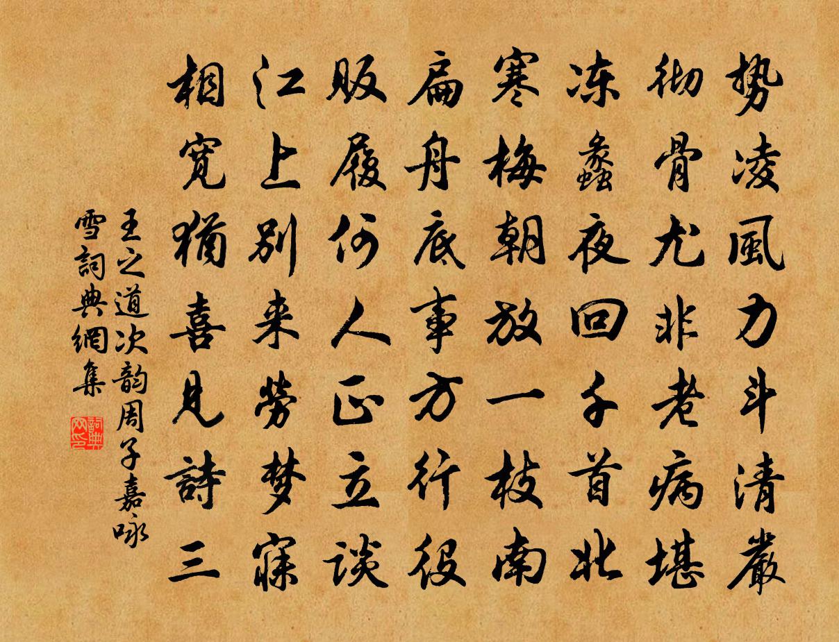 詩詞名句歷史字典書法欣賞書法字典國語詞典說文解字康熙字典古漢語字典標 題 作 者 詩 句 次韻周子嘉詠雪作者:王之道 朝代:宋代次韻周子嘉詠雪原文勢凌風力斗清嚴,徹骨尤非老病堪。凍蠡夜回千首北,寒梅朝放一枝南。扁舟底事方行役,販履何人正立談。江上別來勞夢寐,相寬猶喜見詩三。詩詞問答問:次韻周子嘉詠雪的作者是誰?答:王之道問:次韻周子嘉詠雪寫於哪個朝代?答:宋代王之道次韻周子嘉詠雪書法欣賞次韻周子嘉詠雪書法作品詩詞推薦出迎使客質明放船自瓦窋歸黃庭堅〔宋代〕鼓吹喧江雨不開,丹楓落葉放船回。風行水上如雲過,地近嶺南無雁來。樓閣人家捲簾幕,菰蒲鷗鳥樂灣洄。惜無試院贈三同官陳造〔宋代〕果飣茶甌意未闌,獨慚衰鬢映朱顏。聚頭長作三更語,屈指惟餘兩日閒。食葉蠶聲行入聽,探珠驪頷不應慳。預憐句唐人機軸〔宋代〕風暖柴荊鳥語幽,麥高麻矮野桑柔。游石門澗白居易〔唐代〕石門無舊徑,披榛訪遺蹟。時逢山水秋,清輝如古昔。常聞慧遠輩,題詩此岩壁。雲覆莓苔封,蒼然無處覓。蕭疏寄李端叔二首張耒〔宋代〕束髮聞至道,榮辱久齊觀。中年嬰世故,已復傲憂患。閒居雖荒寂,几杖頗清晏。悠悠閒晷景,草草貧寢飯。狂言桂花姜夔〔宋代〕空山尋桂樹,折香思故人。故人隔秋水,一望一回顰。南山北山路,載花如行雲。闌乾望雙槳,農枝儲待君。西泠次沈節推送春韻二首杜范〔宋代〕一年春事逐飛蓬,燕語千愁訴未通。不竹誰家深院落,捲簾準擬納薰風。台山雜吟元好問〔金代〕萬壑千岩位置雄,偶從天巧見神功。湍溪已作風雷惡,更在雲山氣象中。覽鏡有感陸游〔宋代〕齒如敗屐鬢成絲,七十之年敢自期。閱世久應書鬼錄,強顏那復乞山資。緋衫蔭子踰初望,下澤還鄉負聖時。回首江城子·西城楊柳弄春柔秦觀〔宋代〕西城楊柳弄春柔,動離憂,淚難收。猶記多情、曾為系歸舟。碧野朱橋當日事,人不見,水空流。韶華不為少年留春日鄭剛中〔宋代〕朝來弄日花頭密,暗裡窺春柳眼多。任是老人情意薄,個般時節奈愁何。答彥修劉邊〔宋代〕九曲溪邊玉女峰,年年獨倚落花風。何因不駕青鸞去,儜立空山皓月中。武陵春日王建〔唐代〕尋春何事卻悲涼,春到他鄉憶故鄉。秦女洞桃欹澗碧,楚王堤柳舞煙黃。波濤入夢家山遠,名利關身客路長。不似蘇幕遮 七返還丹,在人先須,煉己待時潛真子〔元代〕七返功,人難會。返本還元,七轉收歸兌。陽九但行陰六位。何慮三峰,雪裡安然睡。在人修,鬚髮志。烹煉依時和薔薇花歌孟郊〔唐代〕仙機札札織鳳凰,花開七十有二行。天霞落地攢紅光,風枝裊裊時一颺,飛散葩馥繞空王。忽驚錦浪洗新色,又似同君倚過聖俞司馬光〔宋代〕王畿一古樞,簿領日填積。自非奉朝請,九衢未嘗識。今北到東城,胥靡暫逃役。近指聖俞居,安能不往覿。一室榴皮題壁朱景行〔宋代〕白酒延賓出自如,收書養性務三餘。山人醉吐驚人句,卻向東庵素壁書。紹興享先農十一首佚名〔宋代〕柔毛剛髦,或剝或烹。為俎孔碩,登薦厥誠。偈頌一百二十三首釋崇岳〔宋代〕今朝月半,見成公案。臨濟德山,猶是鈍漢。靈隱恁麽道,也是不著便。酬李參軍崇嗣旅館見贈陳子昂〔唐代〕昨夜銀河畔,星文犯遙漢。今朝紫氣新,物色果逢真。言從天上落,乃是地仙人。白璧疑冤楚,烏裘似入秦。摧藏名句推薦勸君莫惜花前醉,今年花謝,明年花謝,白了人頭。趙秉文《青杏兒·風雨替花愁》 二月巴陵日日風,春寒未了怯園公。陳與義《春寒》 若是前生未有緣,待重結、來生願。樂婉《卜運算元·答施》 惟有兩行低雁,知人倚、畫樓月。范成大《霜天曉角·梅》 見說五湖供飲馬,滄浪何處著漁舟?陳子龍《秋日雜感(十首選一)》 禮者,所以正身也;師者所以正禮也。荀子《荀子·修身》 澗影見松竹,潭香聞芰荷。孟浩然《夏日浮舟過陳大水亭 / 浮舟過滕逸人別業》 飛鳥沒何處,青山空向人。劉長卿《餞別王十一南遊》 人學始知道,不學非自然。孟郊《勸學》 雪似梅花,梅花似雪。呂本中《踏莎行·雪似梅花》