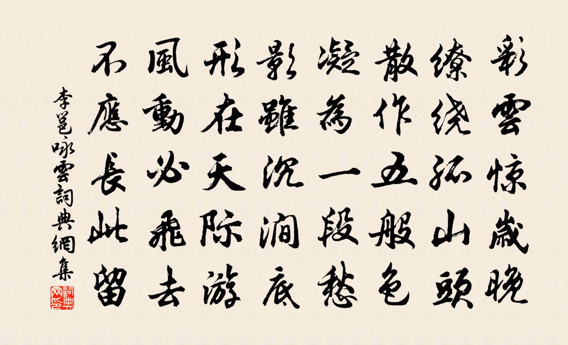 詩詞名句歷史字典書法欣賞書法字典國語詞典說文解字康熙字典古漢語字典標 題 作 者 詩 句 詠雲作者:李邕 朝代:唐代詠雲原文彩雲驚歲晚,繚繞孤山頭。散作五般色,凝為一段愁。影雖沉澗底,形在天際游。風動必飛去,不應長此留。詩詞問答問:詠雲的作者是誰?答:李邕問:詠雲寫於哪個朝代?答:唐代問:詠雲是什麼體裁?答:五律李邕詠雲書法欣賞詠雲書法作品注釋全唐詩:卷115_5詩詞推薦看花回(越調)周邦彥〔宋代〕秀色芳容明眸,就中奇絕。細看艷波欲溜,最可惜微重,紅綃輕帖。勻朱傅粉,幾為嚴妝時涴睫。因個甚、底死嗔暑雨憶衢州一絕蘇籀〔宋代〕衣裳俎豆信華風,酒聖茶顛倚獨松。夏屋渠渠聽聚雨,數尋竹外瀉琤淙。頌古二十九首釋師體〔宋代〕陪錢弄傀儡,拚命打鞦韆。渾家無眼見,掩面哭蒼天。寄題吳介夫專壑七詠負閒劉學箕〔宋代〕鐘鼎本玩世,富貴徒苦人。何似天地間,蕭然一閒身。句湯黃中〔宋代〕近人方駕廈,如客已驚秋。偈六十九首釋道寧〔宋代〕靈山瞬目,早是周遮。良馬窺鞭,豈為英俊。岩間宴坐,天帝散花。無說無聞,藏頭露影。少林面壁,計較未成。春來白居易〔唐代〕春來觸動故鄉情,忽見風光憶兩京。金谷蹋花香騎入,曲江碾草鈿車行。誰家綠酒歡連夜?何處紅樓睡失明?獨有次韻王少清告歸七首項安世〔宋代〕蓮幕斑衣底,何因有旅愁。錦官城裡客,雲上澤邊州。夜夜還鄉夢,年年異縣秋。鶺鴒憐羽翼,鴻雁憶朋儔。便作寄楊八壽州劉禹錫〔唐代〕風獵紅旗入壽春,滿城歌舞向朱輪。八公山下清淮水,千騎塵中白面人。桂嶺雨餘多鶴跡,茗園晴望似龍鱗。聖朝題長安酒肆壁三絕句鍾離權〔唐代〕坐臥常攜酒一壺,不教雙眼識皇都。乾坤許大無名姓,疏散人中一丈夫。得道高僧不易逢,幾時歸去願相從。自言送呂子約赴天台倅彭龜年〔宋代〕少讀麗澤書,投老未盡識。譬如涉大海,渺不見其極。去之若有失,從之了無得。約兄自西來,為我倒胸臆。始知譙國嘲提壺晁補之〔宋代〕何處提壺鳥,荒園自 * 。夕陽深樾里,持此勸何人。和何逢原寄韻何夢桂〔宋代〕世界歸大壑,人事如奔淙。浮生萃草木,萬變成飄風。觸蠻兩蝸國,王侯一蟻對。下觀黔首愚,咄嗟書虛空。怒攘哭王元裕溫庭筠〔唐代〕聞說蕭郎逐逝川,伯牙因此絕清弦。柳邊猶憶青驄影,墳上俄生碧草煙。篋里詩書疑謝後,夢中風貌似潘前。他時居魏歲餘未嘗見江鄉故人今無悔如雄過此相見強至〔宋代〕經年大河北,終日故鄉心。入耳欣吳語,開懷慰越吟。天寒裘領薄,日暮酒杯深。早晚論邊策,長纓試請擒。次韻鄉人華秀才冬至日投贈二首項安世〔宋代〕深知道長屬仁賢,甚愛陽來復舊氈。鳳歷新灰浮緹室,牛星初度轉青天。五雲嘉氣書周典,七日靈文驗孔編。忽忽江南四遷國之亡天也歌以紀之唐涇〔宋代〕吳峰一發暮雲孤,愁向湘纍訊故都。風去只餘韻樂在,雁來還有帛書無。杏壇有客陳孤注,平隴何人復五銖。歌徹金陵雜興二百首蘇泂〔宋代〕紙錢吹掛樹枝風,積李崇桃白間紅。但見牛羊上丘壠,忽看禾黍出蒿蓬。減字木蘭花(恭人生日)王之望〔宋代〕糟糠相樂。早共梁鴻同隱約。著籍天門。隔品新封感帝恩。滿堂兒女。婦捧金杯孫屢舞。白髮卿卿。與爾尊前作壽秋張耒〔宋代〕日落星稀河漢微,清秋一點水螢飛。涼風白露愁先覺,可待梧桐報即知。名句推薦華而不實,恥也。左丘明《國語·晉語·秦伯享重耳以國君之禮》 師之所處,荊棘生焉。大軍之後,必有凶年。老子《老子·道經·第三十章》 何似當筵虎士,揮手弦聲響處,雙雁落遙空。葉夢得《水調歌頭·九月望日與客習射西園余偶病不能射》 山抹微雲,天連衰草,畫角聲斷譙門。秦觀《滿庭芳·山抹微雲》 顏子之不校,孟子之自反,是賢人處橫逆之方王永彬《圍爐夜話·第四九則》 傷情處,高城望斷,燈火已黃昏。秦觀《滿庭芳·山抹微雲》 歌鐘不盡意,白日落昆明。李白《經亂離後天恩流夜郎憶舊遊書懷贈江夏韋太守良宰》 春宵一刻值千金,花有清香月有陰。蘇軾《春宵·春宵一刻值千金》 無由持一碗,寄與愛茶人。白居易《山泉煎茶有懷》 自我來黃州,已過三寒食。蘇軾《寒食雨二首》