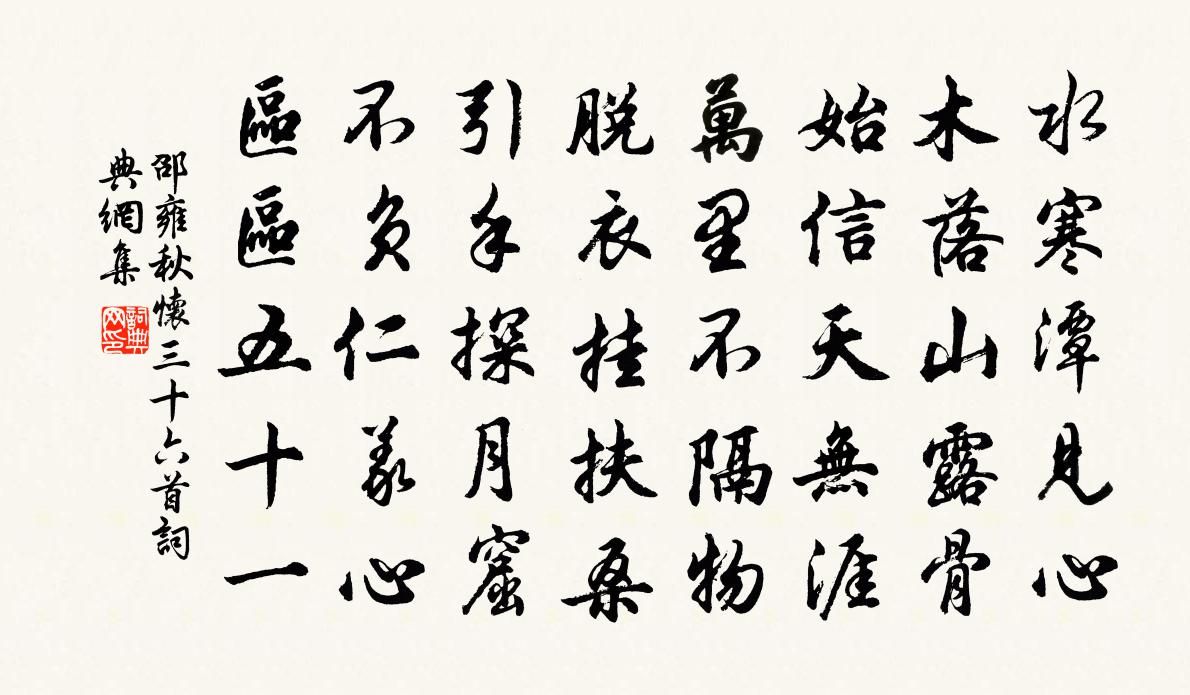 詩詞名句歷史字典書法欣賞書法字典國語詞典說文解字康熙字典古漢語字典標 題 作 者 詩 句 秋懷三十六首作者:邵雍 朝代:宋代秋懷三十六首原文水寒潭見心,木落山露骨。始信天無涯,萬里不隔物。脫衣掛扶桑,引手探月窟。不負仁義心,區區五十一。詩詞問答問:秋懷三十六首的作者是誰?答:邵雍問:秋懷三十六首寫於哪個朝代?答:宋代邵雍秋懷三十六首書法欣賞秋懷三十六首書法作品詩詞推薦漁父詞(香嚴)惠洪〔宋代〕畫餅充飢人笑汝。一庵歸掃南陽塢。擊竹作聲方省悟。徐回顧。本來面目無藏處。卻望溈山敷坐具。老師頭角渾呈宿島徑夷山舍陳陶〔唐代〕百里床遵島徑,床蓬徵信邅床回。暝依床漁樵宿,似過黃金台。缺齧心未理,寥寥夜猿哀。山深石床冷,海近腥氣茉莉花楊巽齋〔宋代〕臍麝龍涎韻不侔,薰風移植自南州。誰家浴罷臨妝女,愛把間花帶滿頭。阮郎歸(和邢公昭)侯置〔宋代〕莫欺騎省鬢邊華。曾慮蘇小家。彩絲縈腕剪輕霞。菖蒲酒更嘉。人別後,嘆飛花。雲山和夢遮。吳箋小字寫流沙。三姝媚薛夢桂〔宋代〕薔薇花謝去。更無情、連夜送春風雨。燕子呢喃,似念人憔悴,往來朱戶。漲綠煙深,早零落、點池萍絮。暗憶年壬寅歲旦景明子淵君玉攜酒與詩為壽次韻戴復古〔宋代〕舍我白瓷碗,把君金屈卮。判為元日醉,共賦早春詩。冰泮魚龍起,花開蜂蝶知。為子扶病腳,賴有古藤枝。詠華山寇準〔宋代〕只有天在上,更無山與齊。舉頭紅日近,回首白雲低。對月六首白玉蟾〔宋代〕水澄熊白成壺酒,楓染猩紅滿路旗。坐待西風迎素月,青天笑我獨詩痴。游毛公洞六首王之道〔宋代〕徘徊銀穴送斜暉,散遣長須上翠微。青鳥似知予意確,故傳仙語傍人飛。蔣觀文錢塘天府二帖贊岳珂〔宋代〕尺瑜瑕,工所不棄。如公平生,抑有清議。雖翰墨之僅存,亦世俗之共毖。予獨區區於別白,是亦或出於有意。昔還鄧覺民詩卷孫嵩〔宋代〕南山竹機笛,北山桐可琴。得如聽松風,中有太古音。陽關曲(軍中)蘇軾〔宋代〕受降城下紫髯郎。戲馬台南舊戰場。恨君不取契丹首,金甲牙旗歸故鄉。香港感懷十首黃遵憲〔清代〕指北黃龍飲,從西天馬來。飛輪齊鼓浪,祝炮日鳴雷。中外通喉舌,縱橫積貨財。登高遙望海,大地故恢恢。獨孤中丞筵陪餞韋君赴昇州皇甫冉〔唐代〕中司龍節貴,上客虎符新。地控吳襟帶,才高漢縉紳。泛舟應度臘,入境便行春。處處歌來暮,長江建業人。送崔中丞赴鄭州姚合〔唐代〕僕射陂前郡,清高越四鄰。丹霄鳳詔下,太守虎符新。霧濕關城月,花香驛路塵。連枝相庭樹,歲歲一家春。三月二十日多葉杏盛開蘇軾〔宋代〕零露泫月蕊,溫風散晴葩。春工了不睡,連夜開此花。芳心誰剪刻,天質自清華。惱客香有無,弄妝影橫斜。中山詠史詩長安胡曾〔唐代〕關東新破項王歸,赤幟悠揚日月旗。從此漢家無敵國,爭教彭越受誅夷。點絳唇(和梁從善)廖行之〔宋代〕屈指家山,匆匆又數今朝過。客情那可。愁似天來大。煙雨濛濛,細浥輕塵墮。君知麽。卻成甚個。春暮猶江左。送陝尉邵國華南歸魏野〔宋代〕召棠陰里邵梅仙,守選南歸路七千。辛苦已傷過嶺外,別離那忍向花前。到京店舍逢新火,度越封疆入瘴煙。相顧龍井釋文珦〔宋代〕崖井涵虛碧,心塵望即空。遙通滄海脈,近出白雲峰。旱夕翻為雨,飢年屢變豐。小魚才似葉,誰識是真龍。名句推薦它山之石,可以攻玉。佚名《鶴鳴》 無作牛山悲,惻愴淚沾臆。李白《君子有所思行》 塞雁高飛人未還,一簾風月閒。李煜《長相思·一重山》 柳梢聽得黃鸝語,此是春來第一聲。楊載《到京師》 一番桃李花開盡,惟有青青草色齊。曾鞏《城南·雨過橫塘水滿堤》 假令風歇時下來,猶能簸卻滄溟水李白《上李邕》 民不畏死,奈何以死懼之?老子《老子·德經·第七十四章》 一味學吃虧,是處事良方。王永彬《圍爐夜話·第五四則》 春心莫共花爭發,一寸相思一寸灰!李商隱《無題·颯颯東風細雨來》 聲一無聽,物一無文左丘明《國語·鄭語·史伯為桓公論興衰》