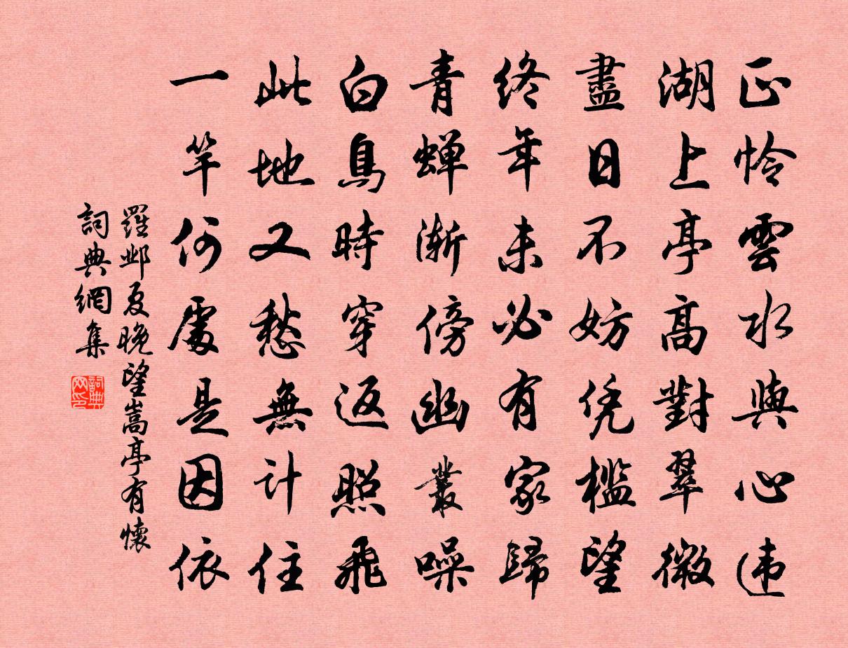 詩詞名句歷史字典書法欣賞書法字典國語詞典說文解字康熙字典古漢語字典標 題 作 者 詩 句 夏晚望嵩亭有懷作者:羅鄴 朝代:唐代夏晚望嵩亭有懷原文正憐雲水與心違,湖上亭高對翠微。盡日不妨憑檻望,終年未必有家歸。青蟬漸傍幽叢噪,白鳥時穿返照飛。此地又愁無計住,一竿何處是因依。詩詞問答問:夏晚望嵩亭有懷的作者是誰?答:羅鄴問:夏晚望嵩亭有懷寫於哪個朝代?答:唐代問:夏晚望嵩亭有懷是什麼體裁?答:七律羅鄴夏晚望嵩亭有懷書法欣賞夏晚望嵩亭有懷書法作品注釋全唐詩:卷654-128詩詞推薦和相國元老邵雍〔宋代〕豈台未經慶,瑞雪下雲端。雖地盡成白,而天不甚寒。有年豐可待,盈尺潤難乾。畎畝無忘處,追蹤擊壤歡。君馬黃艾可翁〔宋代〕君馬黃,我馬驪。白玉為勒絡青絲,與君並轡河水湄。河上撲撲楊花飛,楊花飛飛送客人。生別離,良可惜。願君小兒生日蒲壽宬〔宋代〕今年二十八,細憶始生時。漸喜山多樹,尤憐水滿池。相寬吾老大,自教爾童兒。佛誕明朝是,然香共展眉。鄉思李覯〔宋代〕人言落日是天涯,望極天涯不見家。已恨碧山相阻隔,碧山還被暮雲遮。會節園梅花下作崔鶠〔宋代〕去年白玉花,結子深林間。小憩藉清影,低顰啄微酸。故人不復見,春事今已闌。繞樹尋履跡,空餘土花班。青渠追和宋金都壁間韻洪咨夔〔宋代〕短亭放腳小軒渠,從險趨平本一塗。掌上煙川三百里,蜀都風物似吳都。狀江南季夏范燈〔唐代〕江南季夏天,身熱汗如泉。蚊蚋成雷澤,袈裟作水田。和張可投詩十首王洋〔宋代〕廛音解作障耳霧,佳客能開病眼明。一軸收藏比珍貺,不妨擲地亦金聲。蘇州十詠其二木蘭堂范仲淹〔宋代〕堂上列歌鍾,多慚不如古。卻羨木蘭花,曾見霓裳舞。春草二首楊萬里〔宋代〕年年春色屬垂楊,金捻千絲翠萬行。今歲草芽先得計,攙它濃翠奪它黃。簡楊安國陳師道〔宋代〕侯門誰預識馮諼,歲晚寧知范叔寒。傾蓋尚憐吾道在,立談相信古人難。開懷磊落無城府,握手侵尋出肺肝。共許過真州沈德潛〔清代〕揚州西去真州路,萬樹垂楊繞岸栽。野店酒香帆盡落,寒塘漁散鷺初回。曉風殘月屯田墓,零露浮雲魏帝台。此夕山居陳與義〔宋代〕耿耿虛堂一榻秋,人間高枕幾王侯。亂雲未放曉山出,片月不隨寒水流。檢校一身渾是懶,平章千古得無愁。湘波海棠四首楊萬里〔宋代〕小園不到負今晨,晚喚嬌紅伴老身。落日爭明那肯暮,艷妝一出更無春。樹間露坐看搖影,酒底花光併入唇。銀燭臨江仙王哲〔元代〕絳帳今朝重到此,榴花對景先開。坐間誰悟害風來。四梧知我意,三耀散予災。既得相逢休酩酊,洞中別有樽壘。金剛隨機無盡頌福智無比分第二十四釋印肅〔宋代〕無為福勝田,頓覺如來禪。阿鼻剎那滅,八萬及四千。看花曲戴表元〔宋代〕種花郎君愛花好,看花兒女笑花老,牆東花開鬧喧喧,馬蹄蹴醉牆西草。遊人賤草只看花,明日重來還可嗟。但見河上二首司空圖〔唐代〕慘慘日將暮,驅羸獨到莊。沙痕傍墟落,風色入牛羊。新霽田園處,夕陽禾黍明。沙村平見水,深巷有鷗聲。望湖樓上作潘閬〔宋代〕望湖樓上立,竟日懶思還。聽水分他浦,看雲過別山。孤舟依岸靜,獨鳥向人閒。回首重門閉,蛙鳴夕照間。送刁景純知會稽梅堯臣〔宋代〕前有朱翁子,後經王右軍。至今風俗美,自昔誦歌聞。秦望臨丹戟,耶溪漱白雲。只應絲管去,驚動海鷗群。名句推薦閒來無事不從容,睡覺東窗日已紅。程顥《秋日》 古人今人若流水,共看明月皆如此。李白《把酒問月·故人賈淳令予問之》 四海無閒田,農夫猶餓死。李紳《古風二首 / 憫農二首》 沉恨細思,不如桃杏,猶解嫁東風。張先《一叢花令·傷高懷遠幾時窮》 淡黃楊柳暗棲鴉。玉人和月摘梅花。賀鑄《減字浣溪沙·樓角初銷一縷霞》 一襟余恨宮魂斷,年年翠陰庭樹。仇遠《齊天樂·蟬》 老來情味減,對別酒,怯流年。辛棄疾《木蘭花慢·滁州送范倅》 仍憐故鄉水,萬里送行舟。李白《渡荊門送別》 權者,人莫離也。來俊臣《羅織經·控權卷第四》 君家何處住,妾住在橫塘。崔顥《長干行·君家何處住》