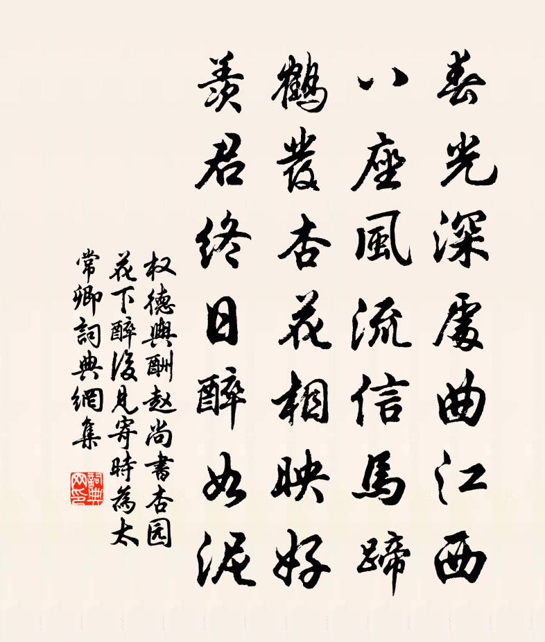 詩詞名句歷史字典書法欣賞書法字典國語詞典說文解字康熙字典古漢語字典標 題 作 者 詩 句 酬趙尚書杏園花下醉後見寄(時為太常卿)作者:權德輿 朝代:唐代原文春光深處曲江西,八座風流信馬蹄。鶴髮杏花相映好,羨君終日醉如泥。詩詞問答問:《酬趙尚書杏園花下醉後見寄(時為太常卿)》的作者是誰?答:權德輿問:該詩寫於哪個朝代?答:唐代問:該詩是什麼體裁?答:七絕書法欣賞酬趙尚書杏園花下醉後見寄(時為太常卿)書法作品注釋全唐詩:卷321-30詩詞推薦至節出謁回二絕洪咨夔〔宋代〕巧笑聲搖六博盆,纖纖人在綠窗根。隔紗想見春風面,雲滑金釵欲溜痕。送張端明赴召周必大〔宋代〕歸粟招提刻翠珉,羯胡稽首嘆名臣。今聞整轡登廊廟,應有先聲讋四隣。歌元豐五首王安石〔宋代〕放歌扶杖出前林,遙和豐年擊壤音。曾侍土階知帝力,曲中時有譽堯心。術士醴陵丁夢榮將之舂陵有贈樂雷發〔宋代〕綠水池邊舊釣磯,何時歸去濯征衣。千年城郭應無恙,只怕風塵老令威。江城子·密州出獵蘇軾〔宋代〕老夫聊發少年狂,左牽黃,右擎蒼,錦帽貂裘,千騎卷平岡。為報傾城隨太守,親射虎,看孫郎。酒酣胸膽尚開張大酺 [永昌元年]杜審言〔唐代〕聖后乘乾日,皇明御歷辰。紫宮初啟坐,蒼璧正臨春。雷雨垂膏澤,金錢贈下人。詔酺歡賞遍,交泰睹惟新。楊公濟以詩索粉紙依韻和答強至〔宋代〕春雲落紙不歸天,就把霜刀翦四邊。欲送草堂還縮手,少陵慣見浣花箋。和王適寒夜讀書蘇轍〔宋代〕久從市井役,百事廢不理。感君讀書篇,惜此寒夜晷。殷勤附燈燭,黽勉就圖史。逡巡揖虞夏,汗漫馳劉李。斯文元夕無月丘逢甲〔清代〕滿城燈市盪春煙,寶月沉沉隔海天。看到六鰲仙有淚,神山淪沒已三年!三年此夕月無光,明月多應在故鄉。欲向三高堂俞灝〔宋代〕東華車馬日滔滔,始覺三高分外高。吳越衣冠幾春夢,古今身世一秋毫。臨流久立 * 艇,駕月歸來認雪濤。琢句再游登騰王閣曾豐〔宋代〕故閣崢嶸已劫灰,又看新閣上煙煤。斷碑無日不濃墨,古砌新秋猶雜苔。江闊鳥疑飛不過,風輕帆遠趁先開。天高共樂堂陳俊卿〔宋代〕共樂堂前花木深,登臨當暑豁塵襟。紅垂荔子千家熟,翠擁篔簹十畝陰。老退已尋居士服,清歡時伴醉翁吟。憑欄離京留題蔣店姚勉〔宋代〕合門傳旨放朝參,歸覲親庭曉整驂。葵藿丹心猶戀戀,五雲繚繞望宮南。題牛圖戴復古〔宋代〕牡丹花下連宵醉,今日閒看黑牡丹。得此躬耕東海曲,一貧無慮百憂寬。初到連江和林公曄先輩李彌遜〔宋代〕投老身名信陸沉,欲將白髮寄遙岑。賦詩未敢師彭澤。抱瓮真堪友漢陰。江面飛橋夸壯麗,山腰臥石必幽深。公才內機知府郎官再和示教清拔遒美手不能置用韻程公許〔宋代〕新詩後敵鮑參軍,結字歐虞瞠後塵。我亦平生遠俗嗜,與君交似醉陽春。亦佳亭黃之傳〔宋代〕小亭新築亦佳哉,花木無多手自栽。若謂甘棠安敢比,清陰留與後人來。送張無夢歸天台陳既濟〔宋代〕暫到京城住,辭堯返舊廬。身耽泉石樂,心向利名疏。鶴靜來華表,雲間出太虛。錢塘應過日,秋水滿紅蕖。題陶谷朝林山樓帖劉克莊〔宋代〕鸞膠曲子久喧傳,烈祖英明素薄焉。語草探懷周[以下殘缺]南郊慶成歐陽修〔宋代〕祀教民昭孝,天惟德是親。太宮嚴大饗,吉土兆精禋。禮樂三王盛,梯航萬國賓。恩沾群動洽,慶與一陽新。奉冊名句推薦吏不治則亂,農事緩則貧。墨子《墨子·39章 非儒(下)》 探其懷,奪之威。主上用之,若電若雷。韓非及後人《韓非子·揚權》 牆角數枝梅,凌寒獨自開。王安石《梅花 / 梅》 棲鴉流水點秋光,愛此蕭疏樹幾行。紀映淮《詠秋柳》 何當共剪西窗燭,卻話巴山夜雨時。李商隱《夜雨寄北》 欲寄書如天遠,難銷夜似年長。賀鑄《西江月·攜手看花深徑》 如絲苣甲飣春盤,韭葉金黃雪未乾。張耒《春日·如絲苣甲飣春盤》 讀書破萬卷,下筆如有神。杜甫《奉贈韋左丞丈二十二韻》 胭脂雪瘦熏沉水,翡翠盤高走夜光。蔡松年《鷓鴣天·賞荷》 欲為君盡君道,欲為臣盡臣道孟子《孟子·離婁章句上·第二節》
