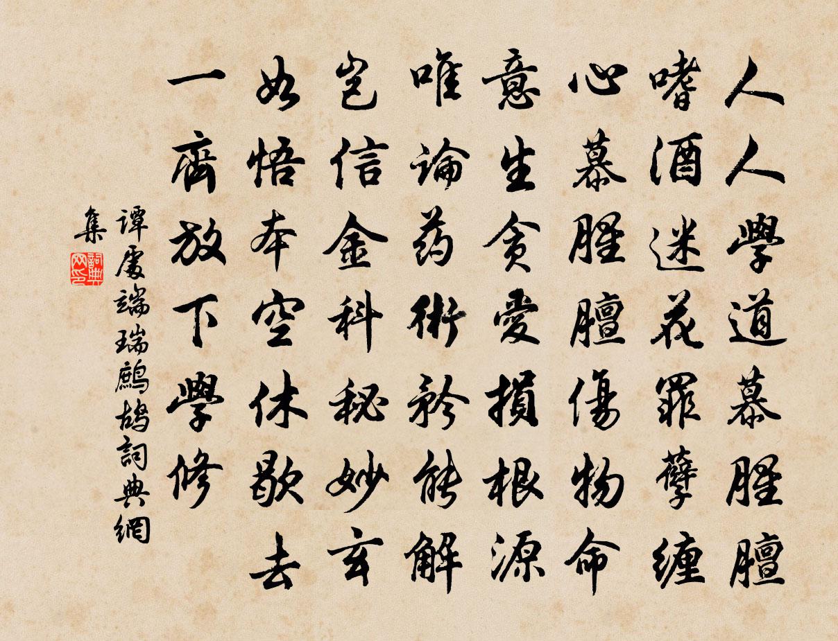 詩詞名句歷史字典書法欣賞書法字典國語詞典說文解字康熙字典古漢語字典標 題 作 者 詩 句 瑞鷓鴣作者:譚處端 朝代:元代瑞鷓鴣原文人人學道慕腥膻。嗜酒迷花罪孽纏。心慕腥膻傷物命,意生貪愛損根源。唯論藥術矜能解,豈信金科秘妙玄。如悟本空休歇去,一齊放下學修詩詞問答問:瑞鷓鴣的作者是誰?答:譚處端問:瑞鷓鴣寫於哪個朝代?答:元代問:瑞鷓鴣是什麼體裁?答:詞譚處端瑞鷓鴣書法欣賞瑞鷓鴣書法作品詩詞推薦回回僧陳某〔宋代〕秋風響耳環,古怪聚人看。赤腳行霜地,腥身禮月壇。儋齋猶買肉,掛帛不遮寒。亦有西來意,相逢欲語難。南池雜詠五首溪雲皎然〔唐代〕舒捲意何窮,縈流復帶空。有形不累物,無跡去隨風。莫怪長相逐,飄然與我同。彌勒大士二月八生釋普濟〔宋代〕契此老翁無記性,都忘生月與生辰。春風桃李能多事,特地年年說向人。洞仙歌令/洞仙歌歐陽修〔宋代〕樓前亂草,是離人方寸。倚遍闌乾意無盡。羅巾掩,宿粉殘眉、香未減,人與天涯共遠。香閨知人否,長是厭厭,朴公棹牽牛其奇余亦作姜夔〔宋代〕不見青青繞竹生,西風籬落抱枯藤。道人一任空花過,愁殺山陰覓句僧。余丞相薨長沙姜特立〔宋代〕一紀歸來老薜蘿,須知養壽是蹉跎。幾人盡向忙中去,我比時賢日已多。山雉白居易〔唐代〕五步一啄草,十步一飲水。適性遂其生,時哉山樑雉。樑上無罾繳,梁下無鷹鸇。雌雄與群雛,皆得終天年。嗟嗟太平州十詠亭李覯〔宋代〕客游無日暫開顏,姑孰溪邊偶得閒。風景直疑圖畫出,古今都似夢魂間。恆溫罪逆休重問,謝傳英靈已不遠。深美佛日常長老請贊釋鹹傑〔宋代〕赤手全提,金圈栗棘。跳出三要三玄,破盪佛祖窠窟。試問人何神通,盡力吐露不出。咄咄,佛日長老,與麽拈出端午帖子詞皇帝合汪應辰〔宋代〕永日雖祥郁,風生殿閣涼。聖心非獨樂,均施遍多方。題羅源驛用馬駒甫韻李洪〔宋代〕今年小稔遍山村,白叟黃童笑倚門。老瓦為樽賽田祖,石田多稼慶曾孫。次韻和王鞏六首蘇軾〔宋代〕平生我亦輕餘子,晚歲人誰念此翁。巧語屢曾遭薏苡,廋詞聊復托芎藭。子還可責同元亮,妻卻差賢勝敬通。若問直講周歲宋祁〔宋代〕本自悲涼葆發多,何緣末至濫中阿。馬肝不食非論味,狗曲猶輕枉為歌。舊學空疏緣病廢,壯情牢落伴年過。終然侍宴華光殿曲水奉勑為皇太子作詩 四謝朓〔南北朝〕能官民秀。利建天跗。枵鶉列野。營絳分區。論思帝則。獻納宸樞。麟趾方定。鵜翼誰濡。家本譙人得奉祠毫州喜賦述懷曹彥約〔宋代〕宦遊隨喜亦云聊,筆橐何官晚見招。已定秦關無論蜀,好恢湯毫卻歸譙。發邊廬岳雲千嶺,雨後湖莊水一腰。買得偈傾一百三十三首釋法薰〔宋代〕有祖以來,無人奈何。德山臨濟,特地干戈。水到滄溟不是波。讀程仁秀才淳熙秦稿項安世〔宋代〕孝星當寧髦英,志士擔簦入鳳城。直犯睟顏知主聖,敢譏當路見時清。文章不用施花草,情實都如告父兄。老向窮【雙調】壽陽曲_酒可紅雙頰張弘范〔元代〕酒可紅雙頰,愁能白二毛,對樽前盡可開懷抱。天若有情天亦老,且休教少年知道。紅顏褪,綠鬢凋,酒席上漸疏懷嵩樓新開南軒與郡僚小飲歐陽修〔宋代〕繞郭雲煙匝幾重,昔人曾此感懷嵩。霜林落後山爭出,野菊開時酒正濃。解帶西風飄畫角,倚欄斜日照青松。會須晚春歸山居題窗前竹 / 暮春歸故山草堂詩錢起〔唐代〕谷口春殘黃鳥稀,辛夷花盡杏花飛。始憐幽竹山窗下,不改清陰待我歸。名句推薦城小賊不屠,人貧傷可憐元結《賊退示官吏》 夜市賣菱藕,春船載綺羅。杜荀鶴《送人游吳》 須作一生拚,盡君今日歡。牛嶠《菩薩蠻·玉爐冰簟鴛鴦錦》 兵出無名,事故不成班固《漢書·紀·高帝紀上》 是數人之齒,而以為富。墨子《墨子·48章 公孟》 雲霞出海曙,梅柳渡江春。杜審言《和晉陵陸丞早春遊望》 不怕慢,只怕站。佚名《增廣賢文·下集》 野雲萬里無城郭,雨雪紛紛連大漠。李頎《古從軍行》 工欲善其事,必先利其器。佚名《論語七則》 水墨畫疏窗,孤影淡瀟湘。納蘭性德《木蘭花慢·立秋夜雨送梁汾南行》