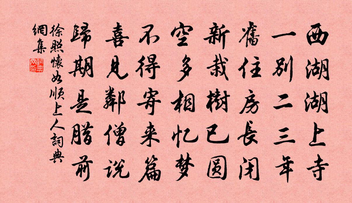 詩詞名句歷史字典書法欣賞書法字典國語詞典說文解字康熙字典古漢語字典標 題 作 者 詩 句 懷如順上人作者:徐照 朝代:宋代懷如順上人原文西湖湖上寺,一別二三年。舊住房長閉,新栽樹已圓。空多相憶夢,不得寄來篇。喜見鄰僧說,歸期是臘前。詩詞問答問:懷如順上人的作者是誰?答:徐照問:懷如順上人寫於哪個朝代?答:宋代徐照懷如順上人書法欣賞懷如順上人書法作品詩詞推薦嘉泰二年恭上太皇太后尊號八首佚名〔宋代〕麟趾裹蹄,我寶斯刻。碝磩采緻,載備斯冊。眉壽萬年,詒謀燕翼。於赫湯孫,克綿永福。臨江仙(簪花屢墮戲作)辛棄疾〔宋代〕鼓子花開春爛漫,荒園無限思量。今朝拄杖過西鄉。急呼桃葉渡,為看牡丹忙。不管昨宵風雨橫,依然紅紫成行。至鄂期年以饟事不給於詩己亥夏五廿有八日始岳珂〔宋代〕葭葦延緣舞以旌,白頭吹浪又相迎。攀轅亦作留行計,莫道馮夷不世情。減字木蘭花佚名〔宋代〕超然遠覽。是我輩人方具眼。默想江湖。何處山川略得如。涼秋最勝。萬頃芙蕖蓋明鏡。更乞清詩。要見胸中一吐陳伯明建讀書堂於內戰都岩蓋縉縉雲最勝特處葉適〔宋代〕東萊龍川師道起,一時話言猶在耳。我輩勤苦常刳心,後生懶惰自迷已。聞君相取黃帝鄉,石簡中間穩上樑。搜翹題方竹杖松根枕二首張鎡〔宋代〕鬱郁凌寒色,來宜此地蟠。解衣輕盾日,假蓋得秦官。香宿風微墮,青留雨未乾。通宵岩側夢,根竅手藏丹。送容州程員外端州吳員外徐鉉〔唐代〕士生秉道義,公論重才名。美哉雙白壁,高價等連城。昔在南國時,折桂嘗抗衡。今為北朝客,通籍齊振纓。連鑣與胡西園黃榦〔宋代〕白露下百草,玄雲翳崇岡。遊子暮何之,倏若孤雁翔。朝髮長沙渚,夕息湘山陽。飛鳴念儔侶,慷慨增悲傷。故人減字木蘭花 示眾尹志平〔元代〕年深學道。雖未通靈神氣好。學道年深。萬景叢中無物侵。同流聽勸。薄利虛名深可遠。聽勸同流。放下諸緣宜速天命陳杰〔宋代〕至狂而聖至愚神,天命何私與物均。萬水各涵全體月,千花同受十分春。一家路透家家路,一性仁通性性仁。秦漢榜曲朱慶餘〔唐代〕荷花明滅水煙空,惆悵來時徑不同。欲到前洲堪入處,鴛鴦飛出碧流中。南堂對竹懷江十鄰幾韓維〔宋代〕端居無所聊,稍復治文字。南堂冬日明,窗戶暖可喜。圖書羅滿前,意覽不由次。聊收靜者趣,以亂憂人思。亭亭酬樂天春寄微之元稹〔唐代〕鸚心明黠雀幽蒙,何事相將盡入籠。君避海鯨驚浪里,我隨巴蟒瘴煙中。千山塞路音書絕,兩地知春曆日同。一樹過陳湯卿溪堂方岳〔宋代〕手葺溪堂旋補茅,好山帶郭轉林梢。與君共有吟詩痴,月下柴門下厭敲。寄紫閣無名頭陀(自新羅來)姚合〔唐代〕峭行得如如,誰分聖與愚。不眠知夢妄,無號免人呼。山海禪皆遍,華夷佛豈殊。何因接師話,清淨在斯須。次韻周子車喜雨高斯得〔宋代〕平生報國無才力,日夜只祈天雨粟。詎今歲事少差池,怪證誰雲一而足。入春郡國多苦旱,起瞻四方何蹙蹙。陋邦永安塔陳岩〔宋代〕心不能安總是魔,亭亭孤塔鎮岩阿。倘無佛力三千行,奈此丘蛇井鼠何。溫泉強至〔宋代〕壯觀悲涼舊跡存,蓮花泉暖至今溫。行人莫罪無情水,一笑華清是禍源。無庵釋紹曇〔宋代〕銷鑠玄微萬境空,銜花百鳥謾尋蹤。莫教頑坐精靈窟,門鎖亂雲千萬里。江上艾性夫〔宋代〕江上春肥衰草生,林梢煙暖乳鳩鳴。青山與我一面雅,白鳥令人雙眼明。雲淨有時看雨泣,水平無處覓溪聲。折芳名句推薦風急桃花也似愁,點點飛紅雨。如晦《楚天遙過清江引·有意送春歸》 日照香爐生紫煙,遙看瀑布掛前川。李白《望廬山瀑布》 暗教愁損蘭成,可憐夜夜關情張炎《清平樂·候蛩淒斷》 士有妒友,則賢交不親;君有妒臣,則賢人不至。荀子《荀子·大略》 天不老,情難絕。張先《千秋歲·數聲鶗鴂》 鵲橋波里出,龍車霄外飛。任希古《和長孫秘監七夕》 人生有酒須當醉,一滴何曾到九泉。高翥《清明日對酒》 道之不行也,我知之矣:知者過之;愚者不及也。道之不明也,我知之矣:賢者過之;不肖者不及也。子思《中庸·第四章》 碧雲天,黃葉地,秋色連波,波上寒煙翠。范仲淹《蘇幕遮·懷舊》 八年十二月,五日雪紛紛。白居易《村居苦寒》