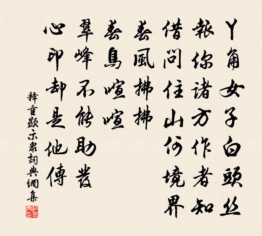 詩詞名句歷史字典書法欣賞書法字典國語詞典說文解字康熙字典古漢語字典標 題 作 者 詩 句 示眾作者:釋重顯 朝代:宋代示眾原文丫角女子白頭絲,報你諸方作者知。借問住山何境界,春風拂拂,春鳥喧喧。翠峰不能助發,心印卻是他傳。詩詞問答問:示眾的作者是誰?答:釋重顯問:示眾寫於哪個朝代?答:宋代釋重顯示眾書法欣賞示眾書法作品詩詞推薦嘉禾百詠三過堂張堯同〔宋代〕題詩三過此,坡老昔時曾。悟得成禪指,來為打睡僧。用折樞韻呈李丞相二首張元乾〔宋代〕莫問蒲萄出月支,不緣瓜棗訪安期。輕紅滿地人慵掃,空翠霑衣雨足時。松蔭晴泉聽落澗,蟬嘶晚吹助裁詩。公乎感秋五首楊萬里〔宋代〕隤照趣夕黯,孤燈啟宵明。老夫倦欲睡,似醉復如醒。寸心無寸恨,坦如江海清。秋蛩何為者,四面作怨聲。悽惻偈頌一百五十首釋心月〔宋代〕最初機,末後句。有準繩,沒規矩。豈可錯承當,豈可錯分付。無雜釋妙倫〔宋代〕平常用處黑漫漫,十二時中沒兩般。大小趙州噇飯漢,斧頭返被蛀蟲鑽。法駕導引(壽治中)劉辰翁〔宋代〕蟠桃熟,蟠桃熟,一熟一千年。比似相公正年少,朱顏綠鬢錦蟬連。肉色更光鮮。西江好,西江好,春雨碧黏天。次韻受益九日方回〔宋代〕歸歟豈少舊林塘,何用痡瘏陟彼岡。白髮轉添吾輩老,黃花不減去年香。每嫌佳節多風雨,猶喜炎陬緩雪霜。典盡謾題陳宓〔宋代〕胸襟但貯五千卷,意慮曾無分寸私。嘆老嗟卑真淺士,古人心事有誰知。和答劉習之見贈王文孫〔宋代〕先天奧學果何傅,造化機緘存闔闢。精微惝恍入神范,天地謂可俄而測。奧從二畫抉秘蘊,乾元庶物因首出。陽推鶴鳴亭絕句四首辛棄疾〔宋代〕飽飯閒遊繞小溪,卻將往事細尋思。有時思到難思處,拍碎闌乾人不知。朝中措楊無咎〔宋代〕杯盤狼藉燭參差。欲去未容辭。春雪看飛金碾,香雲旋涌花瓷。雍容四座,矜誇一品,重聽新詞。歸路清風生腋,留別天寧永慶乾明金鑾四老陳與義〔宋代〕我生能幾何,兩腳疲世故。忽破巴丘夢,還尋邵陽路。窮鄉得四老,足以慰遲暮。勝事遠公蓮,深心懶殘芋。本是法駕導引趙文〔宋代〕公度我,公度我,我是漢銅仙。惜我玉龍為觳觫,為公鋤雨種芝田。留眼看千年。偈頌一百三十六首釋惟一〔宋代〕一月復一月,此月又過五。兩輪日月何奔忙,百年彈指如虛度。物不遷,遷知否。不是佛,亦非祖。流不不腐,戶送溫庭筠尉方城紀唐夫〔唐代〕何事明時泣玉頻,長安不見杏園春。鳳凰詔下雖沾命,鸚鵡才高卻累身。且盡綠醽銷積恨,莫辭黃綬拂行塵。方城鷓鴣天范成大〔宋代〕仗下儀客筆下文。天風駕鶴住仙真。榴花三日迎端午,蕉葉千春紀誕辰。經圀志,立朝身。暫煩高手活吳民。明朝驀山溪王哲〔元代〕公尋做作,認取烏兔。上下要衝和,更左右、交加龍虎。搬傳大藥,須是入紅爐,成鍛鍊,變銀霜,一朵金花聚。初至郡界劉兼〔唐代〕嘉陵江畔接榮川,兩畔旌旗下瀨船。郡印已分炎瘴地,朝衣猶惹御爐煙。蓮塘小飲香隨艇,月榭高吟水壓天。錦字別南海賓化侯詩江總〔隋代〕石關通越井。蒲澗邇靈洲。此地何遼敻。羣英逐遠遊。高才袁彥伯。令譽許文休。悠焉值君子。復此映芳猷。崤函浪淘沙 賦芍藥王旭〔元代〕春去牡丹空。誰繼芳*。彩雲香散畫闌風。喚起詩人供一笑,絕艷難逢。題品斷腸中。心事誰同。千年溱洧自流東名句推薦幼而學者,如日出之光;老而學者,如秉獨夜行,猶賢乎瞑目而無見者也。顏之推《顏氏家訓·勉學篇》 詩成自寫紅葉,和恨寄東流。晏幾道《訴衷情·憑觴靜憶去年秋》 明月黃河夜,寒沙似戰場。李流芳《黃河夜泊》 想子胥今夜見嫦娥,沉冤雪。史達祖《滿江紅·中秋夜潮》 尋尋覓覓,冷冷清清,淒悽慘慘戚戚。李清照《聲聲慢·尋尋覓覓》 盤心清露如鉛水,又一夜、西風吹折。張炎《疏影·詠荷葉》 記當日、門掩梨花,翦燈深夜語。史達祖《綺羅香·詠春雨》 只恐夜深花睡去,故燒高燭照紅妝。蘇軾《海棠》 血染紅箋,淚題錦句。西湖豈憶相思苦。劉將孫《踏莎行·閒遊》 微雨過,小荷翻。榴花開欲然。蘇軾《阮郎歸·初夏》
