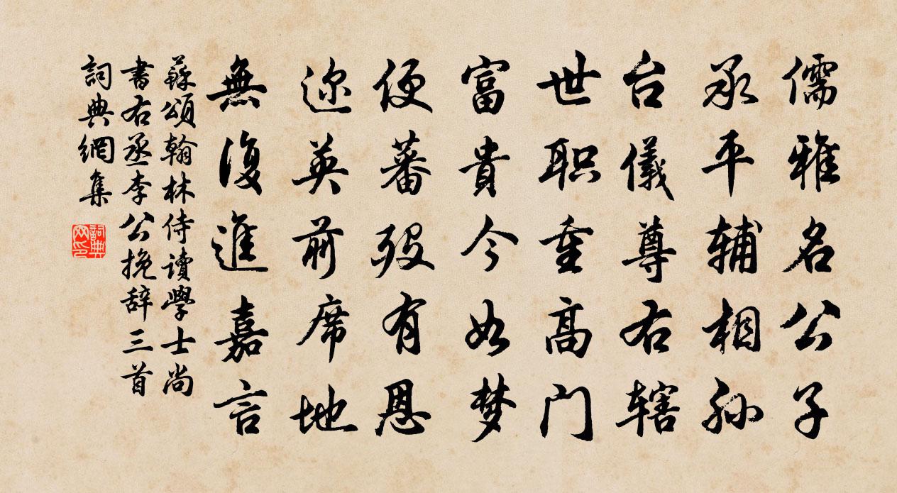 詩詞名句歷史字典書法欣賞書法字典國語詞典說文解字康熙字典古漢語字典標 題 作 者 詩 句 翰林侍讀學士尚書右丞李公輓辭三首作者:蘇頌 朝代:宋代原文儒雅名公子,承平輔相孫。台儀尊右轄,世職重高門。富貴今如夢,便蕃歿有恩。邇英前席地,無復進嘉言。詩詞問答問:《翰林侍讀學士尚書右丞李公輓辭三首》的作者是誰?答:蘇頌問:該詩寫於哪個朝代?答:宋代書法欣賞翰林侍讀學士尚書右丞李公輓辭三首書法作品詩詞推薦臨終作鄭俠〔宋代〕似此平生只藉天,還如過鳥在雲邊。如今身畔渾無物,贏得虛堂一枕眠。鄭子產廟宋祁〔宋代〕不知東里叟,遺蹟但堪尋。語愛東家淚,論交季子心。故墳猶有石,遺鼎遂無金。謬政為邦久,千秋謝所欽。自廣黃文雷〔宋代〕今古紛分孰控摶,太平方寸豁憂端。後千年去人何似,外九州來天更寬。風雨南山飛霹壢,江湖北斗掛闌乾。要知擬寒山拾得二十首王安石〔宋代〕我曾為牛馬,見草豆歡喜。又曾為女人,歡喜見男子。我若真是我,祗合長如此。若好惡不定,應知為物使。堂堂寄題吳介夫專壑七詠負閒劉學箕〔宋代〕鐘鼎本玩世,富貴徒苦人。何似天地間,蕭然一閒身。次韻譚彥成學士早春五首李彌遜〔宋代〕十二樓台白玉成,雲車翻日上觚稜。太平何許同民樂,天闕雙龍護一燈。游武夷作棹歌呈晦翁十首辛棄疾〔宋代〕千丈攙天翠壁高,定誰狡獪插遺樵。神仙萬里乘風去,更度槎枒個樣橋。上留田行陸機〔魏晉〕嗟行人之藹藹。駿馬陟原風馳。輕舟泛川雷邁。寒往暑來相尋。零雪霏霏集宇。悲風徘徊入襟。歲華冉冉方除。我頌古八首釋雲〔宋代〕一片銀蟾掛碧天,清光冷照鳳樓前。九重玉戶深深閉,爭見扶疏桂影圓。和仙詩友鶴吟何夢桂〔宋代〕當年只鶴揚州去,羽衣虹裳滅煙霧。千年華表不歸來,來時忘卻邯鄲路。短篷月白起酸風,天陰鬼哭戰場空。黃昏餞周伯壽得枝字項安世〔宋代〕分原內只界,世系出蒼姬。修貢長沙國,文章似楚辭。堵牆看獻賦,旗影照題詩。晝日三千字,春風第一枝。相公上嚴廉訪十首熊禾〔宋代〕春秋得忠臣,炎紹猶有述。至今十七篇,末學或不識。乾淳有大儒,奏請非不力。一時欠良遇,志士重嗟惜。雪觀顧夫人哀詩二首劉克莊〔宋代〕吾母尤高潔,夫人亦步趨。書窗共殘燭,禪幾對團蒲。不愧顧家婦,能存趙氏孤。郎君奉鸞誥,聊足報親劬。詩思十首方回〔宋代〕老子持公論,評詩眾勿驚。更無雙子美,止有一淵明。響接東坡和,肩隨太白名。吾嘗圖畫像,釋菜四先生。菱溪大石歐陽修〔宋代〕新霜夜落秋水淺,有石露出寒溪垠。苔昏土蝕禽鳥啄,出沒溪水秋復春。溪邊老翁生長見,疑我來視何殷勤。愛之題段吉先小景三首晁補之〔宋代〕碧天無際日悠悠,風靜沙平不見洲。彭浪磯邊亦如此,危峰獨木系扁舟。寄周內翰趙蕃〔宋代〕一自春風辱報書,後來安否定何如。江山我敢涪翁後,事業公真六一餘。百年半途過九十,千間大廈豈無廬。不知頌古三十二首釋明辯〔宋代〕試問人間有底忙,好將春事報春光。直饒日日花前醉,一季都來九十場。夢中和觴字韻黃庭堅〔宋代〕天教兄弟各異方,不使新年對舉觴。作雲作雨手翻覆,得馬失馬心清涼。何處胡椒八百斛,誰家金釵十二行。一邱送化主釋崇岳〔宋代〕敗壞多年笤箒樁,等閒拈起定宗綱。這些標格天然別,不比諸方孟八郎。名句推薦輕解羅裳,獨上蘭舟。李清照《一剪梅·紅藕香殘玉簟秋》 清水出芙蓉,天然去雕飾。李白《經亂離後天恩流夜郎憶舊遊書懷贈江夏韋太守良宰》 市恩不如報德之為厚,要譽不如逃名之為適,矯情不如直節之為真。陳繼儒《小窗幽記·集醒篇》 啼鶯舞燕,小橋流水飛紅。白樸《天淨沙·春》 明月幾時有?把酒問青天。蘇軾《水調歌頭·丙辰中秋》 相望試登高,心隨雁飛滅。孟浩然《秋登蘭山寄張五》 晴煙漠漠柳毿毿,不那離情酒半酣。韋莊《古離別》 南山與秋色,氣勢兩相高。杜牧《長安秋望》 親履艱難者知下情,備經險易者達物偽。范曄《後漢書·列傳·張衡列傳》 恰同學少年,風華正茂;書生意氣,揮斥方遒。 * 《沁園春·長沙》