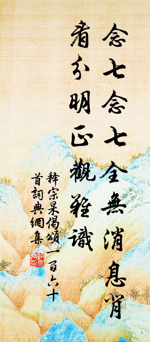 詩詞名句歷史字典書法欣賞書法字典國語詞典說文解字康熙字典古漢語字典標 題 作 者 詩 句 偈頌一百六十首作者:釋宗杲 朝代:宋代偈頌一百六十首原文念七念七,全無訊息。背看分明,正觀難識。詩詞問答問:偈頌一百六十首的作者是誰?答:釋宗杲問:偈頌一百六十首寫於哪個朝代?答:宋代釋宗杲偈頌一百六十首書法欣賞偈頌一百六十首書法作品詩詞推薦送塵老歸舊房徐照〔宋代〕數間茅屋殘山外,片石崚嶒樹影交,給假兩旬秋易盡,相尋一舍地非遙。盆栽怪木緣能畫,池養嘉魚不入庖。聞道次韻烹茶四首傅察〔宋代〕吏隱從人號懶仙,一甌常及日高眠。要令萬卷澆胸次,便覺三山到眼前。客至不須樽有酒,家貧肯厭空無煙。清泉送僧歸富春鄭巢〔唐代〕憶過僧禪處,遙山抱竹門。古房關蘚色,秋徑掃潮痕。石淨聞泉落,沙寒見鶴翻。終當從此望,更與道人言。頌古二十四首釋宗演〔宋代〕凡聖體真,猶存見隔。見存即凡,情亡即佛。蝃蝀佚名〔先秦〕蝃蝀在東,莫之敢指。女子有行,遠父母兄弟。朝隮於西,崇朝其雨。女子有行,遠兄弟父母。乃如之人也,懷婚玉樓春謝逸〔宋代〕箇中懷抱誰排遣。惻惻輕寒風剪剪。細絲梅蕊晚香濃,爭似柳梢春色淺。嬌叱道字歌聲軟。醉後微渦回笑魘。更無郡以閔雨勞民曹顏若春有禱於仰山塔誠念感格程公許〔宋代〕鵲尾爐香半未灰,古潭瞥地撼風雷。腳踏車陟降固勞止,萬壑喧豗亦壯哉。高廩正須端策驗,應門已報送詩來。憂時丁未仲春思鄉味會之樂簡寄董伯虎曾豐〔宋代〕天下清明節,江南筍蕨天。亂生無事種,爭賣不論錢。帶醋香醒鼻,和糟味滑咽。季鷹蓴菜念,徒更雜魚鮮。從軍行二首顧況〔唐代〕弭節結徒侶,速征赴龍城。單于近突圍,烽燧屢夜驚。長弓挽滿月,劍華霜雪明。遠道百草殞,峭覺寒風生。風寒送胡邦衡之新州貶所王庭珪〔宋代〕大廈元非一木支,欲將獨力拄傾危。痴兒不了公家事,男子要為天下奇。當日奸諛皆膽落,平生忠義只心知。端能翛然王安石〔宋代〕翛然三月閉柴荊,綠葉陰陰忽滿城。自是老年遊興少,春風何處不堪。挽李中甫使君孫應時〔宋代〕赫赫中興佐,英風想大門。得交人物懿,喜見典刑存。拱立嚴諸父,躬行表後昆。世家今萬石,一代合推尊。楚妃嘆五首曹勛〔宋代〕霜滿虛庭月滿樓,羅帷珠箔閉清秋。鑪香菸斷添銀燭,誰道更深睡去休。戀繡衾(或送肉色牡丹同賦)劉辰翁〔宋代〕困如宿酒猶未銷。滿華堂、羞見目招。忽折向、西鄰去,教旁人、看上馬嬌。肉色似花難可得,但花如、肉色妖嬈寄贈洛下達三藏魏野〔宋代〕曾攜缽錫到靈山,古寺歸來洛水邊。新譯經文傳北闕,舊遊詩句在西天。爐中香想諸方施,籠里燈應數世傳。別有謝景叔惠冬筍雍酥水梨三物黃庭堅〔宋代〕玉人憐我長蔬食,走送廚珍自不嘗。秦牛肥膩酥勝雪,漢苑甘泉梨得霜。冰底斲春生筍束,豹文解籜饌寒玉。見他繡帶兒(客路見梅)曾覿〔宋代〕瀟灑隴頭春。取次一枝新。還是東風來也,猶作未歸人。微月淡煙村。謾佇立、惆悵黃昏。暮寒香細,疏英幾點,仁宗皇帝濃風二字御書贊岳珂〔宋代〕維聖肆筆根於天,神蹤合作皆自然。勁腴華實無以偏,春秋雖富力已全。天禧資善環琦園,隻字落紙時爭傳。煌煌一落索朱敦儒〔宋代〕慣被好花留住。蝶飛鶯語。少年場上醉鄉中,容易放、春歸去。今日江南春暮。朱顏何處。莫將愁緒比飛花,花有塞上曲陸游〔宋代〕金鼓轟轟百里聲,繡旗寶馬照川明。王師仗義從天下,莫道南兵夜斫營。名句推薦君若清路塵,妾若濁水泥;曹植《明月上高樓》 田家幾日閒,耕種從此起。韋應物《觀田家》 天地生君子,君子理天地。荀子《荀子·王制》 漠漠梨花爛漫,紛紛柳絮飛殘。陳允平《紅林擒近·壽詞·滿路花》 此夜星繁河正白,人傳織女牽牛客。沈佺期《七夕曝衣篇》 此地別燕丹,壯士發衝冠。駱賓王《於易水送人 / 於易水送別》 重見金英人未見,相思一夜天涯遠晏幾道《蝶戀花· * 開時傷聚散》 出師一表真名世,千載誰堪伯仲間!陸游《書憤五首·其一》 福輕乎羽,莫之知載;禍重乎地,莫之知避。莊子《莊子·內篇·人間世》 明朝萬一西風動,爭向朱顏不耐秋。晏幾道《鷓鴣天·守得蓮開結伴遊》