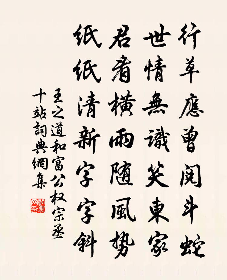 詩詞名句歷史字典書法欣賞書法字典國語詞典說文解字康熙字典古漢語字典標 題 作 者 詩 句 和富公權宗丞十站作者:王之道 朝代:宋代和富公權宗丞十站原文行草應曾閱斗蛇,世情無識笑東家。君看橫雨隨風勢,紙紙清新字字斜。詩詞問答問:和富公權宗丞十站的作者是誰?答:王之道問:和富公權宗丞十站寫於哪個朝代?答:宋代王之道和富公權宗丞十站書法欣賞和富公權宗丞十站書法作品詩詞推薦南浦亭寄所思劉克莊〔宋代〕只是從前瘦病身,官卑活計大清貧。買來晉帖多成贗,吟得唐詩轉逼真。生擬棄家尋劍客,死當移冢近騷人。秋風三婦詞楊維楨〔元代〕大婦善主饋,甘旨出中廚。中婦善調箏,清歌似羅敷。小婦似小喬,中夜讀兵書。丈人不復樂,起起去防胡。齊謳行陸機〔魏晉〕營丘負海曲。沃野爽且平。洪川控河濟。崇山入高冥。東被姑尤側。南界聊攝城。海物錯萬類。陸產尚千名。孟諸壽范潔齋吳泳〔宋代〕青袍朝士走紅塵,公獨紉蘭結佩紳。不事王侯嫌炙手,豈除御史更呈身。寒花秋後看名節,喬木霜中見本真。吾道歐陽郡太君輓歌二首梅堯臣〔宋代〕當時丈人歿,雖少守孤兒。以及成名譽,何嘗厭藿藜。暮年終饗福,陰騭不應欺,莫使碧江上,獨傳陶母碑。題凍雀著色梅花方回〔宋代〕一枝玉蕊艷□□,□雀雙跧凍翼香。誰識綠毛掛么鳳,坡仙詩眼醉南□。白玉樓步虛詞(六之二)范成大〔宋代〕浮黎路,依約太微間。雪色寶階千萬丈,人間遙作白虹看。幢節度高寒。奉陪舅丈祠書彥平主簿兄游慧聚終日小飲上方仲並〔宋代〕迎宵山吐月,不受寸雲吞。看影篩林杪,移尊藉石根。參差明梵剎,一二數煙村。高處僧眠示,攜筇試打門。哭趙公鼎胡銓〔宋代〕以身去國故求死,抗疏犯顏今獨難。閣下特書三姓在,海南惟見兩翁還。一坵孤冢寄瓊島,千古高名屹太山。天地夢與尤木石論史感舊七絕句劉克莊〔宋代〕眼昏漸覺聚螢難,閒殺蘭台舊史官。縱使青藜重下照,細書如蟻不能看。謝王立之送蠟梅五首晁補之〔宋代〕去年不見蠟梅開,準擬新年恰恰來。芳菲意淺姿容淡,憶得素兒如此梅。赴和州於武昌縣再遇毛仙翁十八兄因成一絕劉禹錫〔唐代〕武昌山下蜀江東,重向仙舟見葛洪。又得案前親禮拜,大羅天訣玉函封。醒默居士歌晃逈〔宋代〕白氏先生躭醉吟,銜杯灑翰恣歡心。樽空才盡若為計,釋悶遣懷功未深。愚稱居士名醒默,清思忘言求妙德。習此慶元二年皇后冊寶十三首佚名〔宋代〕光佑晏寧,惠慈燕喜。壽仁病崇,家邦均祉。懿文交舉,台冊嗣美。維億萬年,愛敬惟似。江亭春霽李郢〔唐代〕江蘺漠漠荇田田,江上雲亭霽景鮮。蜀客帆檣背歸燕,楚山花木怨啼鵑。春風掩映千門柳,曉色淒涼萬井煙。金磬和和承制見贈邵雍〔宋代〕自度無能處世間,經冬經夏掩柴關。 * 穩無功上,翠竹叢疏有分閒。猶許艷花酬素志,更將佳酒發酡顏。年來鷓鴣天晏幾道〔宋代〕一醉醒來春又殘,野棠梨雨淚闌乾。玉笙聲里鸞空怨,羅幕香中燕未還。終易散,且長閒,莫教離恨損朱顏。誰堪迓古心觀相師長沙陳杰〔宋代〕夾道歡呼百吏恭,微垣上相鄰藩雄。一星文采低南斗,十乘先驅走祝融。孔子猶須晚封楚,周公只合早歸東。林深新荷葉(再和前韻)辛棄疾〔宋代〕春色如愁,行雲帶雨才歸。春意長閒,遊絲盡日低飛。閒愁幾許,更晚風、特地吹衣。小窗人靜,棋聲似解重圍。和白使君木蘭花徐凝〔唐代〕枝枝轉勢雕弓動,片片搖光玉劍斜。見說木蘭征戍女,不知那作酒邊花。名句推薦五原秋草綠,胡馬一何驕。李白《塞上曲》 多君相門女,學道愛神仙李白《送內尋廬山女道士李騰空二首》 上林苑裡花徒發,細柳營前葉漫新。杜審言《春日京中有懷》 洛陽親友如相問,一片冰心在玉壺。王昌齡《芙蓉樓送辛漸》 天下皆知取之為取,而莫知與之為取。范曄《後漢書·列傳·桓譚馮衍列傳上》 榮以榮人者榮,禍以禍人者禍。來俊臣《羅織經·瓜蔓卷第十二》 弗愛弗利,親子叛父。劉安及其門客《淮南子·繆稱訓》 楓林凋翠,寒雁聲悲。趙長卿《柳梢青·過何郎石見早梅》 縱使有花兼有月,可堪無酒又無人。李商隱《春日寄懷》 機心信隱,交接靡密,庶下者知威而畏也。來俊臣《羅織經·治下卷第三》