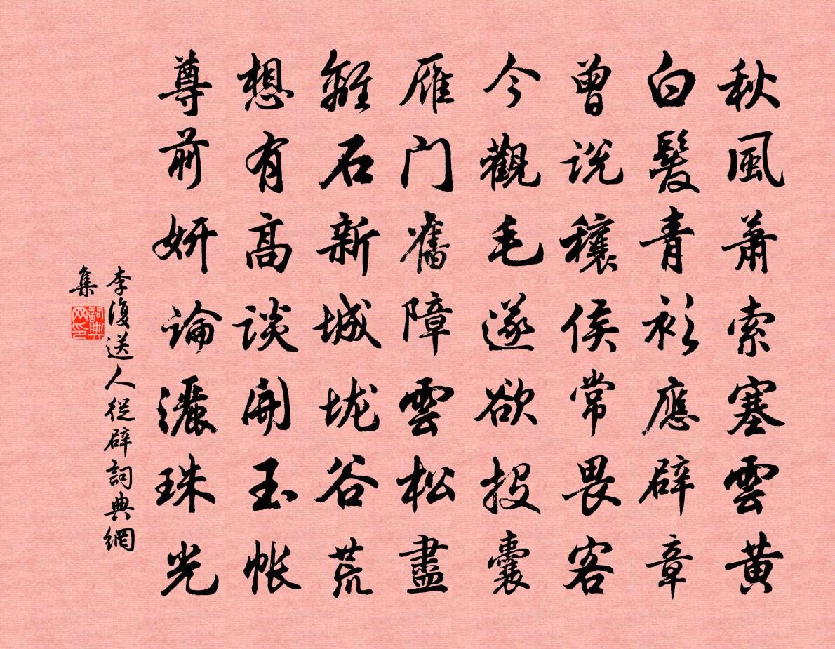 詩詞名句歷史字典書法欣賞書法字典國語詞典說文解字康熙字典古漢語字典標 題 作 者 詩 句 送人從辟作者:李復 朝代:宋代送人從辟原文秋風蕭索塞雲黃,白髮青衫應辟章。曾說穰侯常畏客,今觀毛遂欲投囊。雁門舊障雲松盡,離石新城壠谷荒。想有高談開玉帳,尊前妍論灑珠光。詩詞問答問:送人從辟的作者是誰?答:李復問:送人從辟寫於哪個朝代?答:宋代李復送人從辟書法欣賞送人從辟書法作品詩詞推薦以堰事走永康宿金馬早行見雪山排霄極明麗因程公許〔宋代〕雨響清客夢,雨晴催客行。迥野曉寥落,界天玉崢嶸。銀海眩雙照,瓊鉤對孤明。英雲強吐吞,杲日還晶熒,邂逅雨後至溪上楊萬里〔宋代〕夜雨無端忽曉晴,南溪便長半篙清。斜沖亂石雪霜碎,快瀉深陂金玉聲。慢處回頭縈作漩,急邊眨眼不留行。李成春日移舟章園葛立方〔宋代〕腰懸六印不用求,勝處引人著滄洲。波平草軟鷗鳥下,花明柳暗池亭幽。兩園牛鳴一舟了,三春駟隙千觴酬。肯將六橋閒步薛師傳〔宋代〕出郭青岑近,臨流白鳥飛。笙歌春雨歇,草樹夕陽微。山色邀藜杖,湖風颭葛衣。虛亭林處士,不見鶴來歸。日食罪言姚勉〔宋代〕皇帝十四載,新元紀嘉熙。仲冬戊寅朔,午漏方中時。朔風震丘壑,猛籟號枯枝。黯如商雪天,四野昏垂垂。晝炊拜三川守李紳〔唐代〕恭承寵詔臨伊洛,靜守朝章化比閭。風變市兒驚偃草,雨晴郊藪謬隨車。改張琴瑟移膠柱,止息笙篁辨魯魚。唯有和司法張仲良醉中論詩楊萬里〔宋代〕相過寧嫌數,未行先畏辭。要寬千里別,猶費幾篇詩。意得翻難售,聲希只自奇。此生詩社裡,三折或知醫。寄湯季庸侍郎劉克莊〔宋代〕粵從紫氣度函關,更十年中幾賜環。一葉身輕歸去勇,六丁力盡挽來難。高情常寄紛華外,晚節全觀出處間。別後自詠二首祖無擇〔宋代〕形勝山前感物華,卻乘清興過僧家。樓台消廢無人問,今古傳聞只自嗟。雲擁斷崖埋石筍,泉沖涼雨落金沙。憑君定西番溫庭筠〔唐代〕漢使昔年離別,攀弱柳,折寒梅,上高台。千里玉關春雪,雁來人不來。羌笛一聲愁絕,月裴回。海燕欲飛調羽,失調名佚名〔宋代〕飲盡莫留殘。蔡天啟作中興碑詩且邀同賦王銍〔宋代〕一日宮屠戮三庶宮人,天理宮已盡殺氣宮昏。青宮惴惴二十載,免禍自求黃屋尊。忠臣開除兩京路,未知日月雙懸題惠州羅浮山周敦頤〔宋代〕紅塵白日無間人,況有魚緋擊此身。關上羅浮間送目,浩然心意復吾真。別顏慥下第蔡襄〔宋代〕四上不登第,漂流二十年。依依去國恨,杯酒春風前。將歸郭印〔宋代〕兩載春風客,翩翩憶舊棲。林深喧鳥雀,水暖亂鳧鷖。到處宜傾榼,逢人數杖藜。荷花難負約,飛語報雲溪。宮詞一百首岳珂〔宋代〕鳳儀魚躍更龍拿,傳寶猶矜趙璧瑕。一夜神光照東井,天教景命屬天家。感花吳芾〔宋代〕正欲持杯賞萬紅,卻遭連日雨兼風。種花欲看難如此,可是衰翁賦分窮。寄舊詩與元微之薛濤〔唐代〕詩篇調態人皆有,細膩風光我獨知。月下詠花憐暗淡,雨朝題柳為欹垂。長教碧玉藏深處,總向紅箋寫自隨。老大句高似孫〔宋代〕相次西風吹蟹老,眼前且作鱠殘圖。北山王績〔唐代〕舊知山里絕氛埃,登高日暮心悠哉。子平一去何時返,仲叔長游遂不來。幽蘭獨夜清琴曲,桂樹凌雲濁酒杯。槁項名句推薦烹羊宰牛且為樂,會須一飲三百杯。李白《將進酒》 玉勒雕鞍遊冶處,樓高不見章台路。歐陽修《蝶戀花·庭院深深深幾許》 金玉其外,敗絮其中劉基《賣柑者言》 以三寸之舌,彊於百萬之師。司馬遷《史記·平原君虞卿列傳》 為容不在貌,獨抱孤潔。張炎《疏影·梅影》 衣冠未必皆男子,巾幗如何定婦人?馮夢龍《醒世恆言·卷十》 橫笛和愁聽,斜枝倚病看。崔道融《梅花》 瑤池阿母綺窗開,黃竹歌聲動地哀李商隱《瑤池》 月上柳梢頭,人約黃昏後。歐陽修《生查子·元夕》 萬里浮雲卷碧山,青天中道流孤月。李白《答王十二寒夜獨酌有懷》