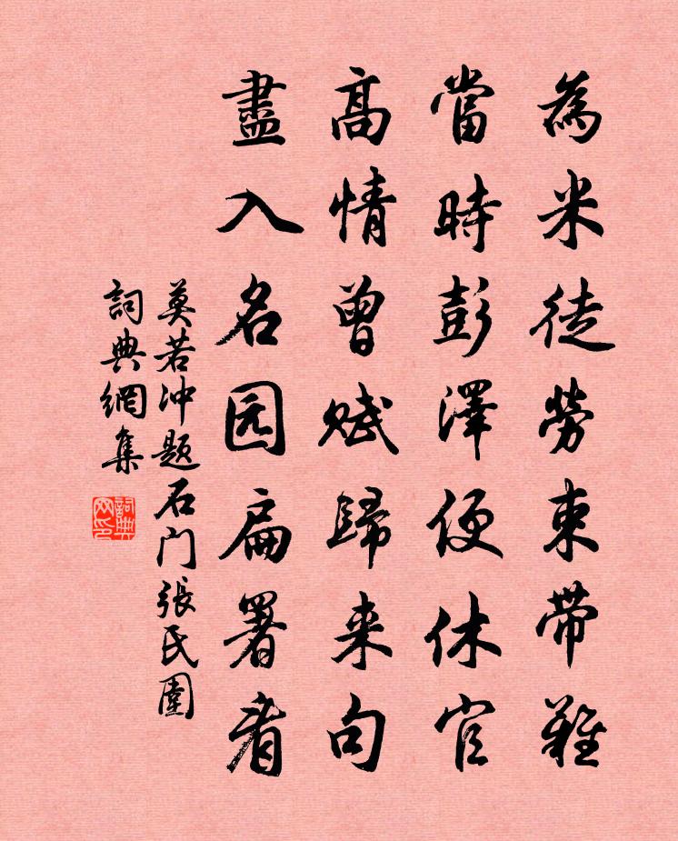 詩詞名句歷史字典書法欣賞書法字典國語詞典說文解字康熙字典古漢語字典標 題 作 者 詩 句 題石門張氏圍作者:莫若沖 朝代:宋代題石門張氏圍原文為米徒勞束帶難,當時彭澤便休官。高情曾賦歸來句,盡入名園扁署看。詩詞問答問:題石門張氏圍的作者是誰?答:莫若沖問:題石門張氏圍寫於哪個朝代?答:宋代莫若沖題石門張氏圍書法欣賞題石門張氏圍書法作品詩詞推薦柳州開元寺夏雨呂本中〔宋代〕風雨瀟瀟似晚秋,鴉歸門掩伴僧幽。雲深不見千岩秀,水漲初聞萬壑流。鍾喚夢回空悵望,人傳書至竟沈浮。面如與客啟明劉筠〔宋代〕秦痔從來易得車,郄枝今比我何如。垂天借喻齊諧志,握火尋盟越絕書。旭日西清雲幄密,朔風南陌葦衣疏。故山烏龍和尚釋重顯〔宋代〕空岩清夜坐,蘚徑積深雪。瞑目思古人,徹曙落殘月。童敲石磬寒,猿掛枯枝折。杳杳無限情,分明向誰說。悲秋陸游〔宋代〕一拋蓑笠雪溪舟,八載梁州復益州。才破繁華海棠夢,又驚搖落井梧秋。曉班無復趨行殿,晚境惟思老寢丘。病肺會稽六月初五日新米入市價減舊以升計之幾十王炎〔宋代〕大侵難宿飽,小熟有晨炊。歲事早如此,人情喜可知。田家甘糶賤,海賈恨來遲。粒粒皆珠玉,無忘餓殍時。松花開竹筍茂喜而詠之裘萬頃〔宋代〕繁花密筍暮春時,妝點園林一段奇。金粉生香風細細,斑衣留潤露垂垂。品高宜入神仙藥,節勁終全冰雪姿。笑彼鷓鴣天向子諲〔宋代〕薌林居士卡築清江,乃楊遵道光祿故居也。昔文安先生之所可,而竹木池館,亦甚似之。其子孫與兩蘇、山谷從游失調名朱淑真〔宋代〕王孫去後無芳草。三月一日趙蕃〔宋代〕粵山深歷備辭勞,雖有故人誰贈袍。歸臥茅齋且休歇,竹風山雨兩蕭騷。龍瑞宮蘇泂〔宋代〕嶂密峰圓不似山,桃花流水做春閒。神仙只在人間世,妄意虛無縹緲間。共城十吟其三曰春郊芳草邵雍〔宋代〕春風必有刀,離腸被君斷。春風既無刀,芳草何人剪。腸斷人復接,草剪益還生。誰人有芳酒,為我高歌傾。鉤弋夫人徐鈞〔宋代〕名門堯母將傳嗣,取鑒呂皇預殺身。燕翼貽謀宜有道,如何知義不知仁。秋夕文宴得遙字皮日休〔唐代〕啼螿衰葉共蕭蕭,文宴無喧夜轉遙。高韻最宜題雪贊,逸才偏稱和雲謠。風吹翠蠟應難刻,月照清香太易消。無限湖西雜感詩釋智圓〔宋代〕直木風摧秋敗蘭,閒觀庭際可長歡。屈原溺水伍員死,孤潔由來獨立難。宿永安方丈書呈東山禪師楊蟠〔宋代〕千年道在高僧傳,未論詩人更有評。曾著文章原大道,獨推性命濟群生。白雲已鎖山間寺,流水空傳世上名。林遠醉蓬萊(和韻)李曾伯〔宋代〕大不逾粟許,飄散人間,直恁清烈。管領芳樽,底事不渠屑。中夜庭前,小山叢畔,韻度從來別。那更今年,留連矮齋雜詠二十首月夜吟華岳〔宋代〕一聲殘角送黃昏,獨倚闌乾空斷魂。竹景掃階塵不動,自挨明月閉柴門。栽松峴楊備〔宋代〕聳壑凌霄色共蒼。森然萬樹約千行。劉郎大廈尋顛覆,應是其間少棟樑。句諶祜〔宋代〕歌舞從兒女,艱難憶父兄。鵲橋仙(七夕)向子諲〔宋代〕澄江如練,遠山橫翠,一段風煙如畫。層樓傑閣倚晴空,疑便是、支磯石下。寶奩瓊鑒,淡勻輕掃,縴手弄妝初罷名句推薦正西望長安,下見江水流。李白《秋浦歌十七首》 過頭飯好吃,過頭話難聽!佚名《增廣賢文·下集》 雙飛燕子幾時回?夾岸桃花蘸水開。徐俯《春遊湖》 牽衣頓足攔道哭,哭聲直上乾雲霄。杜甫《兵車行》 月過十五光明少,人到中年萬事休。佚名《增廣賢文·上集》 洞庭春溜滿,平湖錦帆張。陰鏗《渡青草湖》 師也者,教之以事而喻諸德者也戴聖《禮記·文王世子》 明月如霜,好風如水,清景無限。蘇軾《永遇樂·彭城夜宿燕子樓》 任賢勿貳,去邪勿疑。佚名《尚書·虞書·大禹謨》 花滿河陽,為君羞褪晨妝茜。吳文英《燭影搖紅·賦德清縣圃古紅梅》