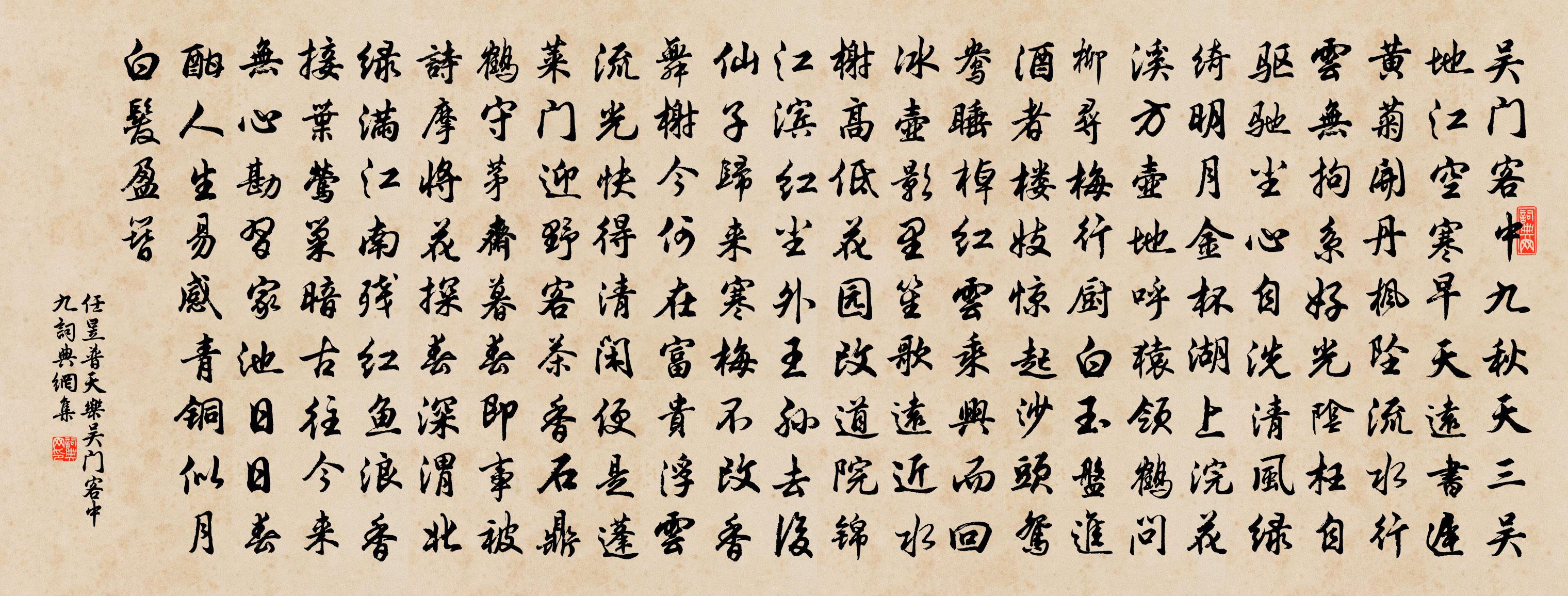 九秋天,三吳地,江空寒早,天遠書遲。黃1/1菊開,丹楓墜。流水行雲無拘系,好光陰枉自驅馳。塵心自洗,清風綠綺,明月金杯。