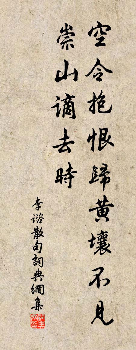 詩詞名句歷史字典書法欣賞書法字典國語詞典說文解字康熙字典古漢語字典標 題 作 者 詩 句 句作者:李諮 朝代:宋代句原文空令抱恨歸黃壤,不見崇山謫去時。詩詞問答問:句的作者是誰?答:李諮問:句寫於哪個朝代?答:宋代李諮句書法欣賞句書法作品詩詞推薦又兩絕蘇頌〔宋代〕江天慘澹物華新,四望漫漫起玉塵。但怪長衢已盈尺,豈知閉戶有高人。壓酒姜特立〔宋代〕酒到劉伶墳,斯人已枯槁。不如營糟丘,吾將此中老。宮詞王仲修〔宋代〕邇英新殿在西廂,新地隆儒過漢唐。講罷賜茶班退後,槐盤龍景下修廊。贈李白杜甫〔唐代〕二年客東都,所歷厭機巧。野人對膻腥,蔬食常不飽。豈無青精飯,使我顏色好。苦乏大藥資,山林跡如掃。李侯句諶祜〔宋代〕隔雲烽火山河舊,列土旌旗雨露深。沁園春佚名〔宋代〕柳眼偷金,梅肌暈玉,春信已催。正淺寒天氣,嫩晴日色,雨收巫峽,菸捲蓬萊。青鳥銜音,彩鸞迎駕,白晝傳呼玉壺冰王季友〔唐代〕玉壺知素結,止水復中澄。堅白能虛受,清寒得自凝。分形同曉鏡,照物掩宵燈。壁映圓光入,人驚爽氣凌。金罍漁父詞(其七)趙構〔宋代〕駭浪吞舟脫巨鱗。結繩為綱也難任。綸乍放,餌初沉。淺釣纖鱗味更深。六月半屢雨方回〔宋代〕甘雨作豐年,尤宜近伏天。水無過大海,旱不救良田。六月茅檐滴,千村飯灶煙。山城秋意早,新粒市香{左禾右琴二首王令〔宋代〕不獨區區操縵間,要期追逐古風還。吾民有慍何當解,學得南風不敢彈。翊善余公輓詩二首李彌遜〔宋代〕白髮歸來一笑同,舊遊長憶魯山東。松楸地接螺江上,兄弟名聯雁塔中。問舍蝸牛聊老□,□書蠆尾不憂窮。清芬答微之見寄(時在郡樓對雪)白居易〔唐代〕可憐風景浙東西,先數餘杭次會稽。禹廟未勝天竺寺,錢湖不羨若耶溪。擺塵野鶴春毛暖,拍水沙鷗濕翅低。更對夜永許月卿〔宋代〕夜永月清甚,雨餘風快哉。月將槐影出,風遣桂香來。風至地自掃,月來雲亦開。三千翰林手,光霽瑩靈台。半醉吟邵雍〔宋代〕半醉上車兒,車兒穩碾歸。輕風迎面處,翠柳拂頭時。意若兼三事,情如擁九麾。這般閒富貴,料得沒人知。要君高斯得〔宋代〕聖人戒要君,春秋罪同弒。推此無上心,將何所不至。近者兇相歸,決烈誰能比。群愚惑其跡,鹹謂給奪志。老夫送蘇迨陳師道〔宋代〕胸中歷歷著千年,筆下源源赴百川。真字飄揚今有種,清談絕倒古無傳。出塵悟解多為路,隨世功名小著鞭。白首鷓鴣天 圍襄陽 案此下原有天淨沙二首,以其張弘范〔元代〕鐵甲珊珊渡漢江。南蠻猶自不歸降。東西勢列千層厚,南北軍屯百萬長。弓扣月,劍磨霜。征鞍遙日下襄陽。鬼門東陽方韶卿惠古意七篇久不得和五月二十六日戴表元〔宋代〕德孤誰願高,氣寒誰願清。斯文鄒魯來,壈坎勞其生。豈無性命憂,艱難愈同情。如何及門士,亦作胡越聲。釋滯梅堯臣〔宋代〕帝在蒼梧妃泣竹,蘇武餐毛海西曲。窮山遠道車折軸,深井渴汲綆不續。我輩於此酒正綠,貴無奈何歡且足。題石橋陳知柔〔宋代〕巨石橫空豈偶然,萬雷奔壑有飛泉。好山雄壓三千界,幽處常棲五百仙。雲際樓台深夜見,雨中鐘鼓隔溪傳。我來名句推薦春色將闌,鶯聲漸老。紅英落盡青梅小。寇準《踏莎行·春色將闌》 馬行無力皆因瘦,人不風流只為貧。佚名《增廣賢文·上集》 不知近水花先發,疑是經冬雪未銷。張謂《早梅》 上馬擊狂胡,下馬草軍書。陸游《觀大散關圖有感》 春色邊城動,客思故鄉來。何遜《邊城思》 送子軍中飲,家書醉里題。岑參《磧西頭送李判官入京》 青出於藍而勝於藍程登吉《幼學瓊林·卷二·師生》 砧杵敲殘深巷月,井梧搖落故園秋。陸游《秋思》 目送征鴻飛杳杳,思隨流水去茫茫。孫光憲《浣溪沙·蓼岸風多橘柚香》 槐葉初勻日氣涼,蔥蔥鼠耳翠成雙。范成大《夏日田園雜興》